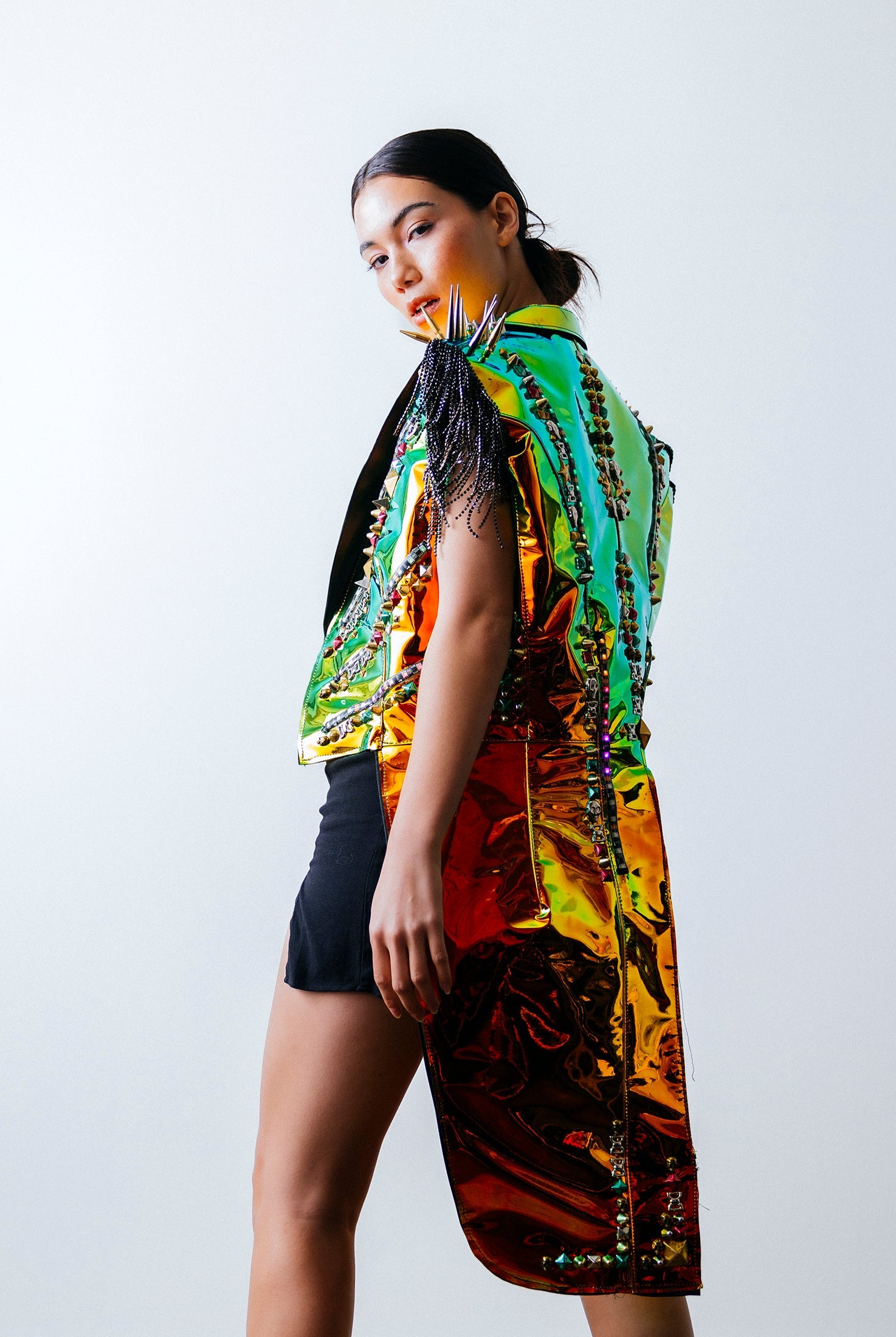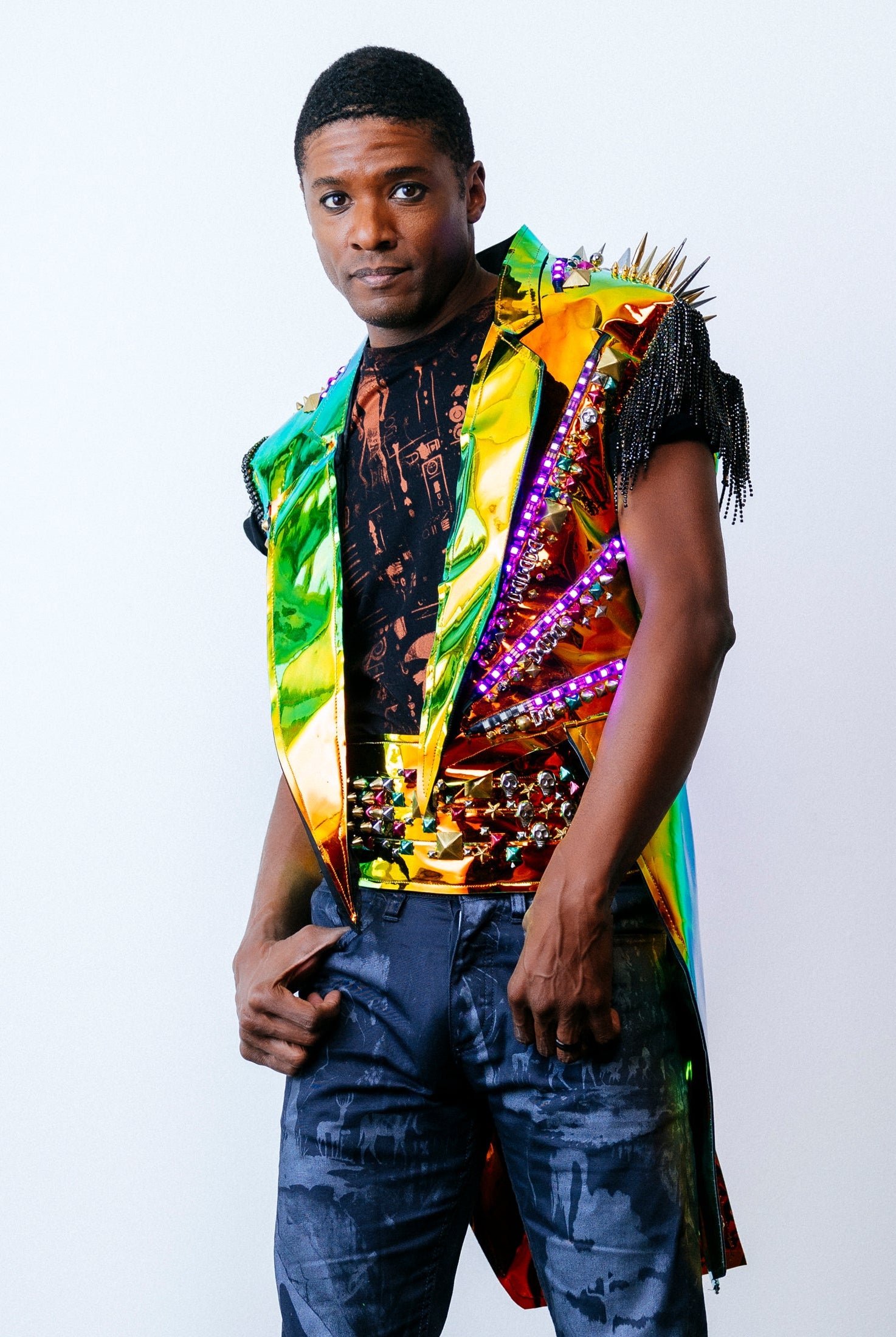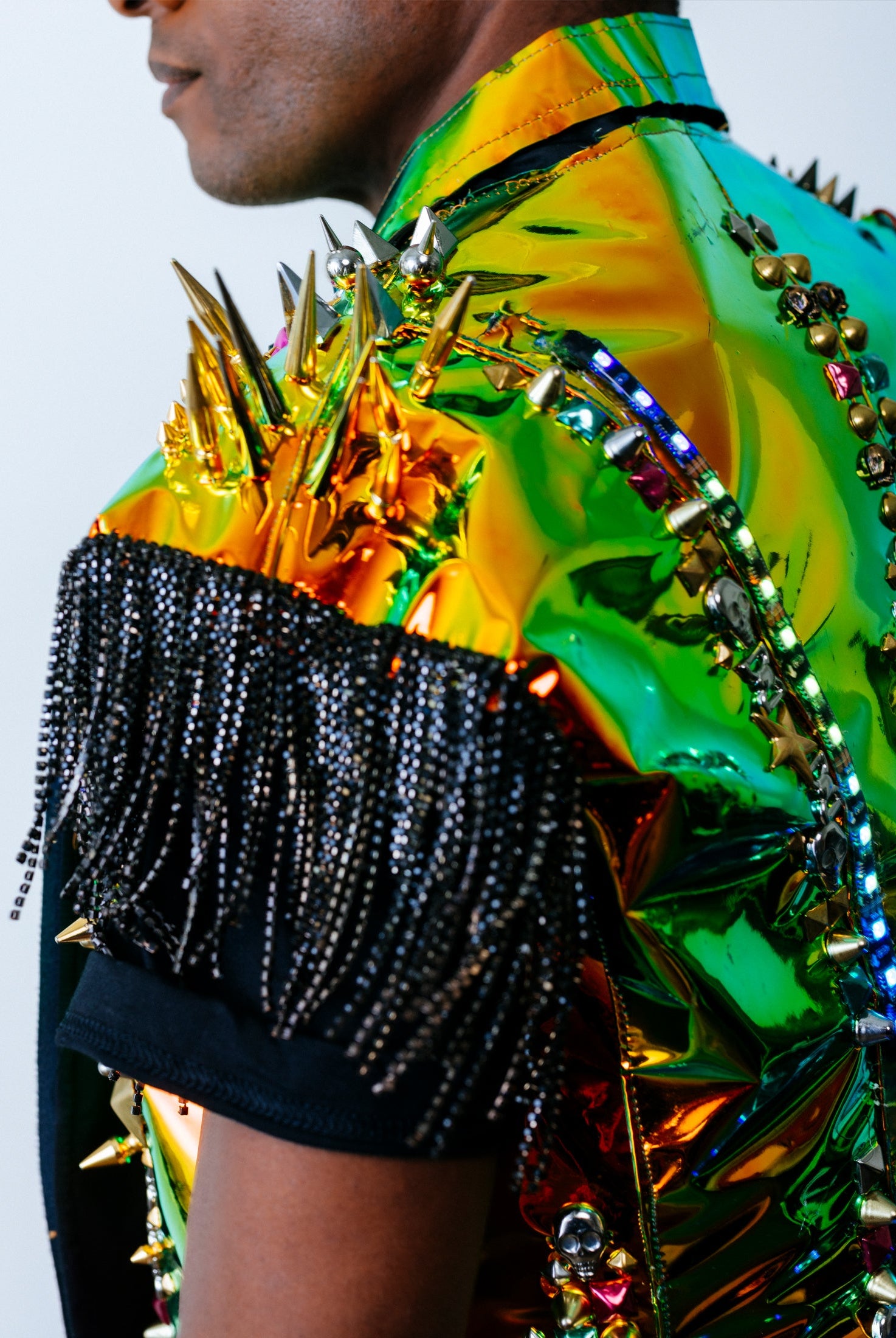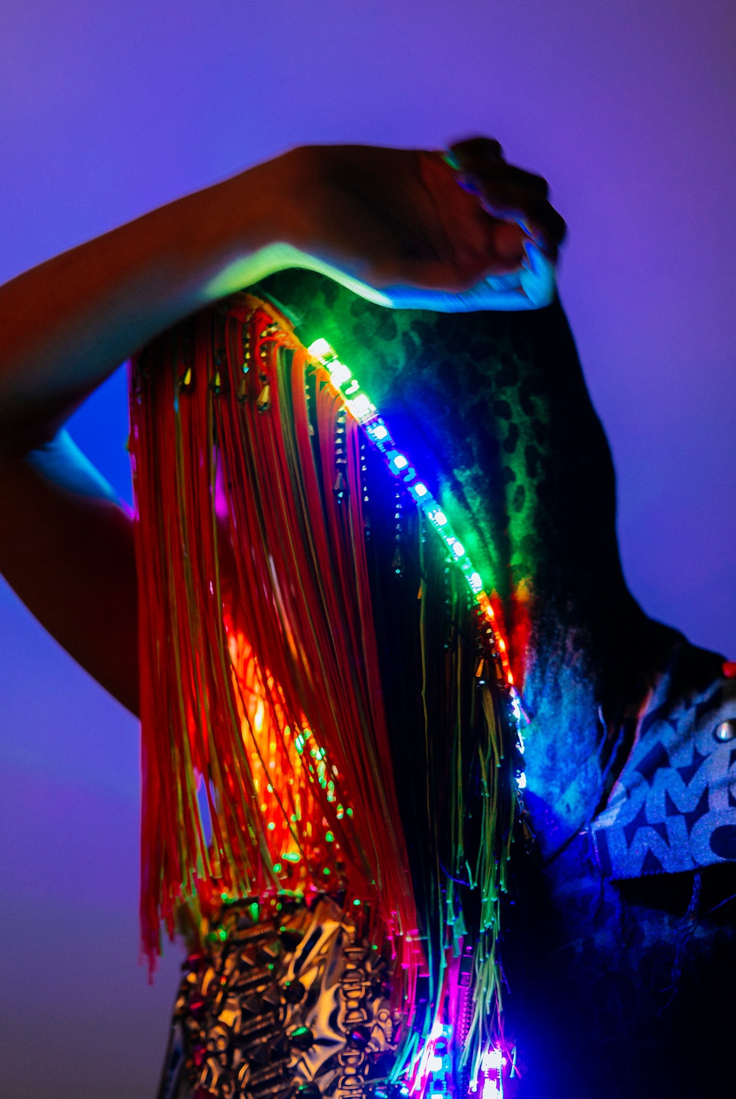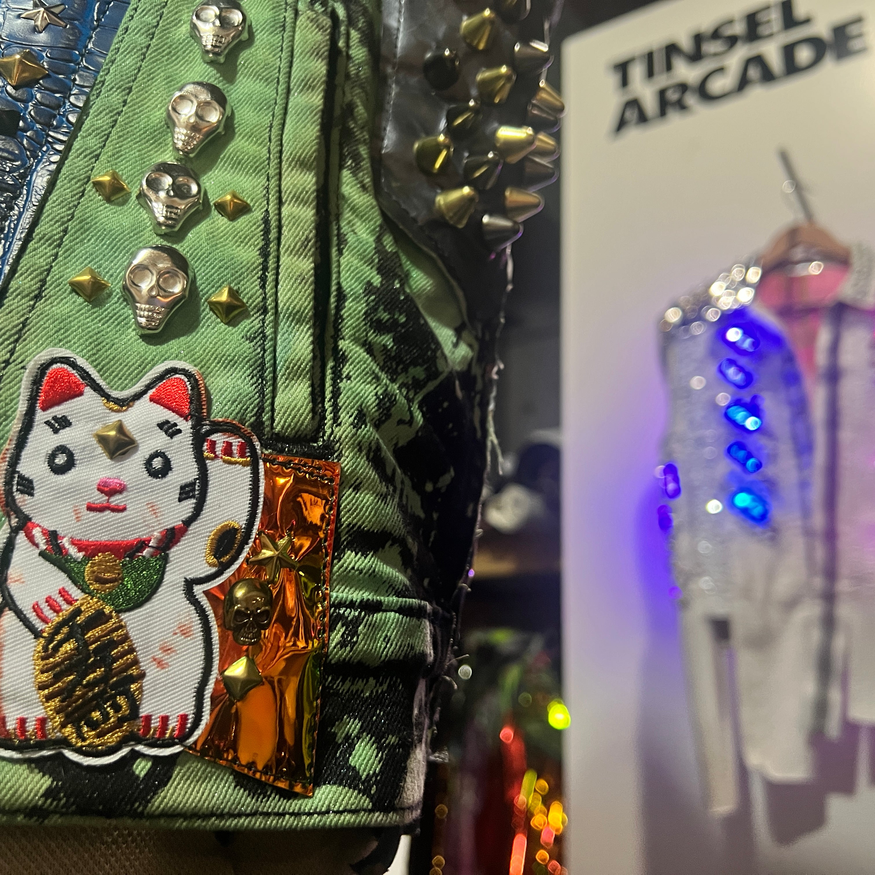 In the Tinsel Arcade, we blend street, formal, and post-modern elements to conjure one-of-a-kind garments by hand. Each is meticulously tailored to be equally dramatic and wearable. With your input, your bespoke garment will reflect you, push you, extend you, and complete you. If more is never enough, you can add LED and reflective overlays with stealth and nonstop modes.