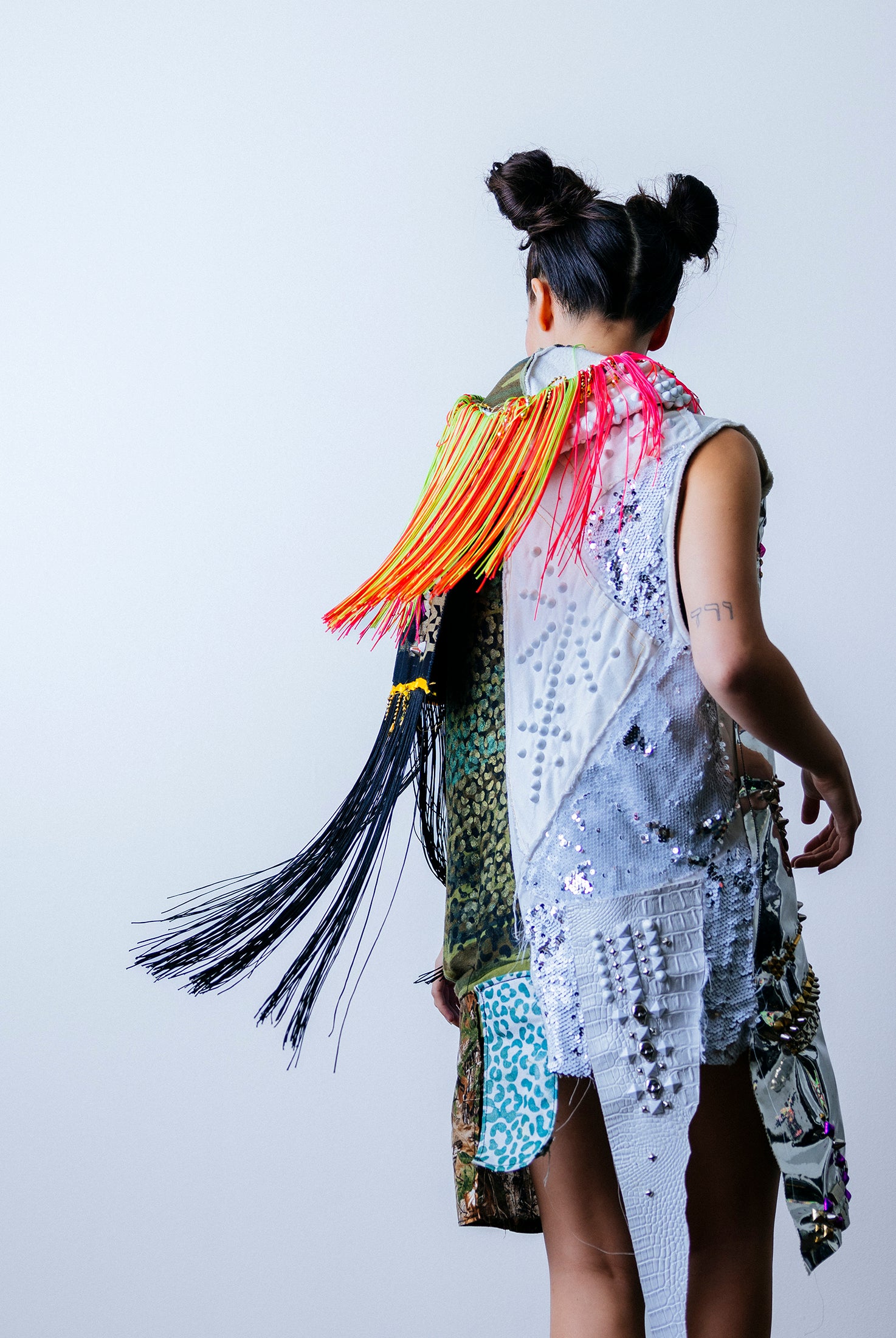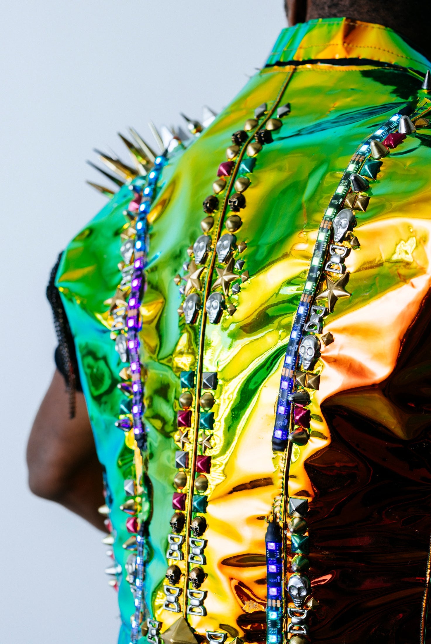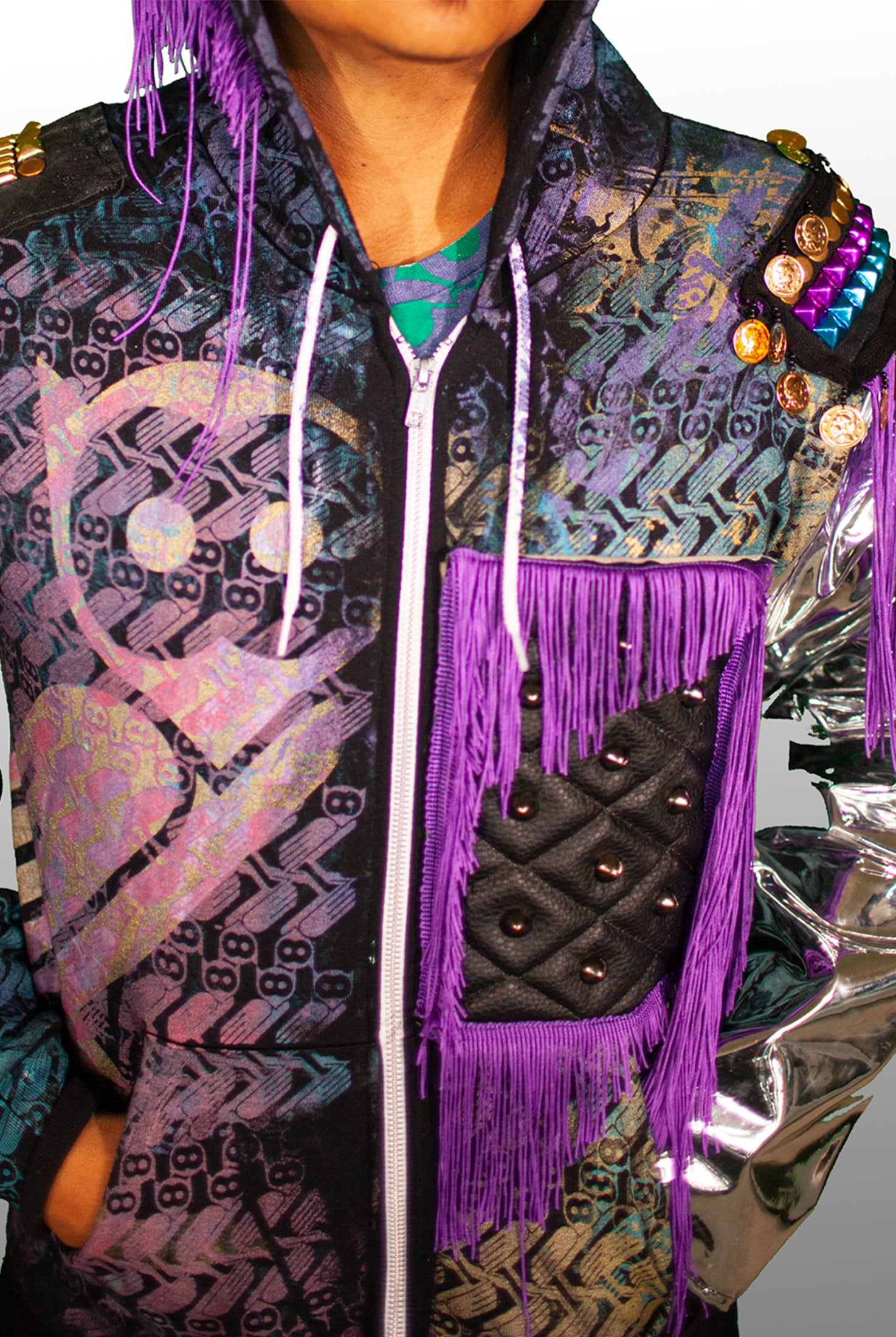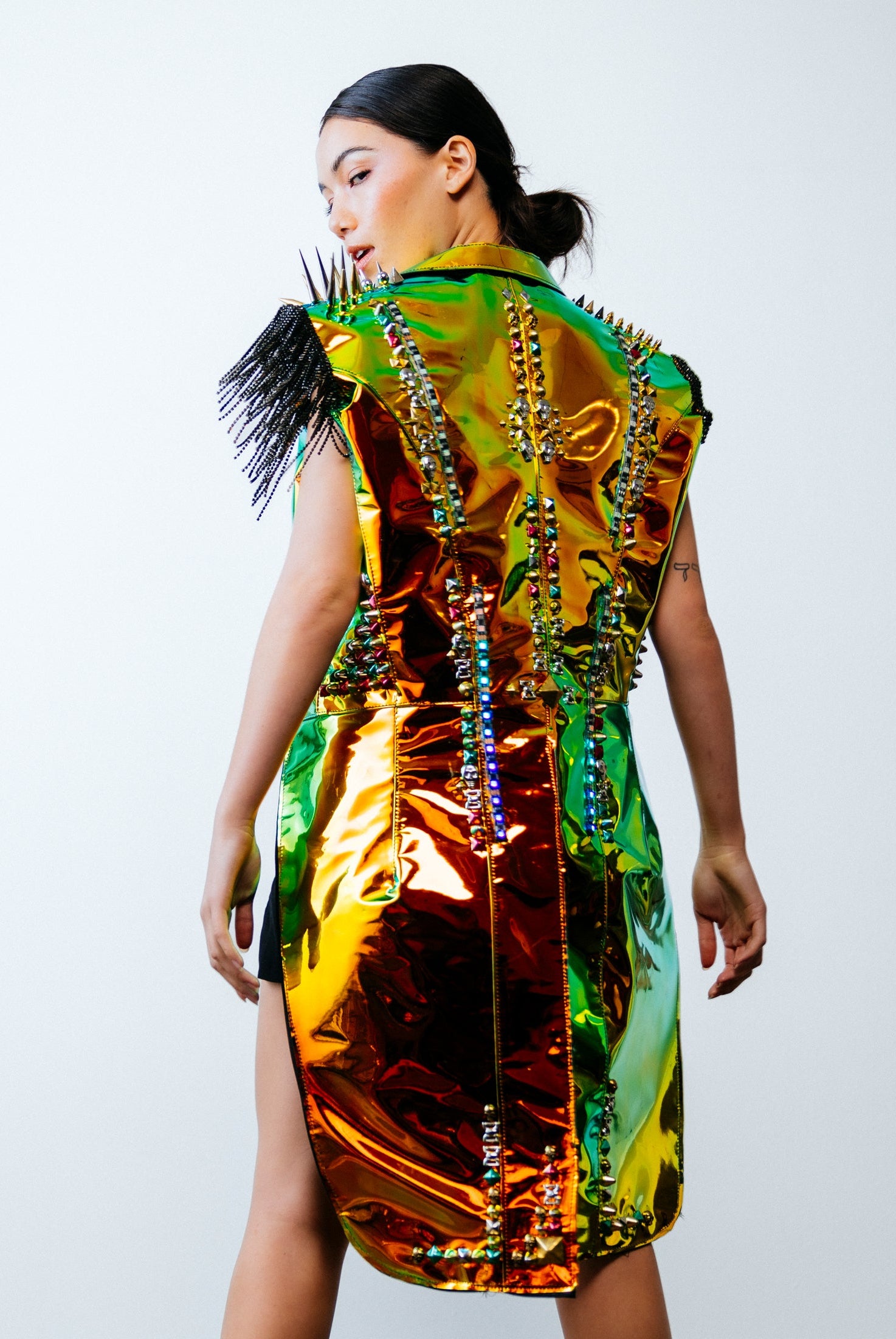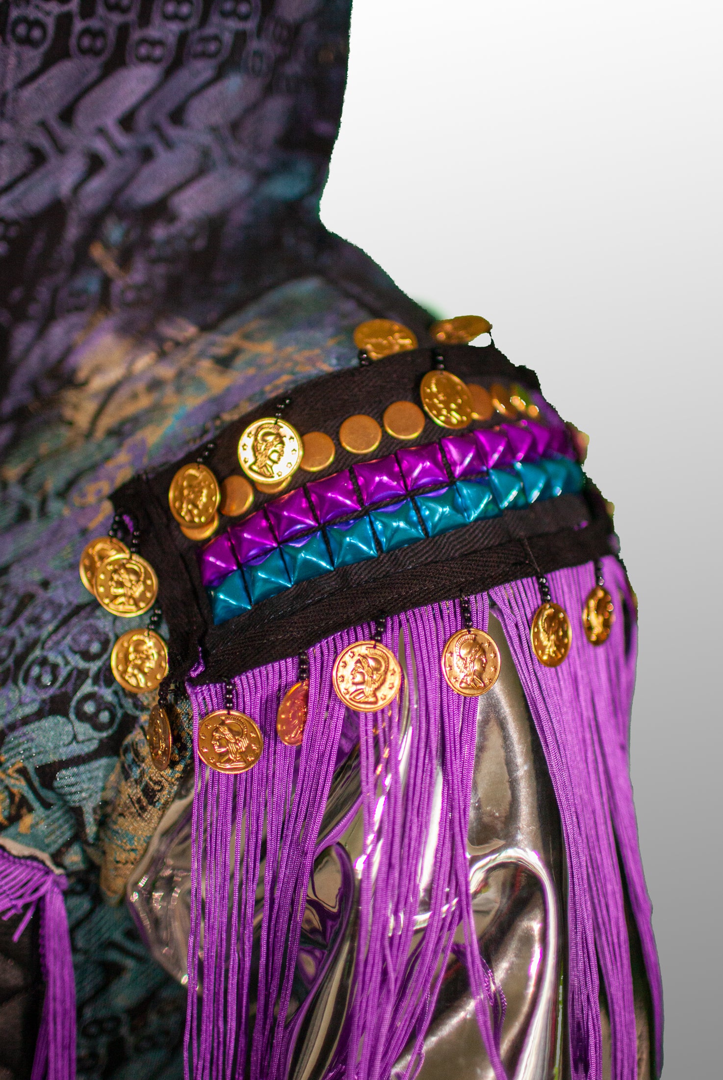 In the Tinsel Arcade, we blend street, formal, and post-modern elements to conjure one-of-a-kind garments by hand. Each is meticulously tailored to be equally dramatic and wearable. With your input, your bespoke garment will reflect you, push you, extend you, and complete you. If more is never enough, you can add LED and reflective overlays with stealth and nonstop modes.
