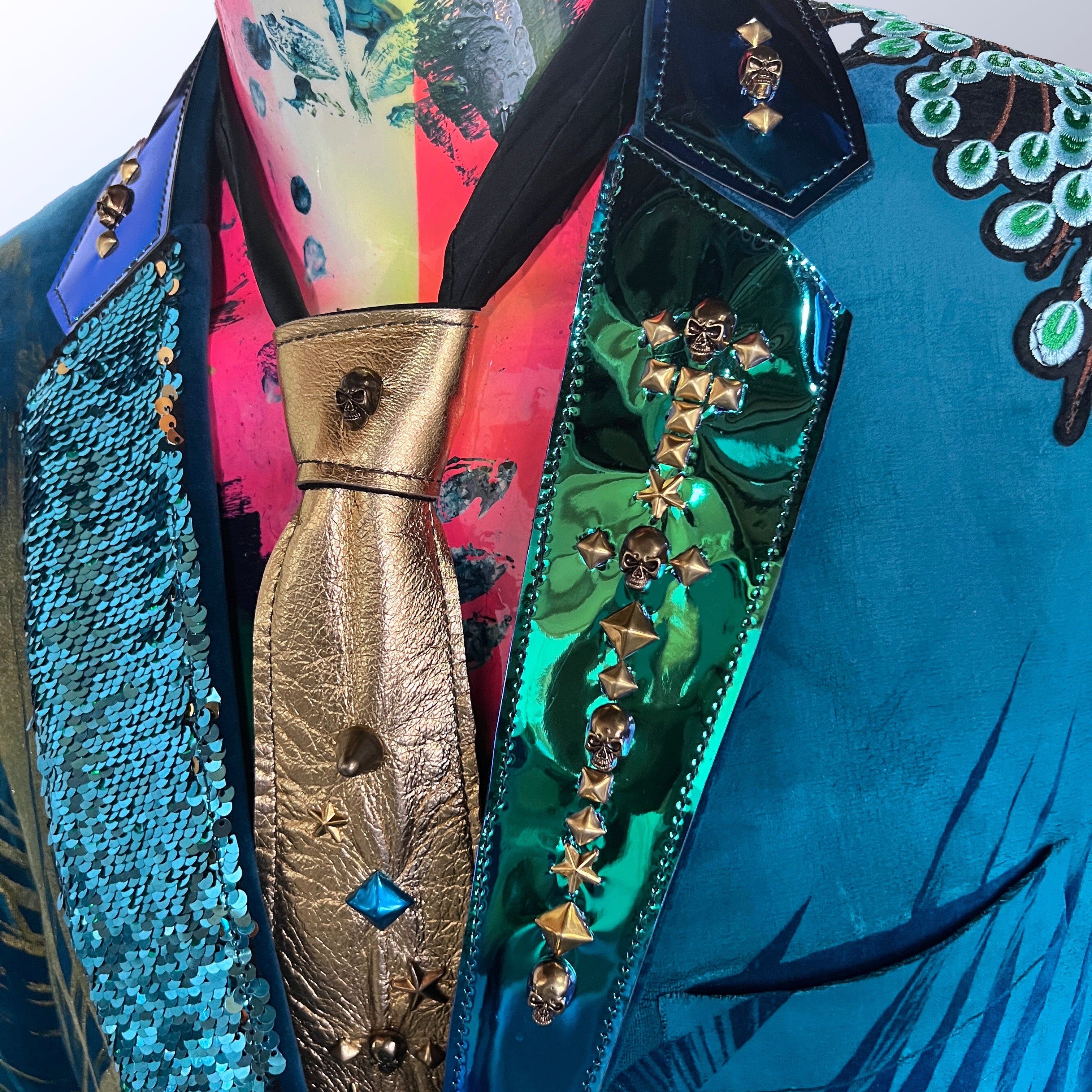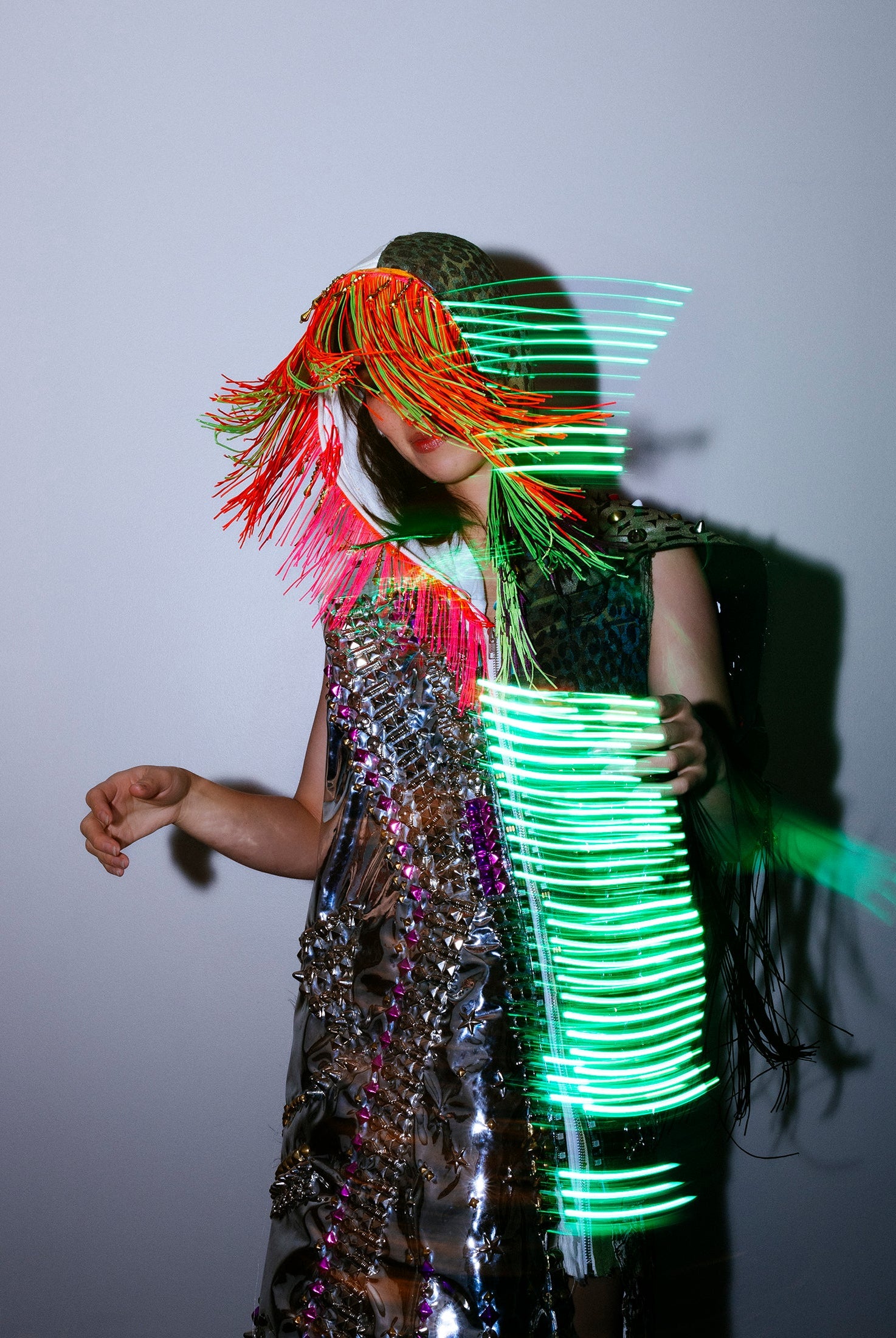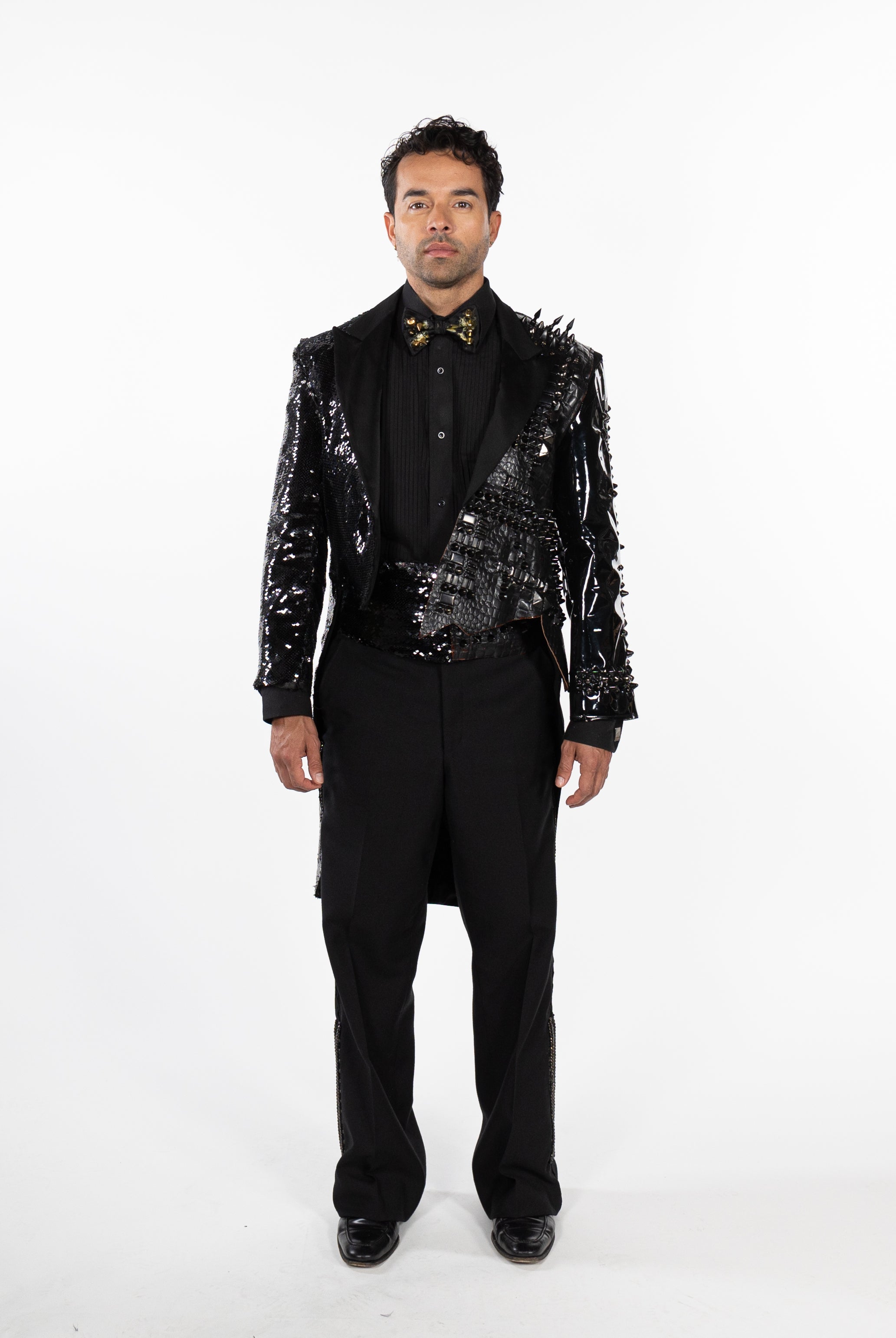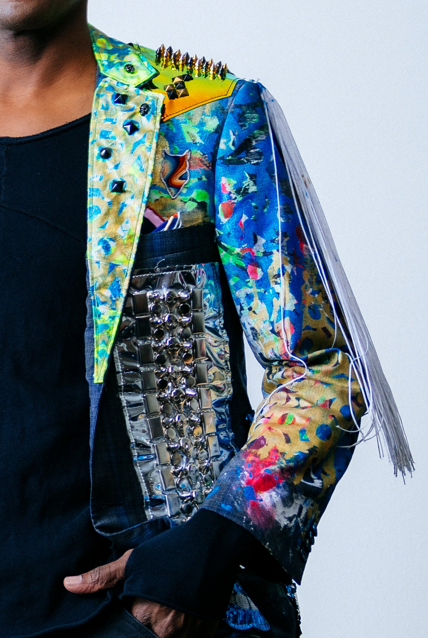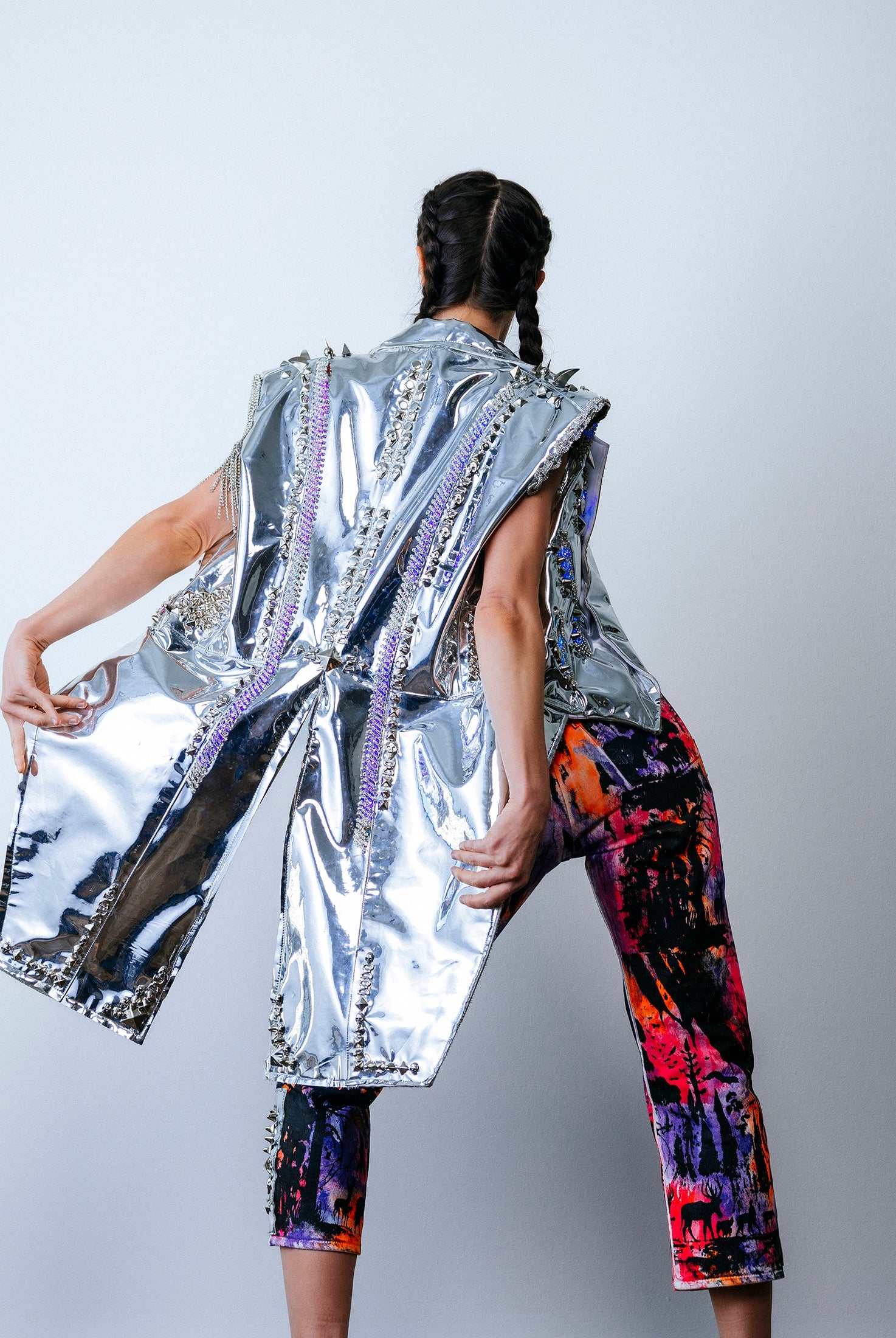 In the Tinsel Arcade, we blend street, formal, and post-modern elements to conjure one-of-a-kind garments by hand. Each is meticulously tailored to be equally dramatic and wearable. With your input, your bespoke garment will reflect you, push you, extend you, and complete you. If more is never enough, you can add LED and reflective overlays with stealth and nonstop modes.