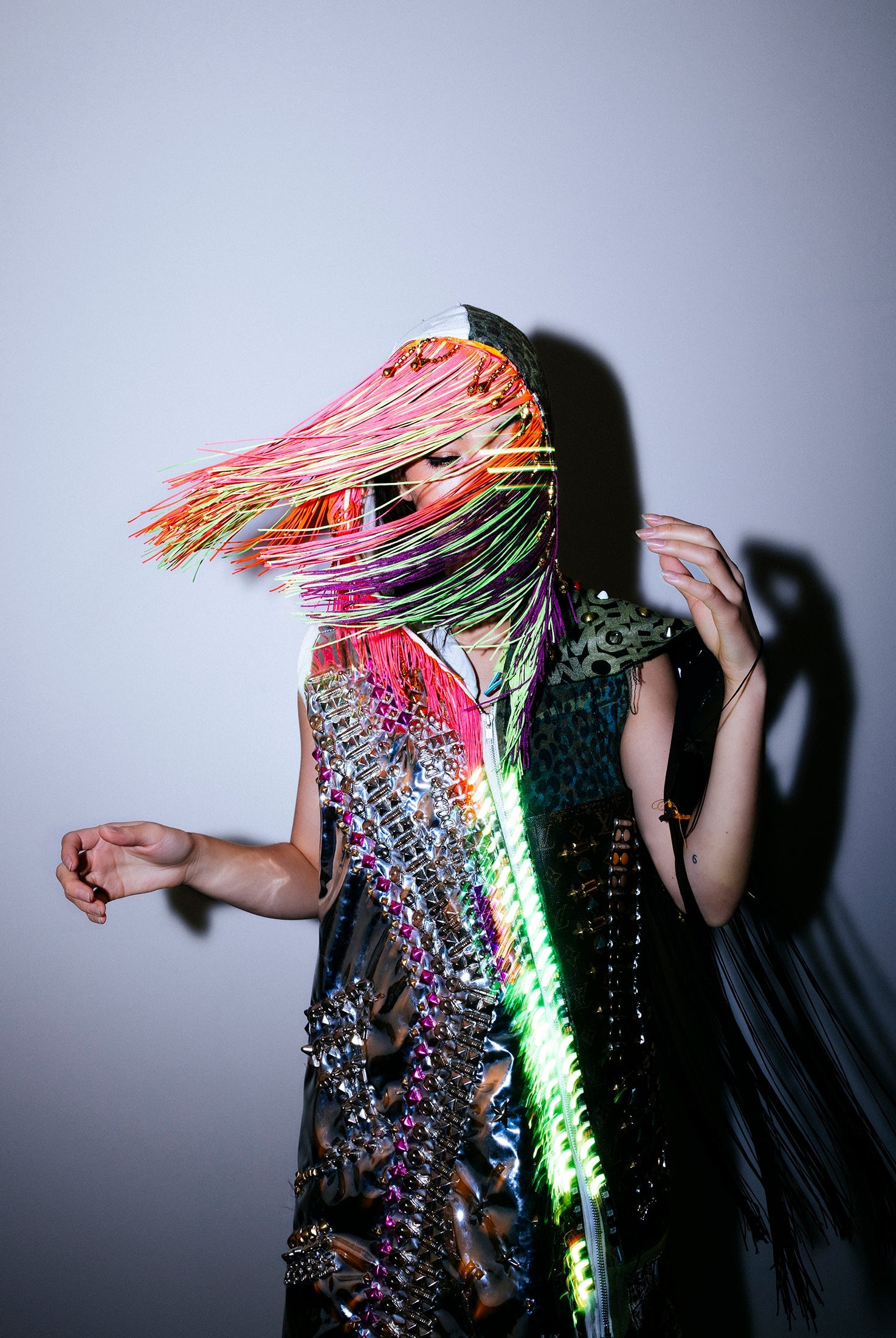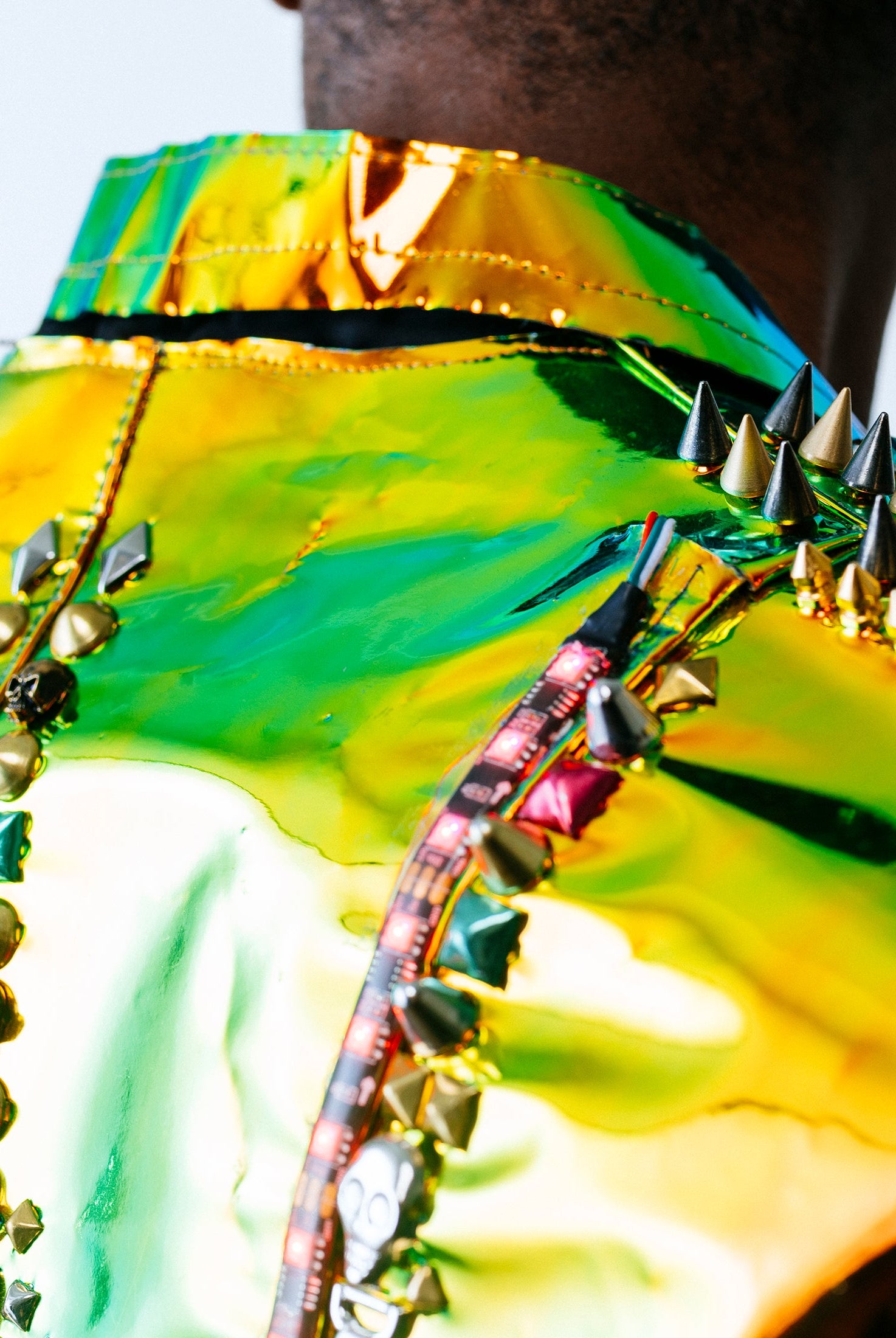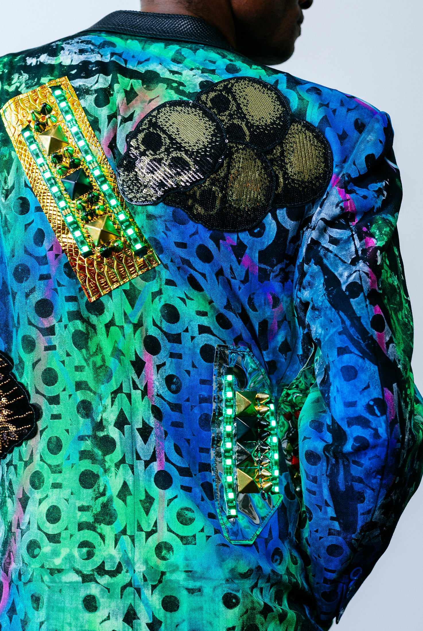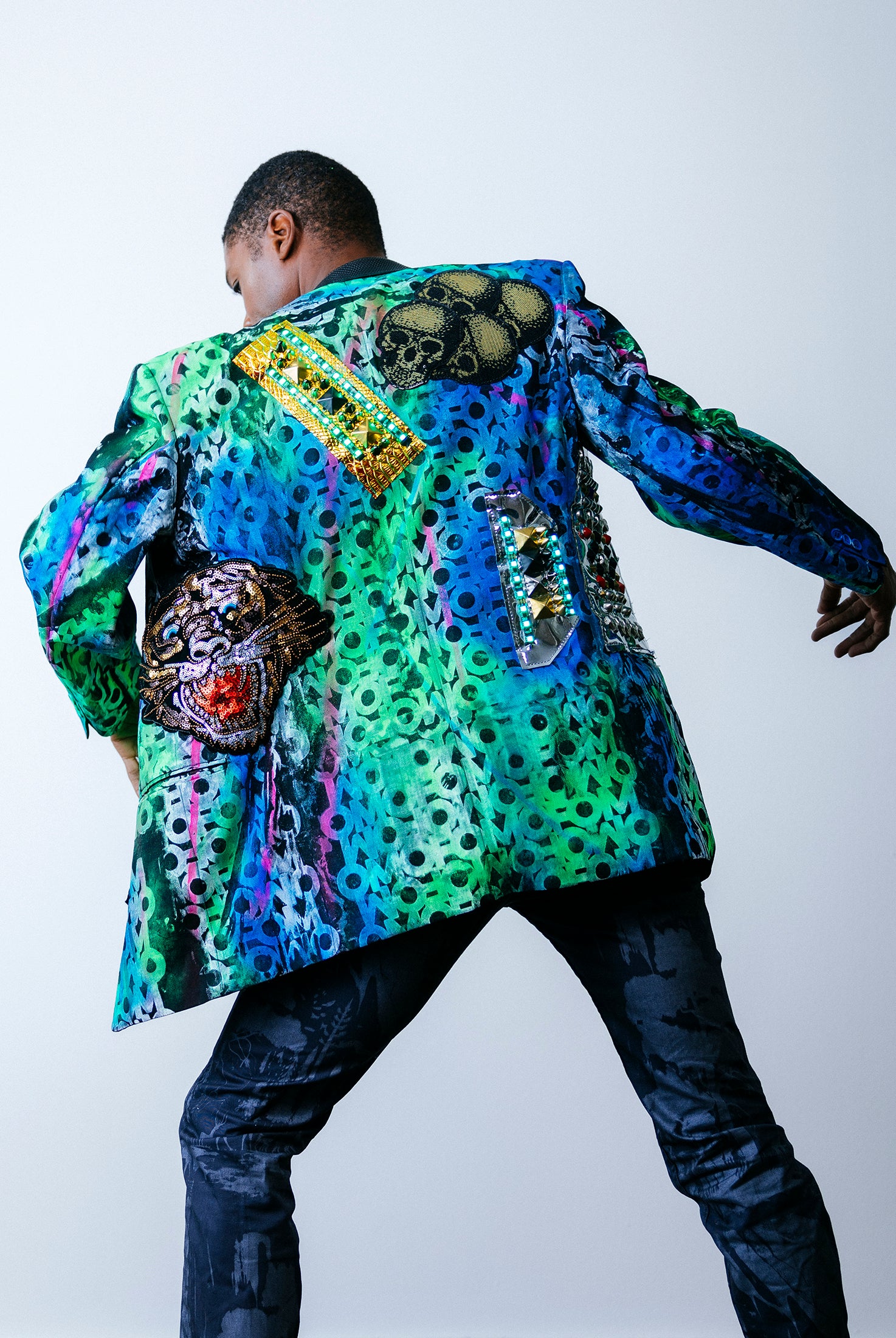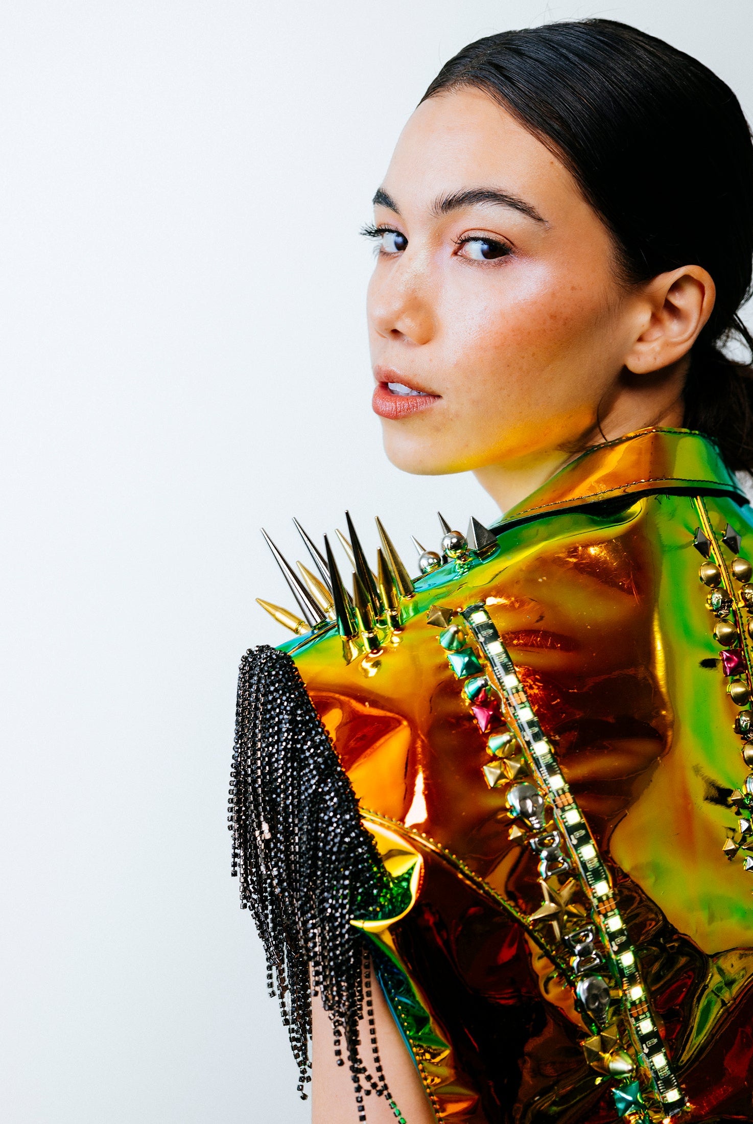 In the Tinsel Arcade, we blend street, formal, and post-modern elements to conjure one-of-a-kind garments by hand. Each is meticulously tailored to be equally dramatic and wearable. With your input, your bespoke garment will reflect you, push you, extend you, and complete you. If more is never enough, you can add LED and reflective overlays with stealth and nonstop modes.