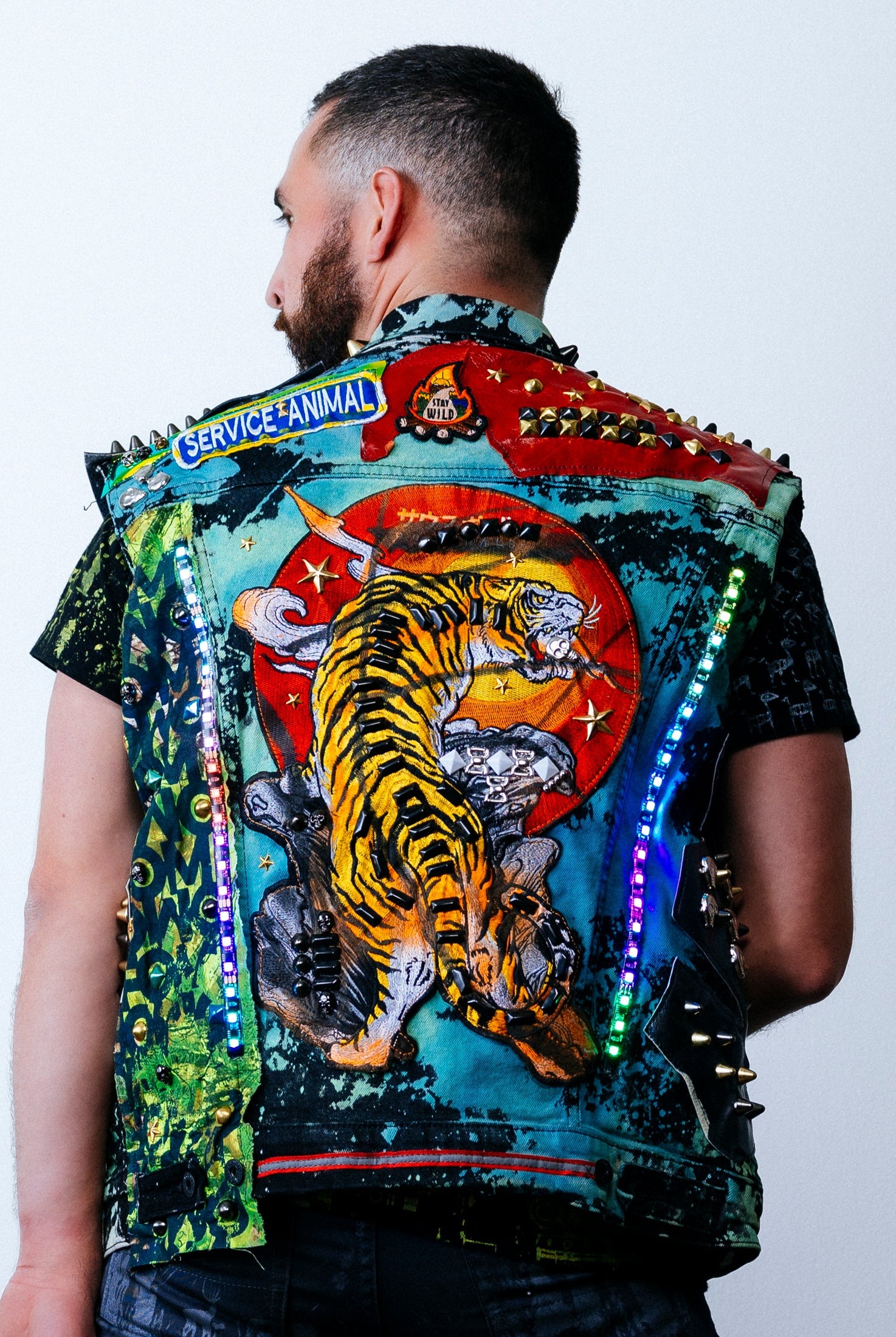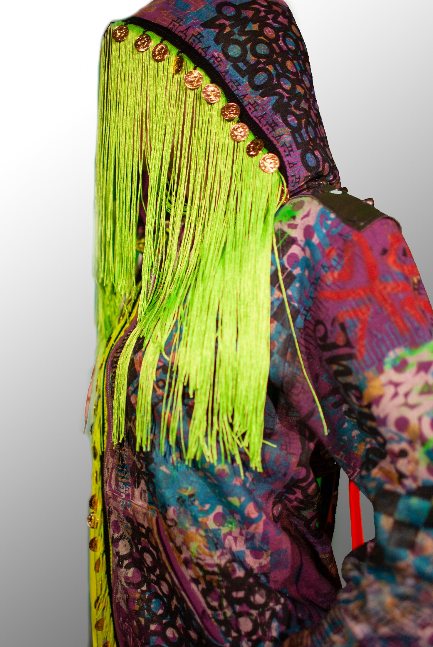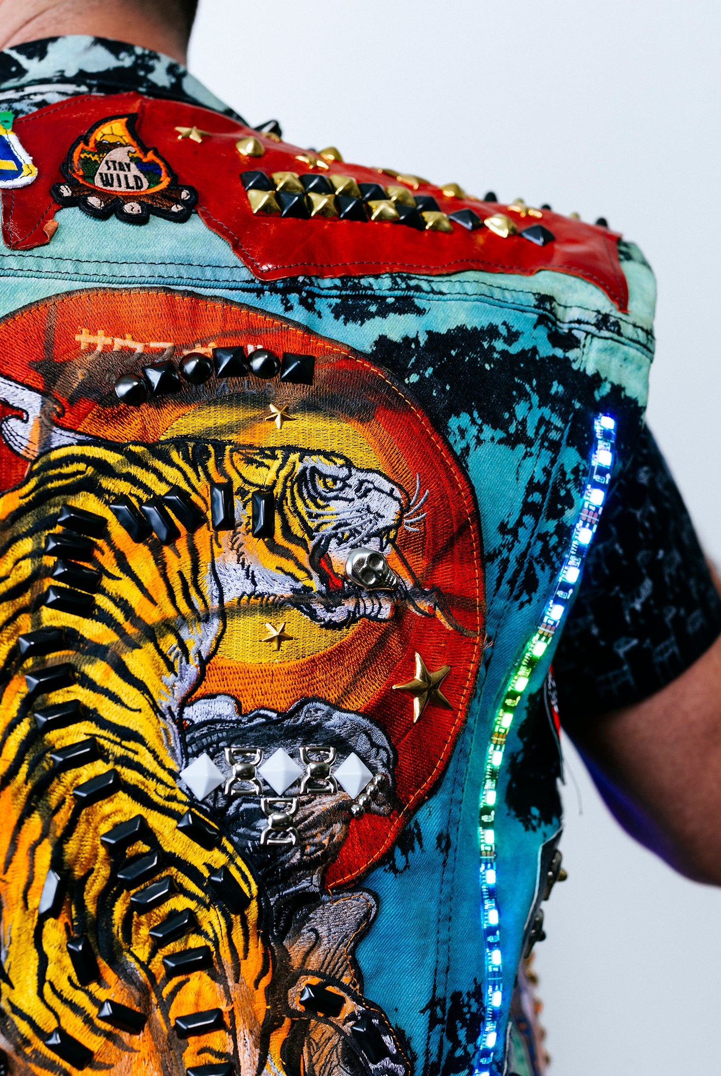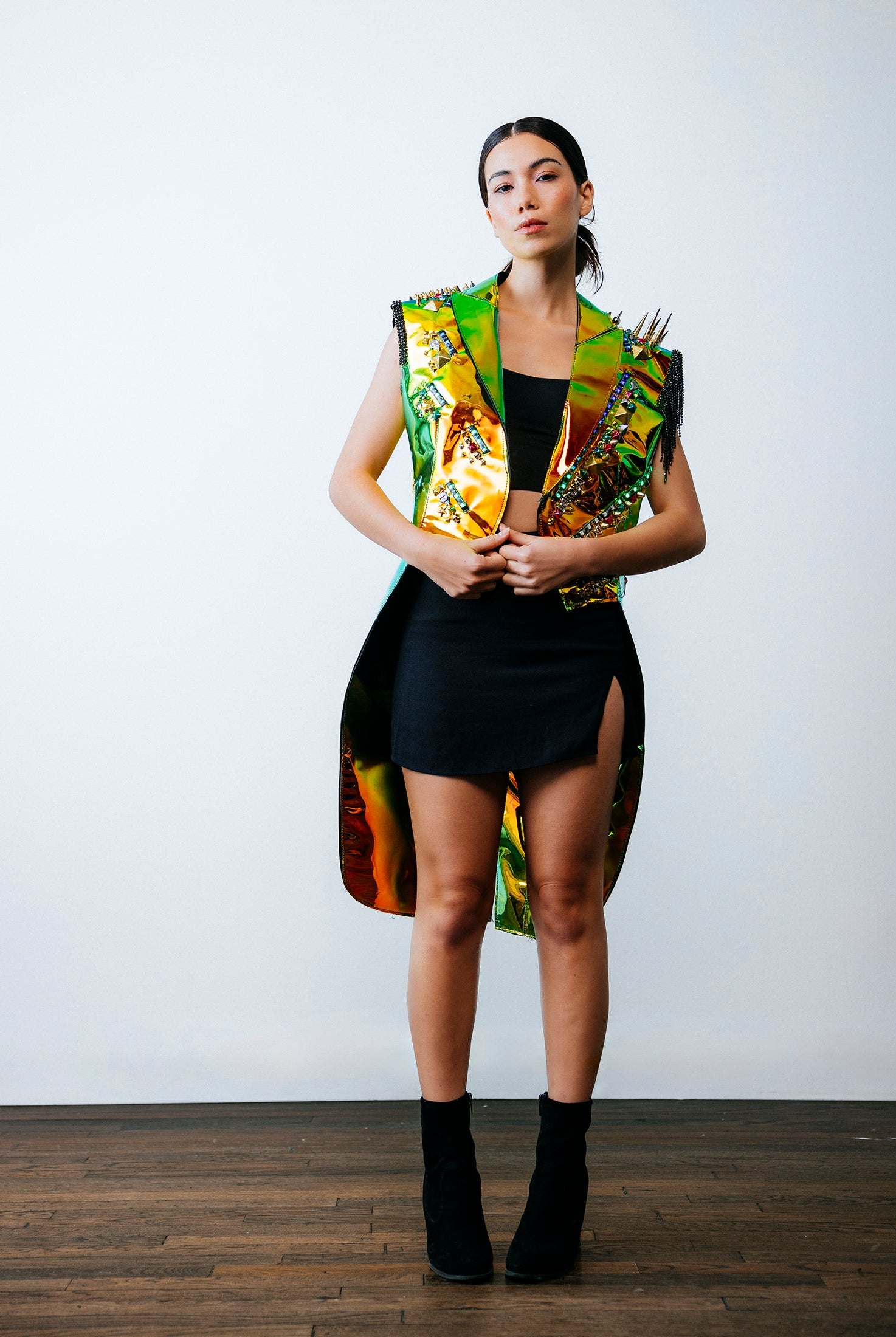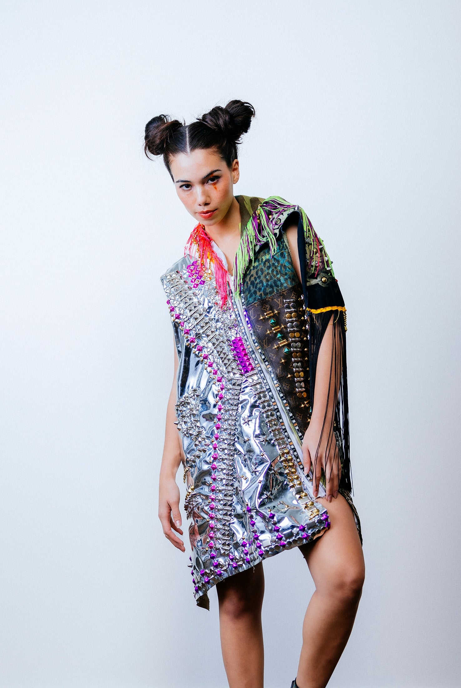 In the Tinsel Arcade, we blend street, formal, and post-modern elements to conjure one-of-a-kind garments by hand. Each is meticulously tailored to be equally dramatic and wearable. With your input, your bespoke garment will reflect you, push you, extend you, and complete you. If more is never enough, you can add LED and reflective overlays with stealth and nonstop modes.
