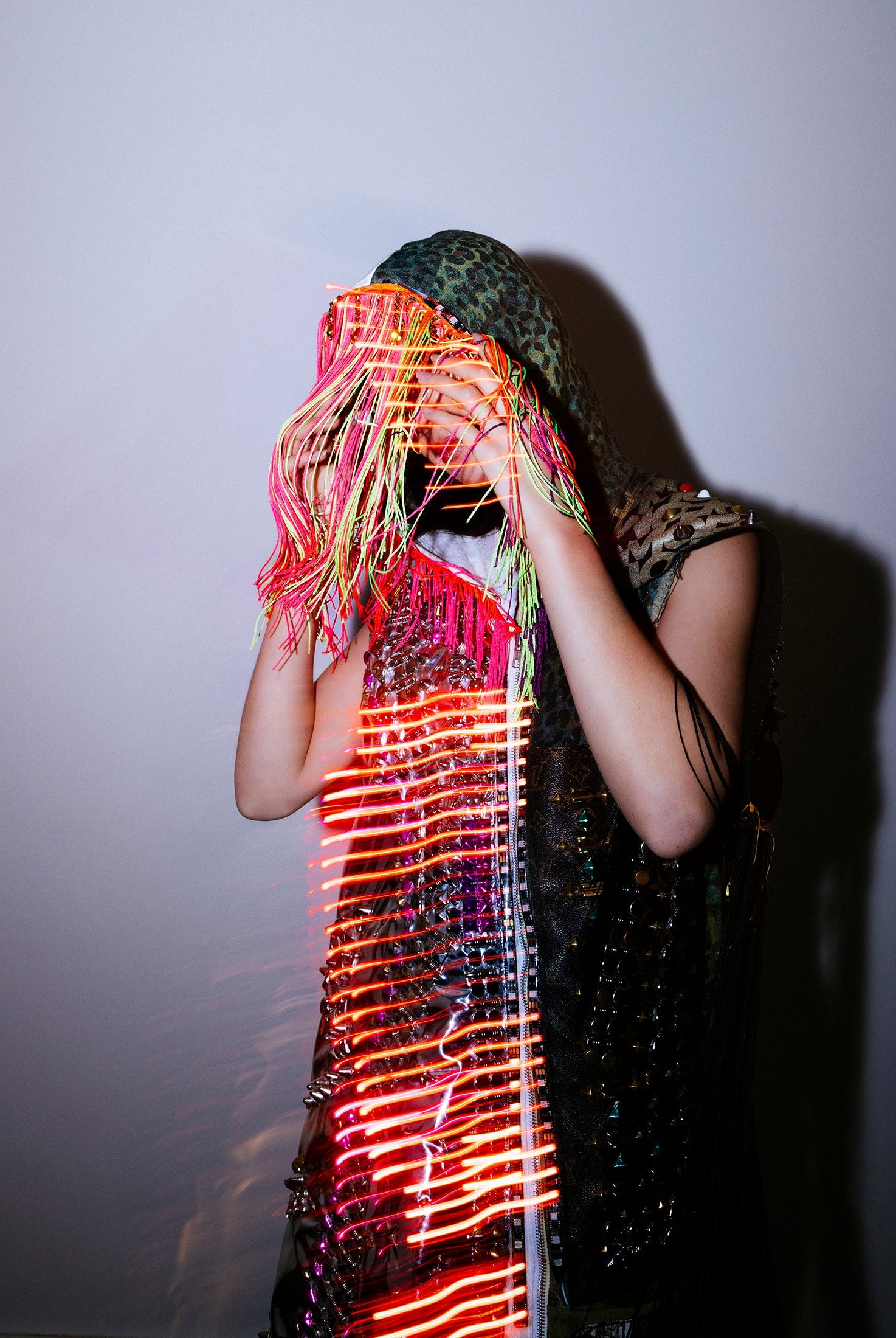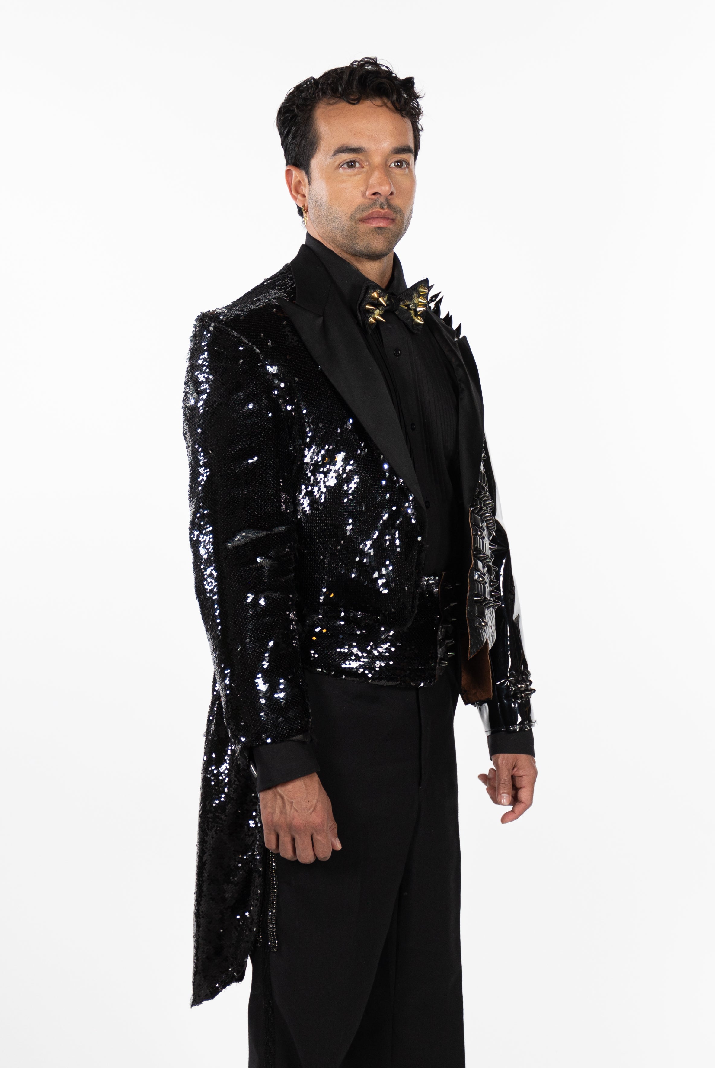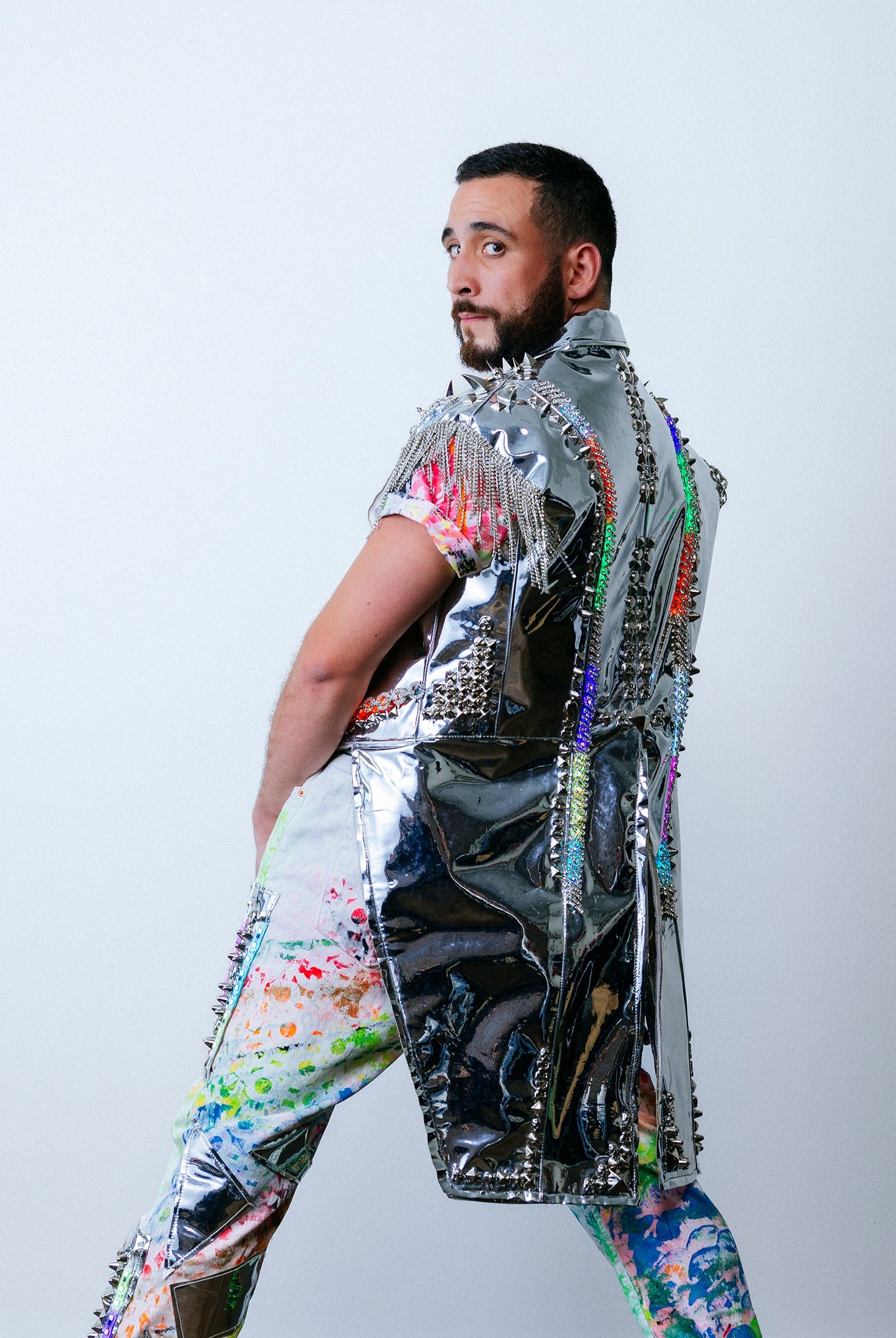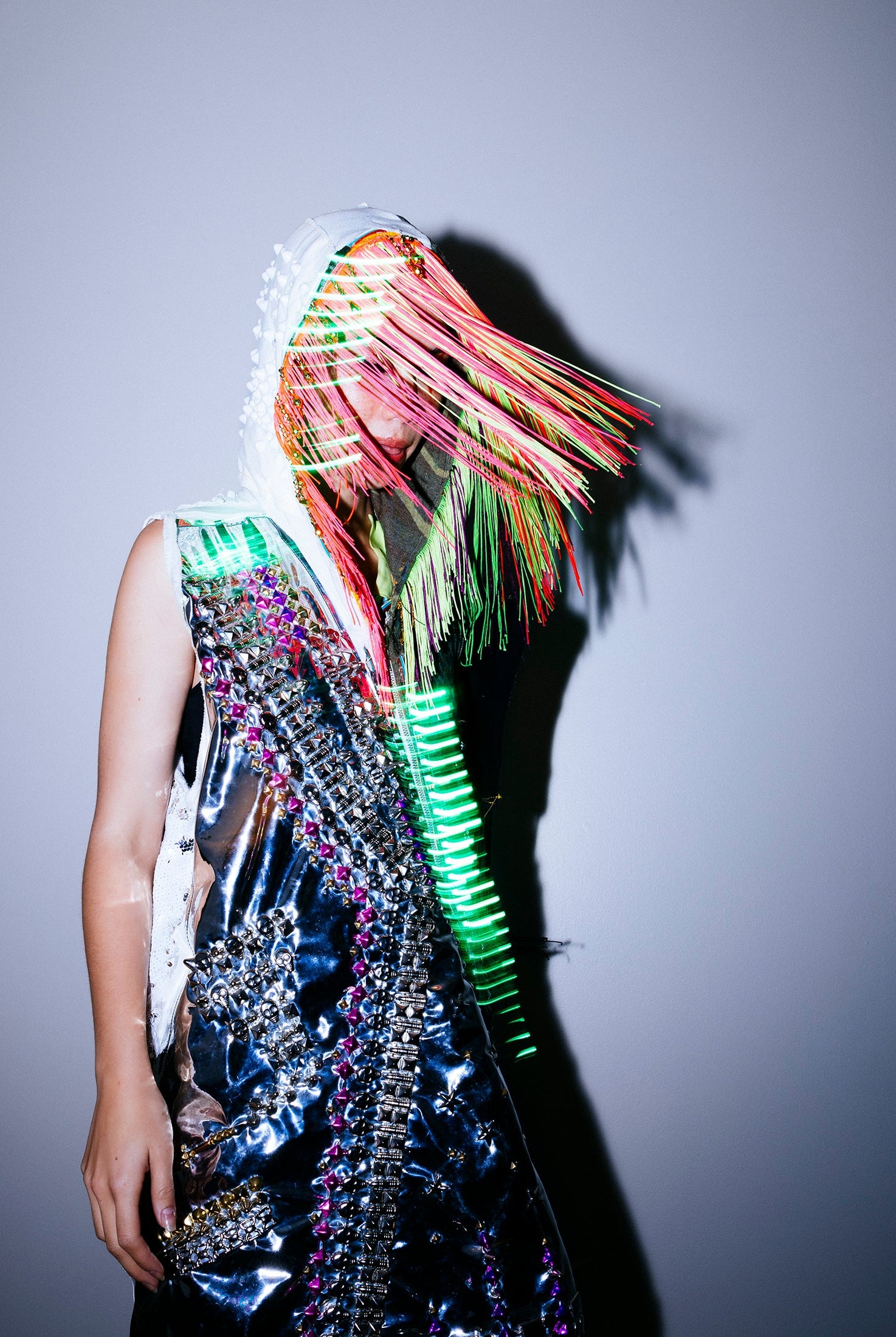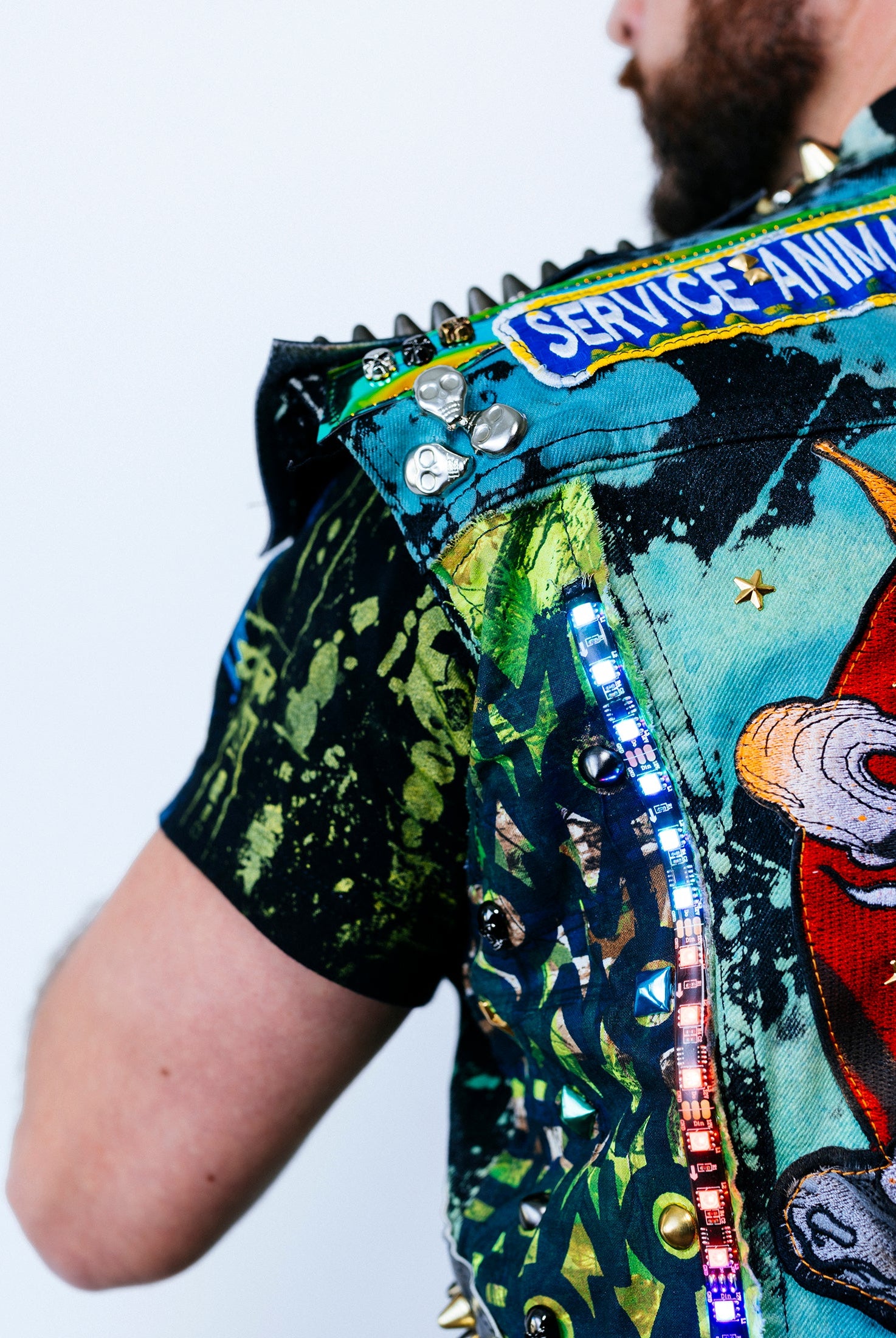 In the Tinsel Arcade, we blend street, formal, and post-modern elements to conjure one-of-a-kind garments by hand. Each is meticulously tailored to be equally dramatic and wearable. With your input, your bespoke garment will reflect you, push you, extend you, and complete you. If more is never enough, you can add LED and reflective overlays with stealth and nonstop modes.