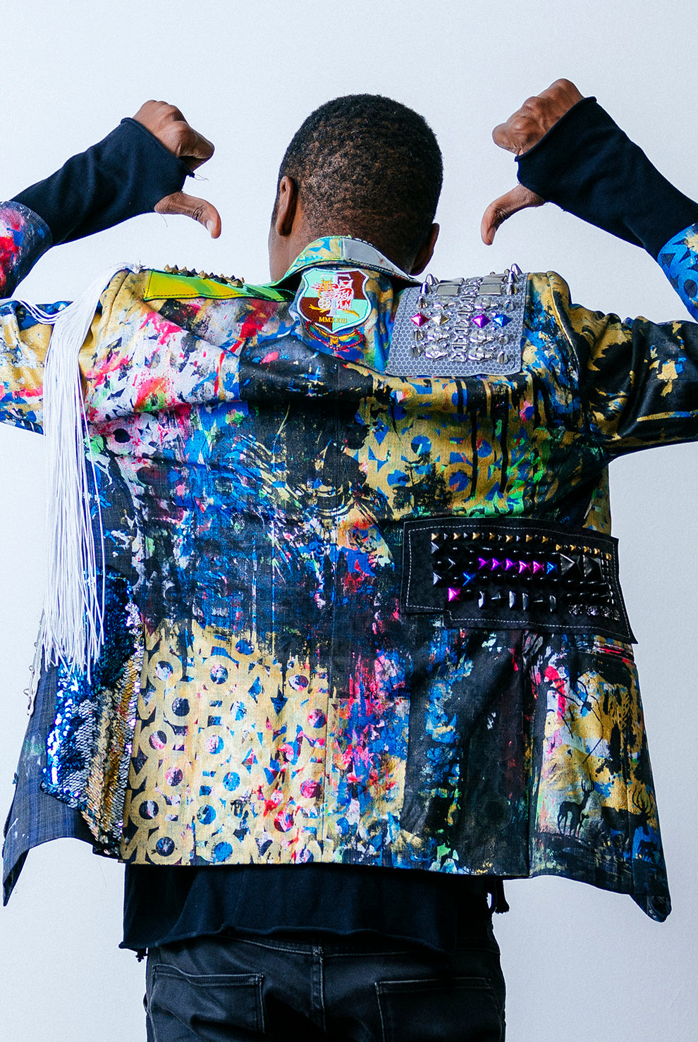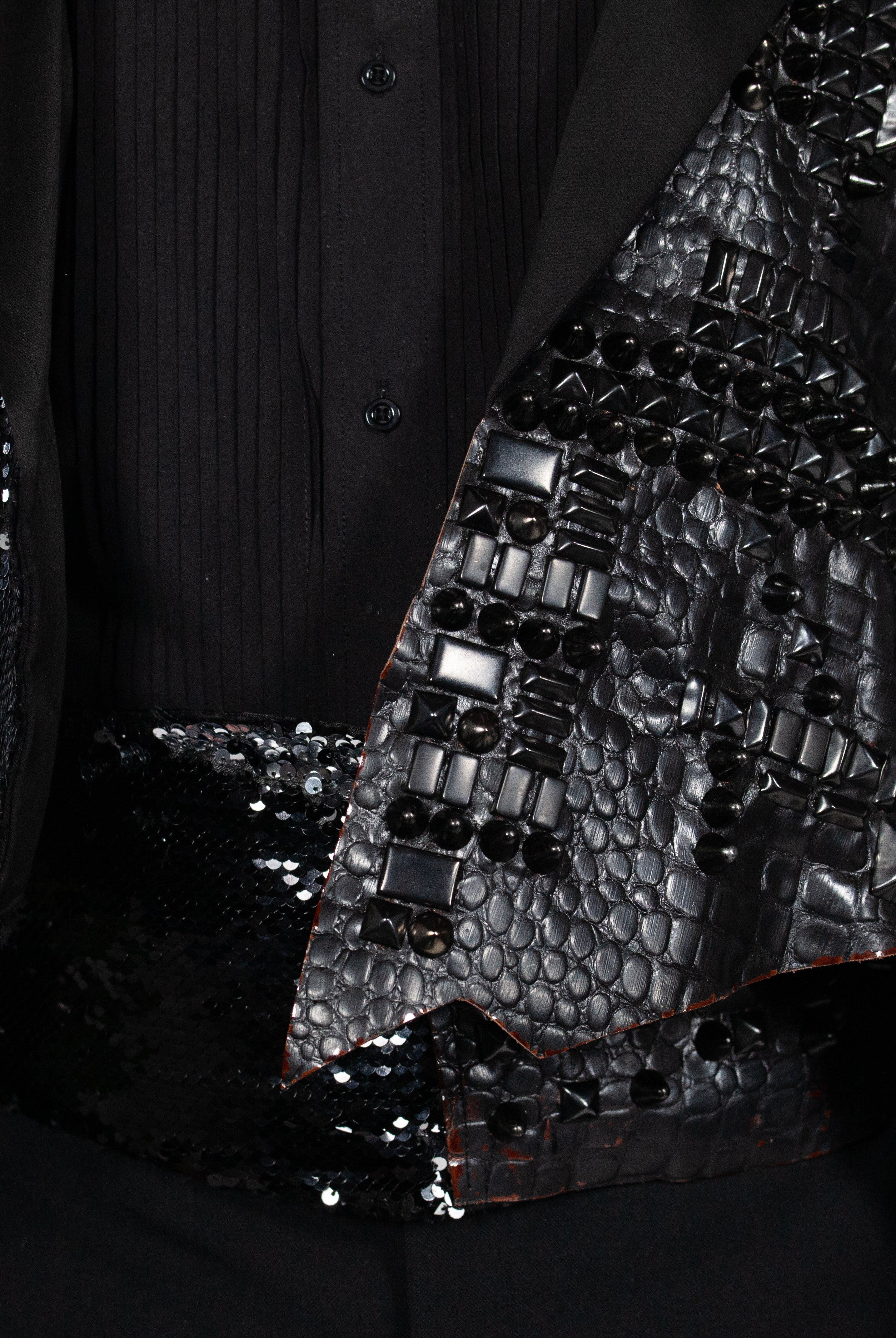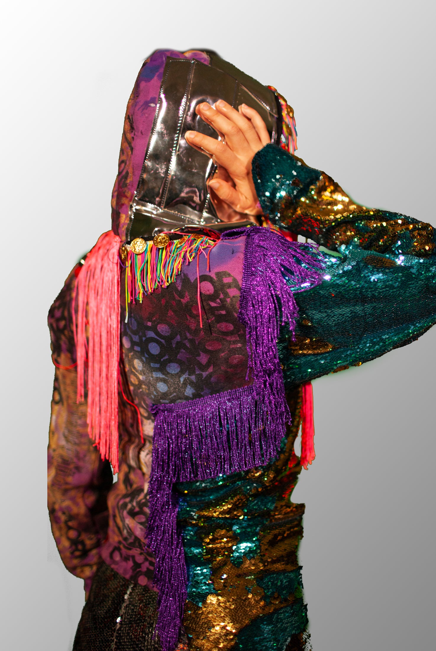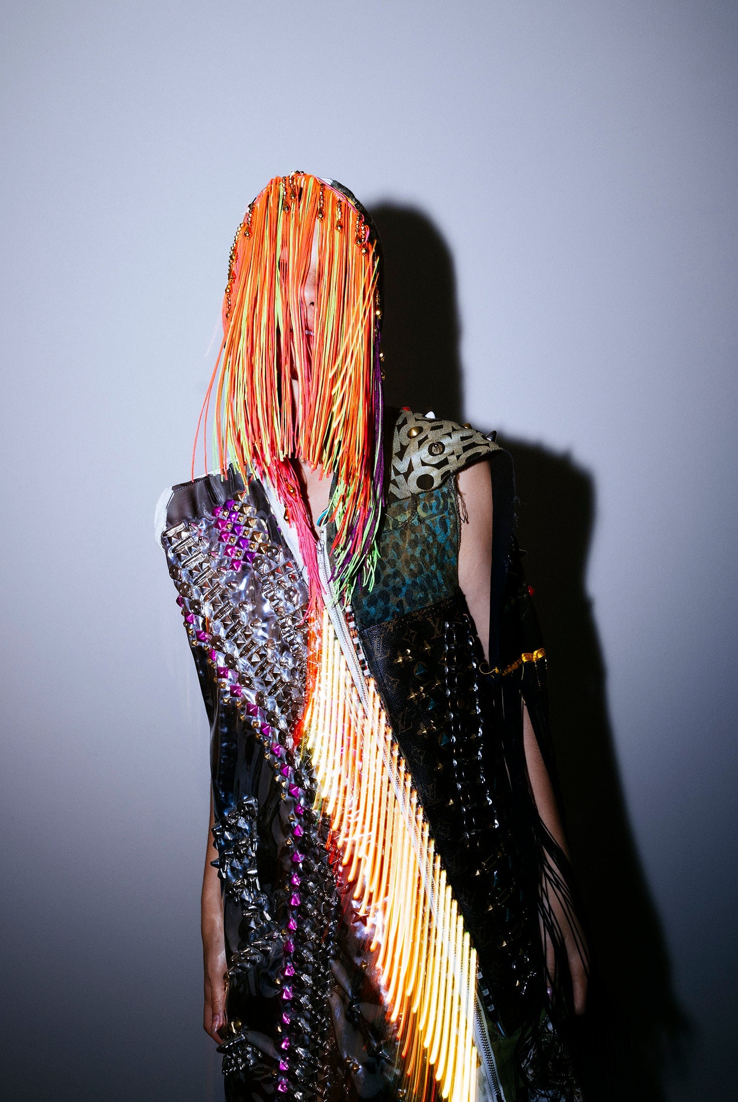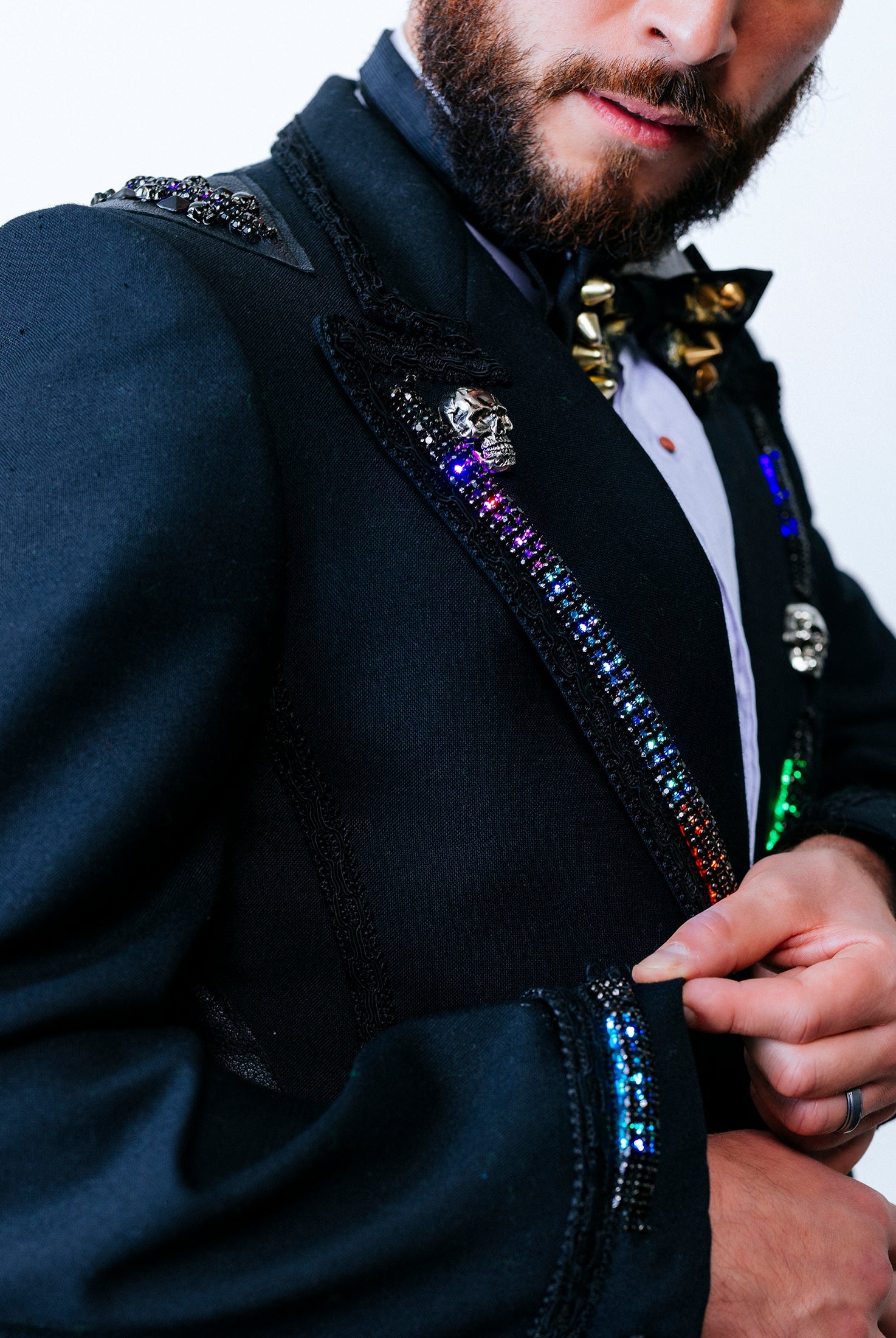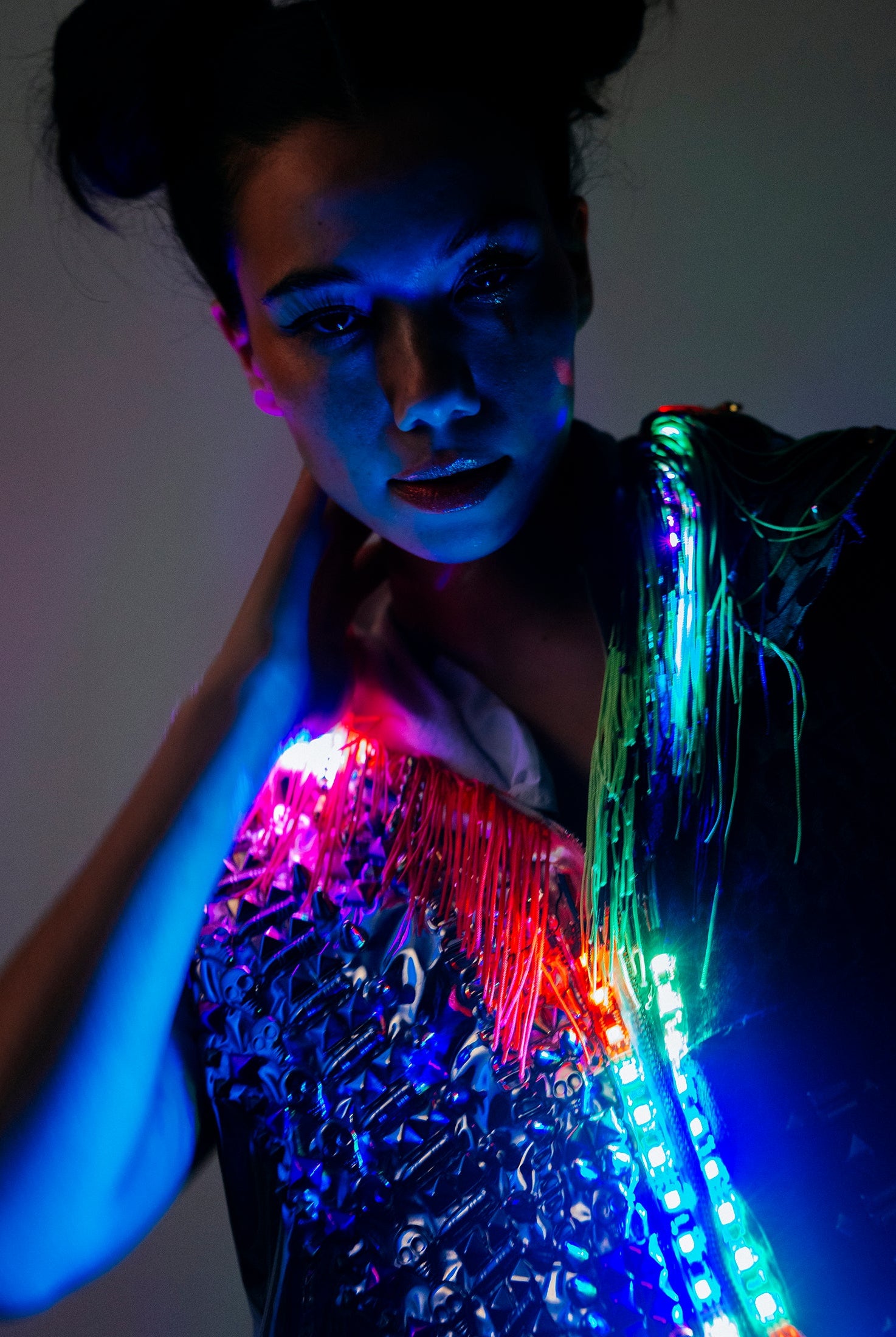 In the Tinsel Arcade, we blend street, formal, and post-modern elements to conjure one-of-a-kind garments by hand. Each is meticulously tailored to be equally dramatic and wearable. With your input, your bespoke garment will reflect you, push you, extend you, and complete you. If more is never enough, you can add LED and reflective overlays with stealth and nonstop modes.