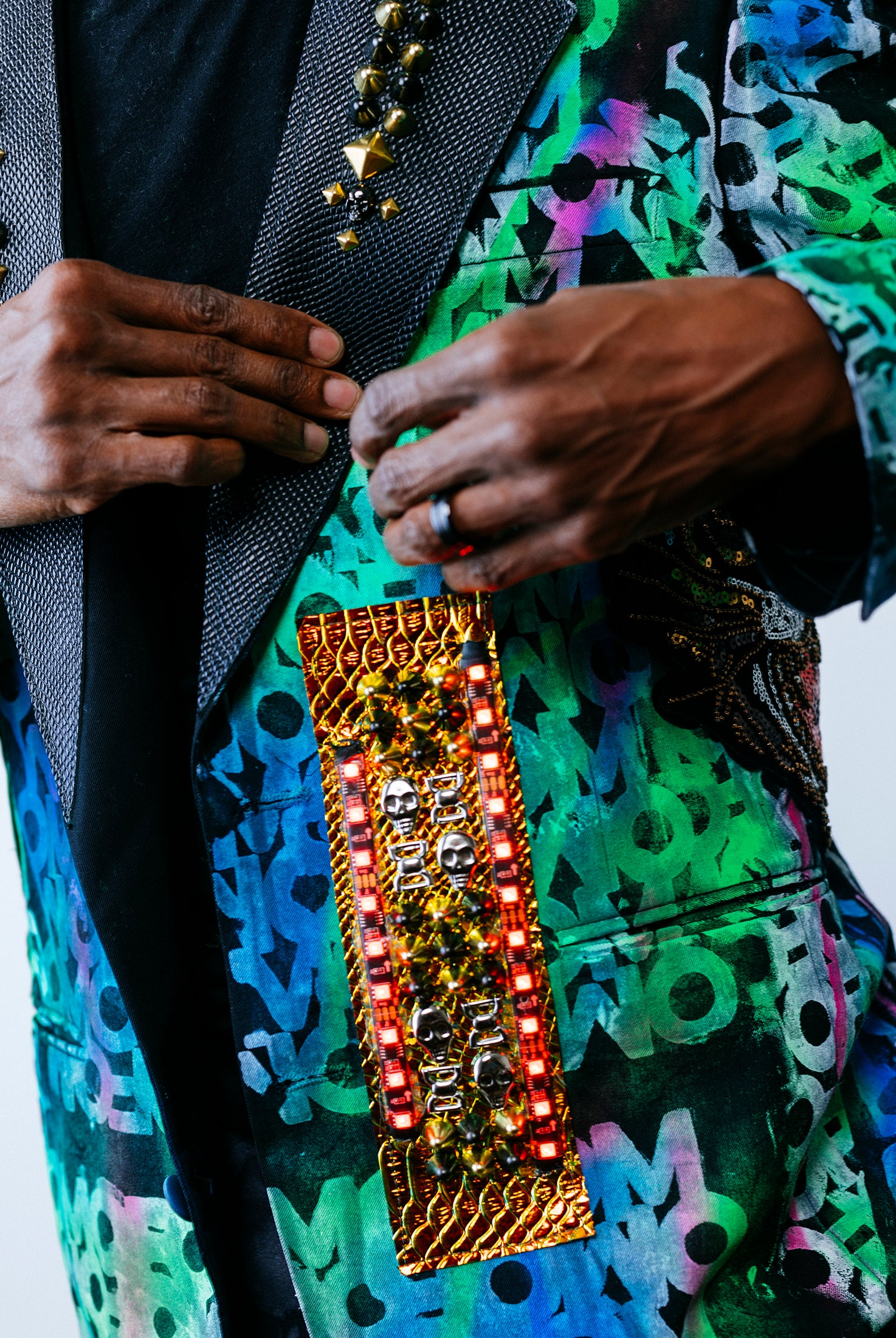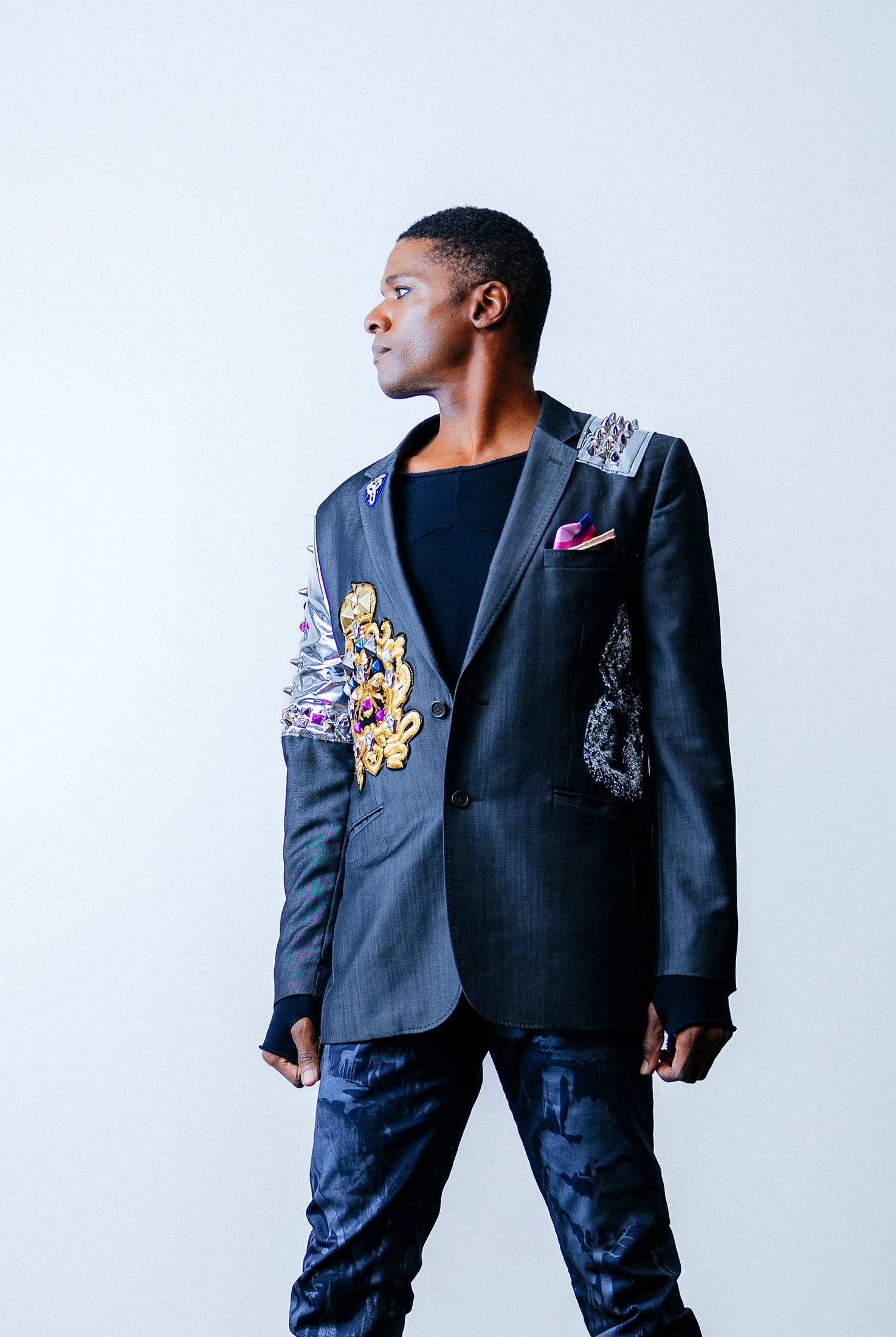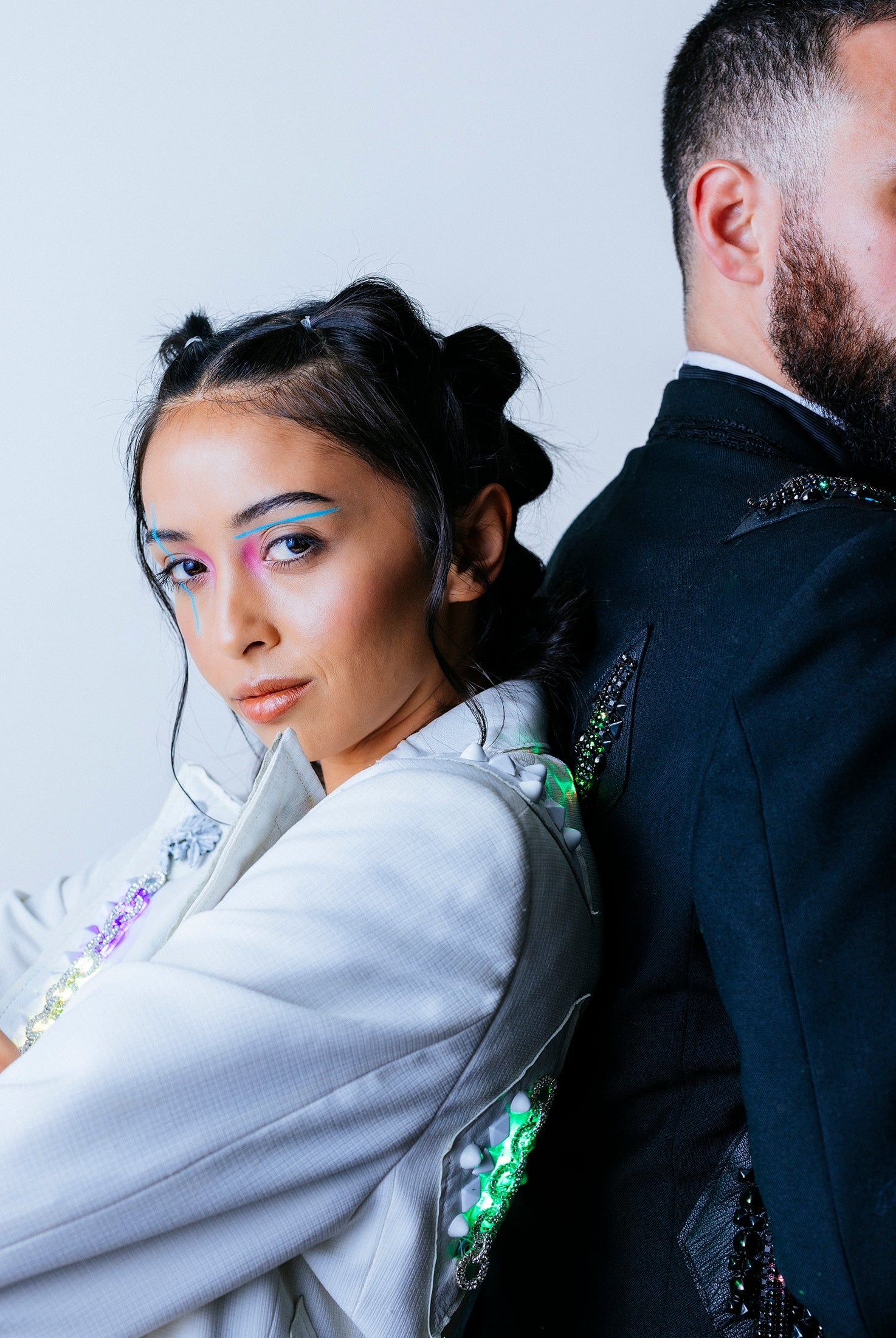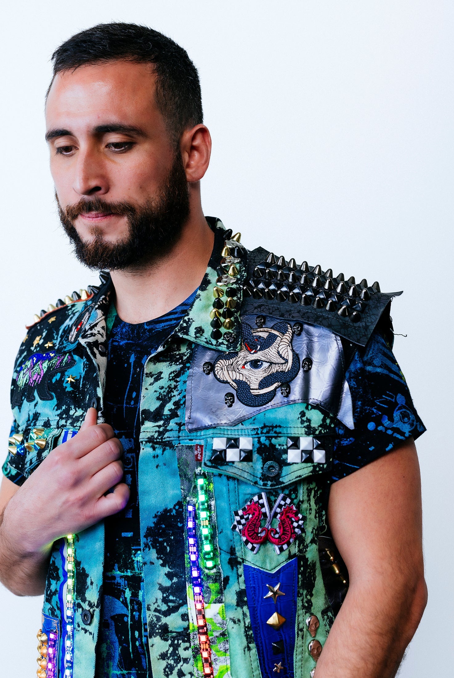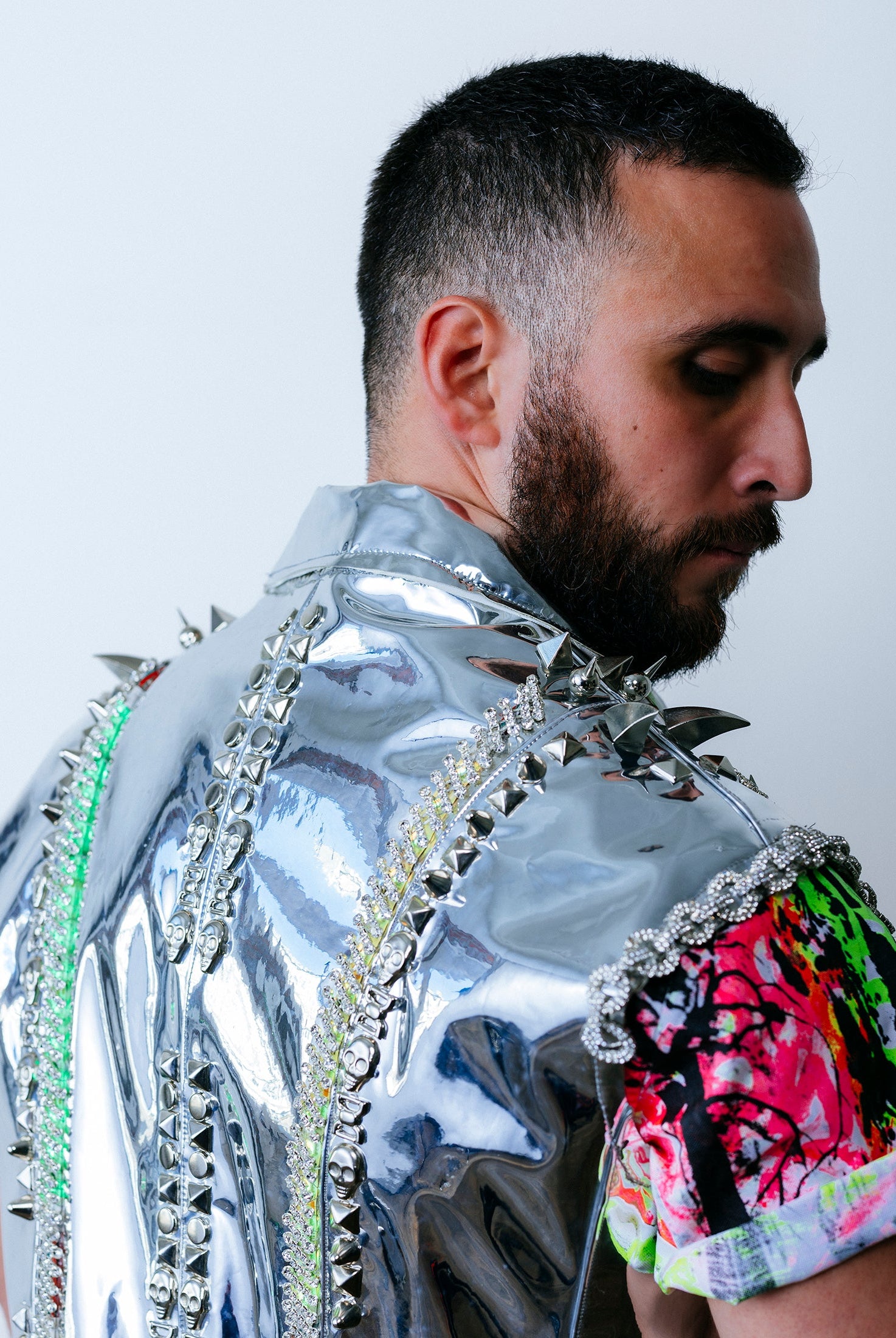 In the Tinsel Arcade, we blend street, formal, and post-modern elements to conjure one-of-a-kind garments by hand. Each is meticulously tailored to be equally dramatic and wearable. With your input, your bespoke garment will reflect you, push you, extend you, and complete you. If more is never enough, you can add LED and reflective overlays with stealth and nonstop modes.