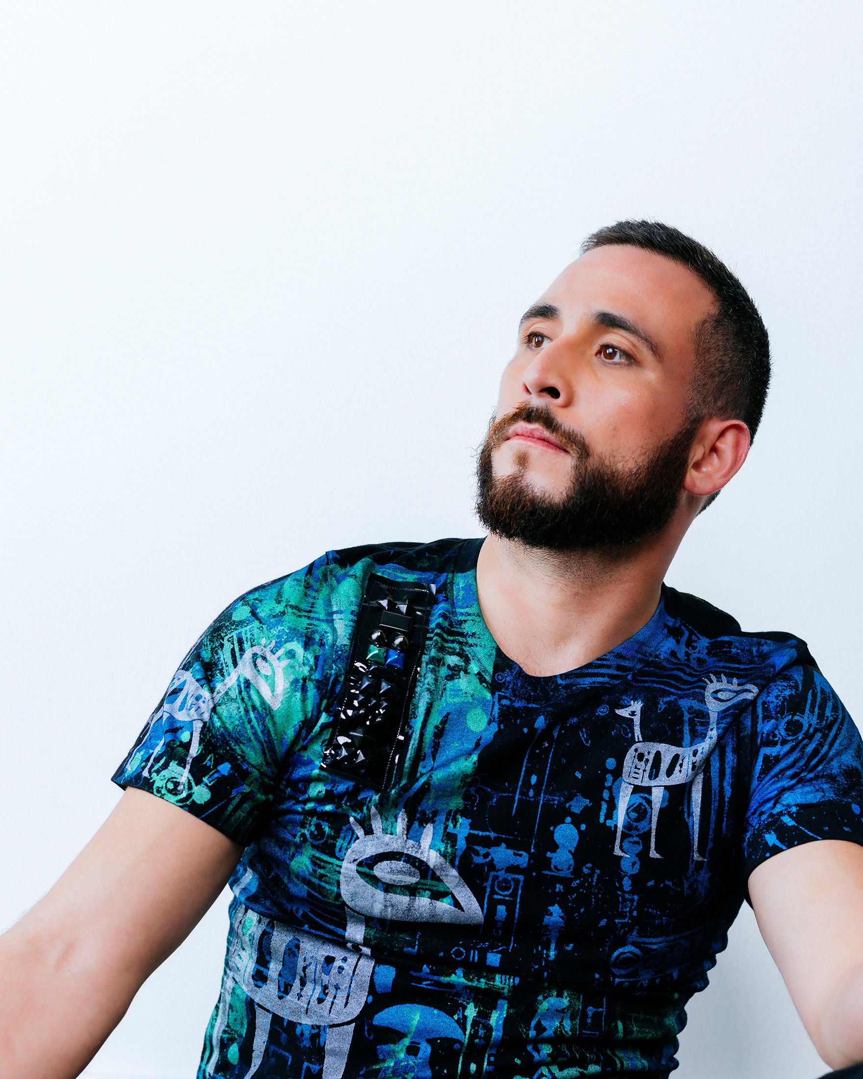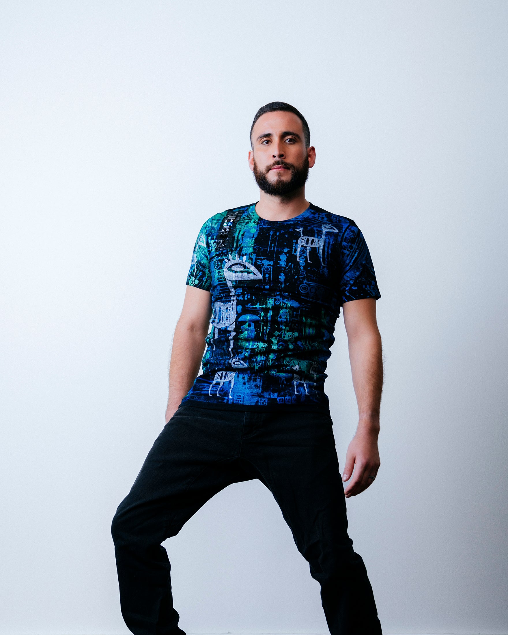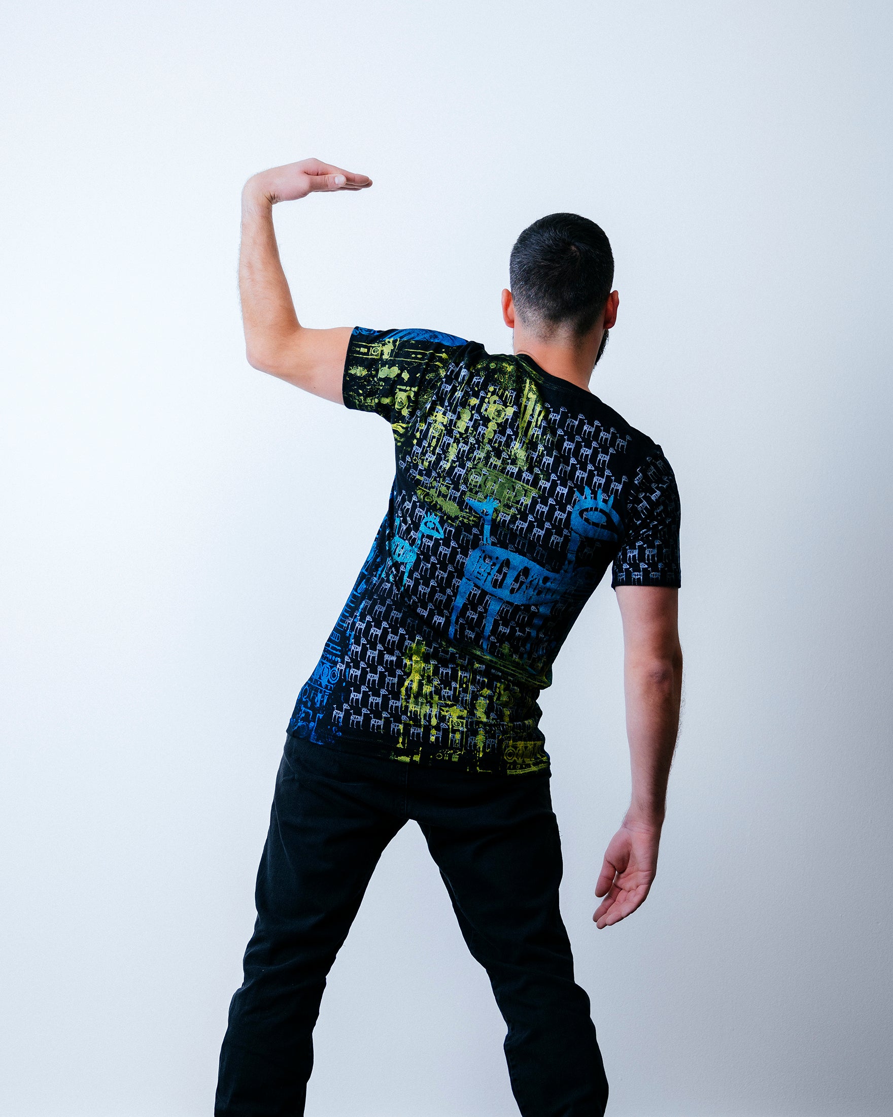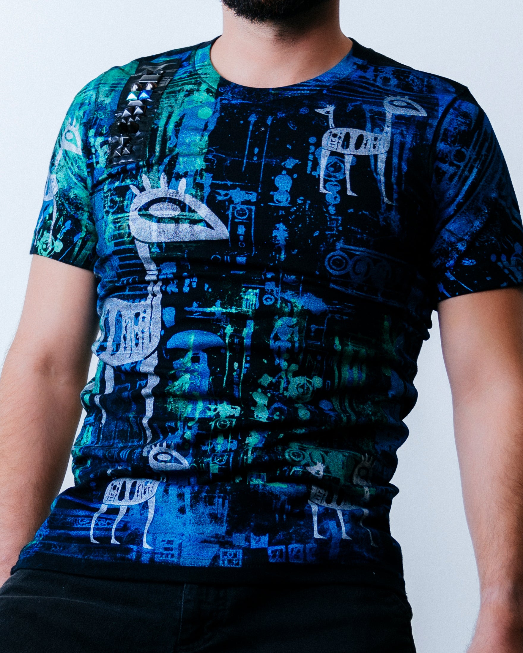 The design showcases a mesmerizing luminosity achieved through the interplay of rich hues and pearlescent silver ink, meticulously handprinted. The artistic process begins with an emerald base layer of alien graffiti, followed by a secondary layer in blue topaz, and a tertiary layer featuring R3x in pearlescent silver ink. An addition of vibrant citrine highlights are the finishing touch. All inks used are water-based, lending the material a luxurious and soft texture.
