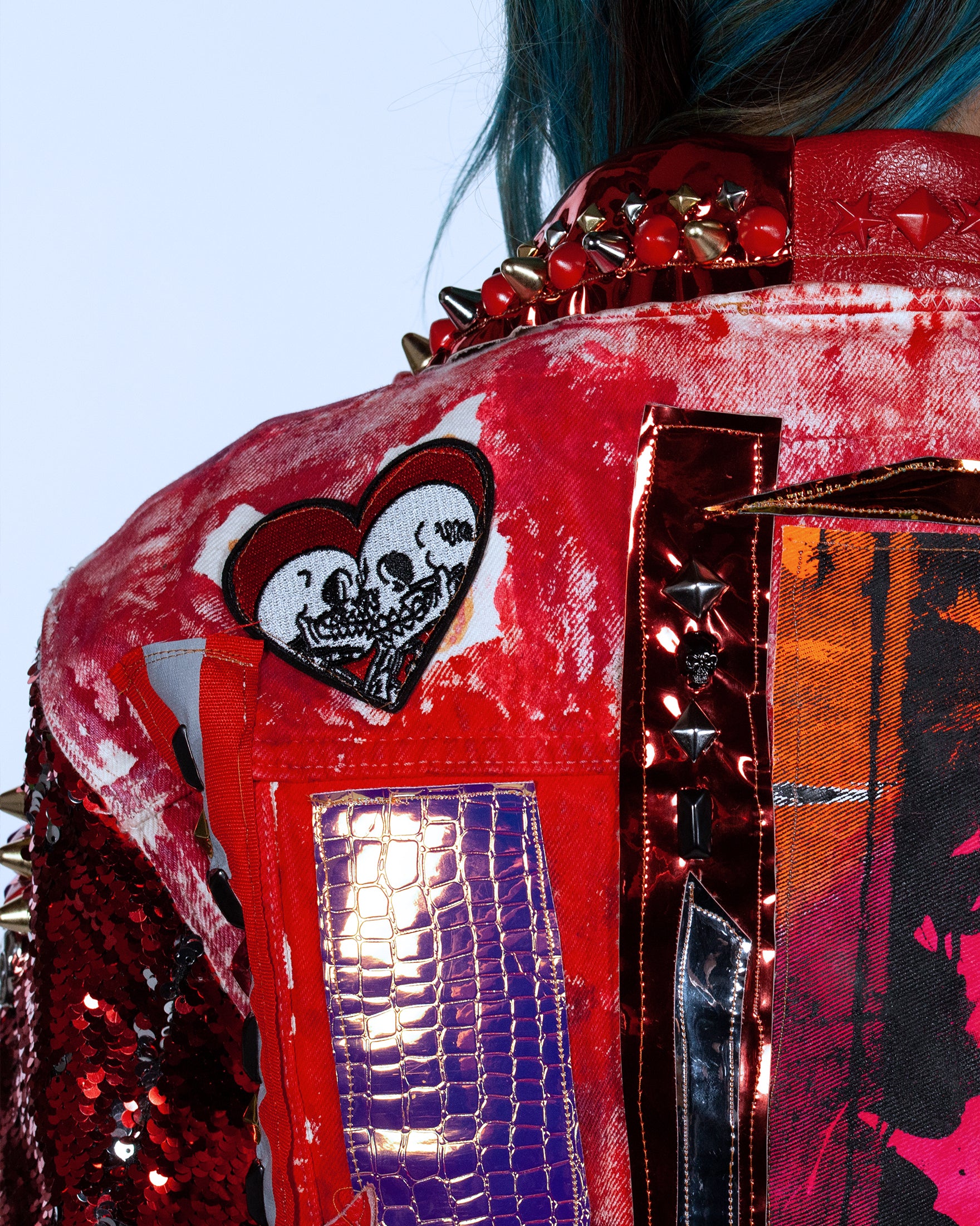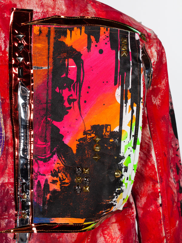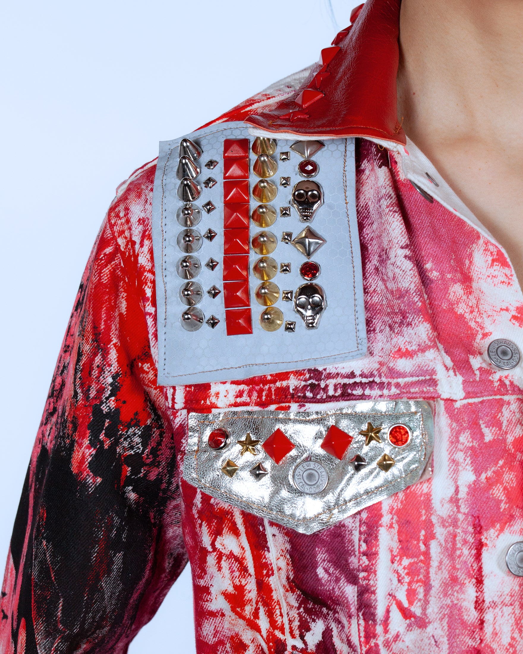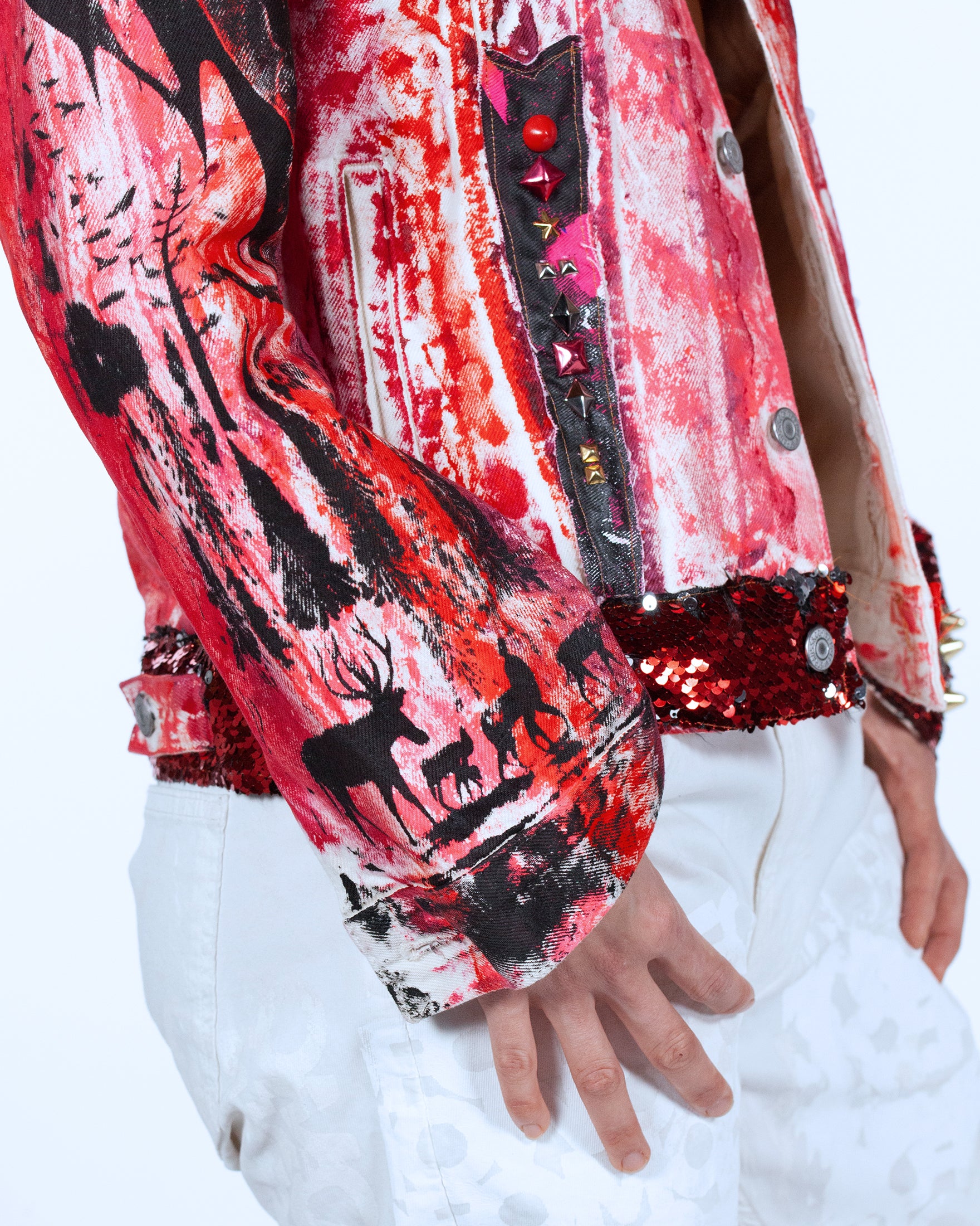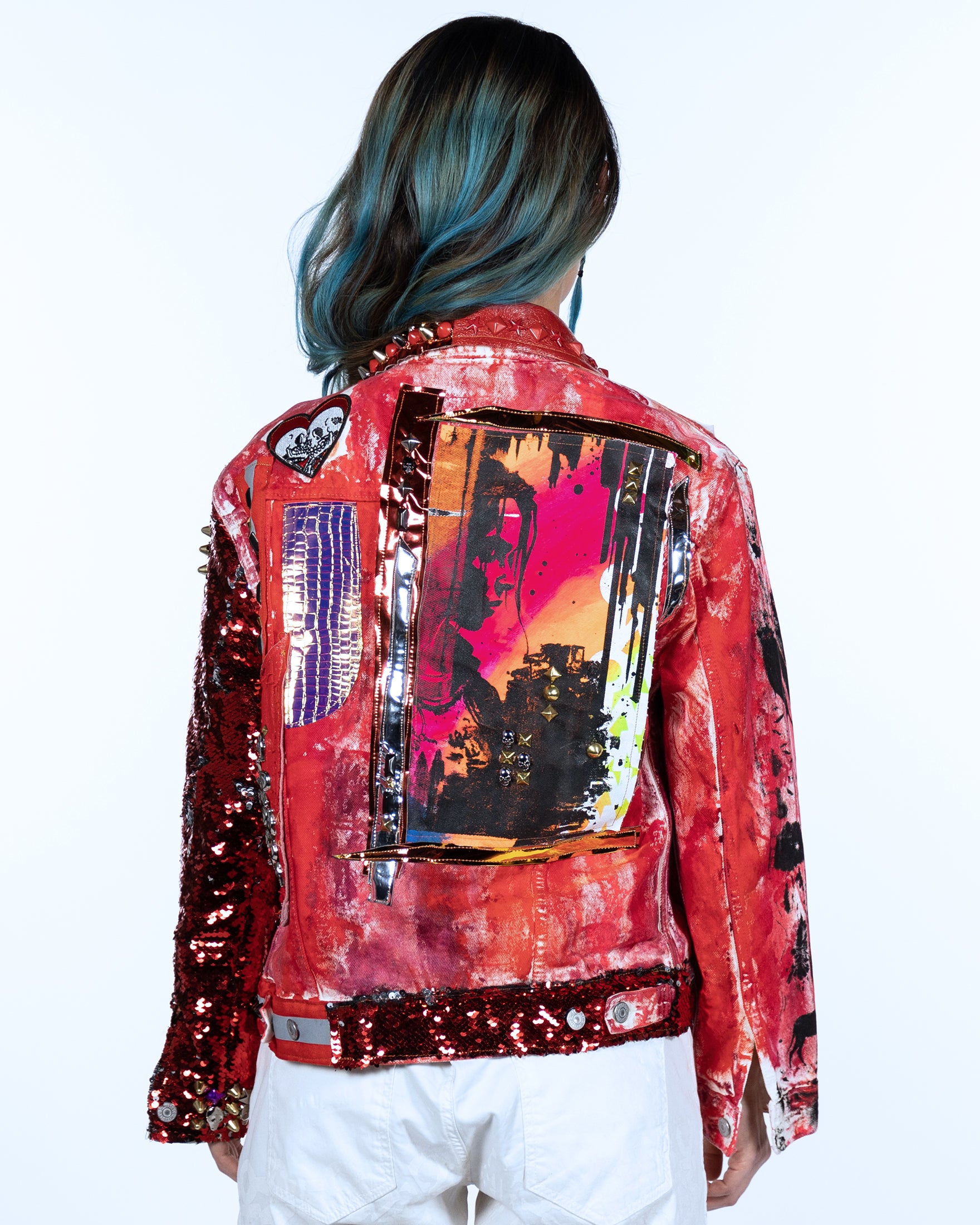 Exquisite detailing is spotlighted in this crimson wonder. The jacket was first hand-painted with a spattering of red, pink and purple. The inks are enhanced by a layer of black ancient cave art on the right sleeve. The left sleeve is a startling contrast of rough and smooth textures showcasing a 5mm flip red/silver sequins adorned with a variety of studs.