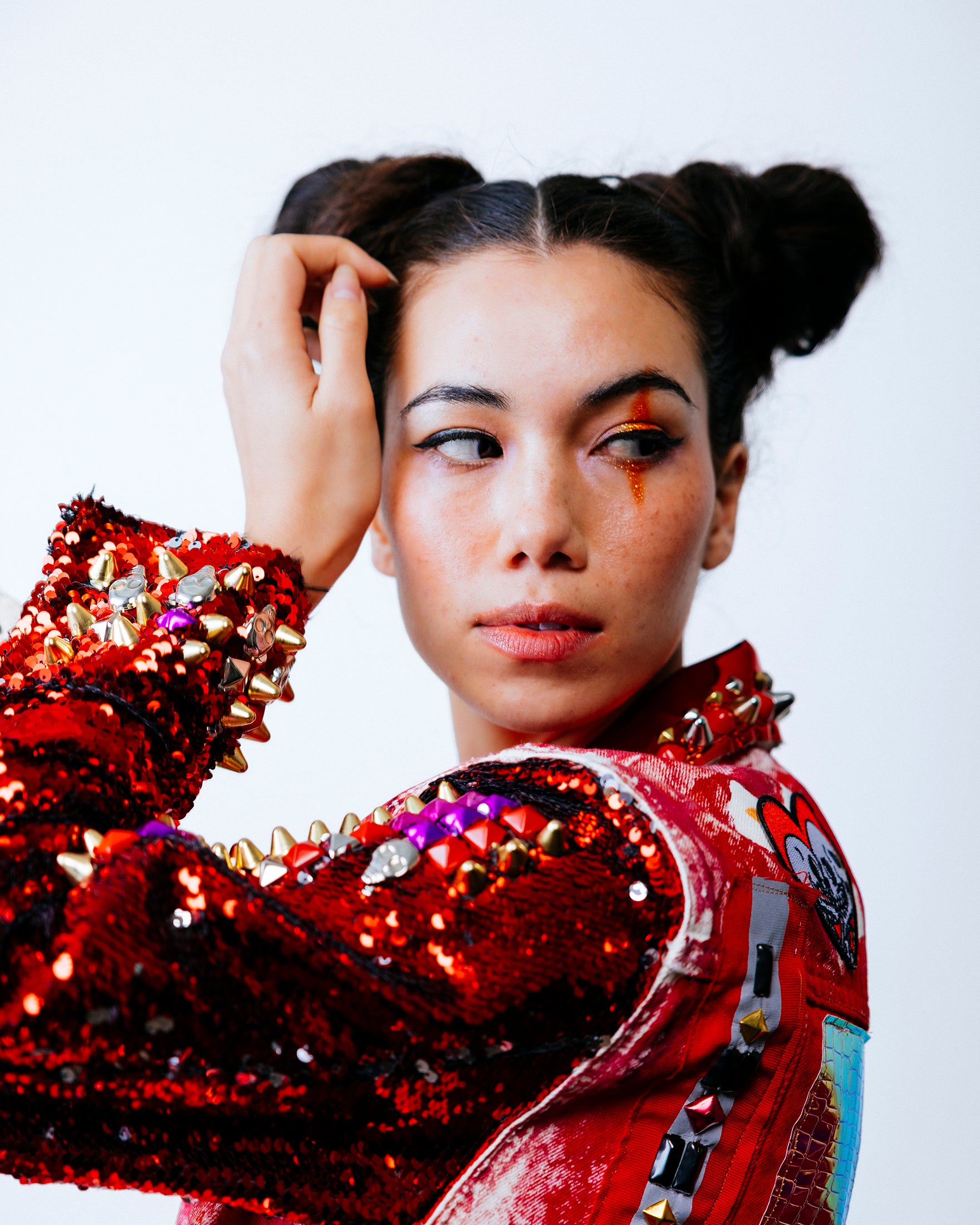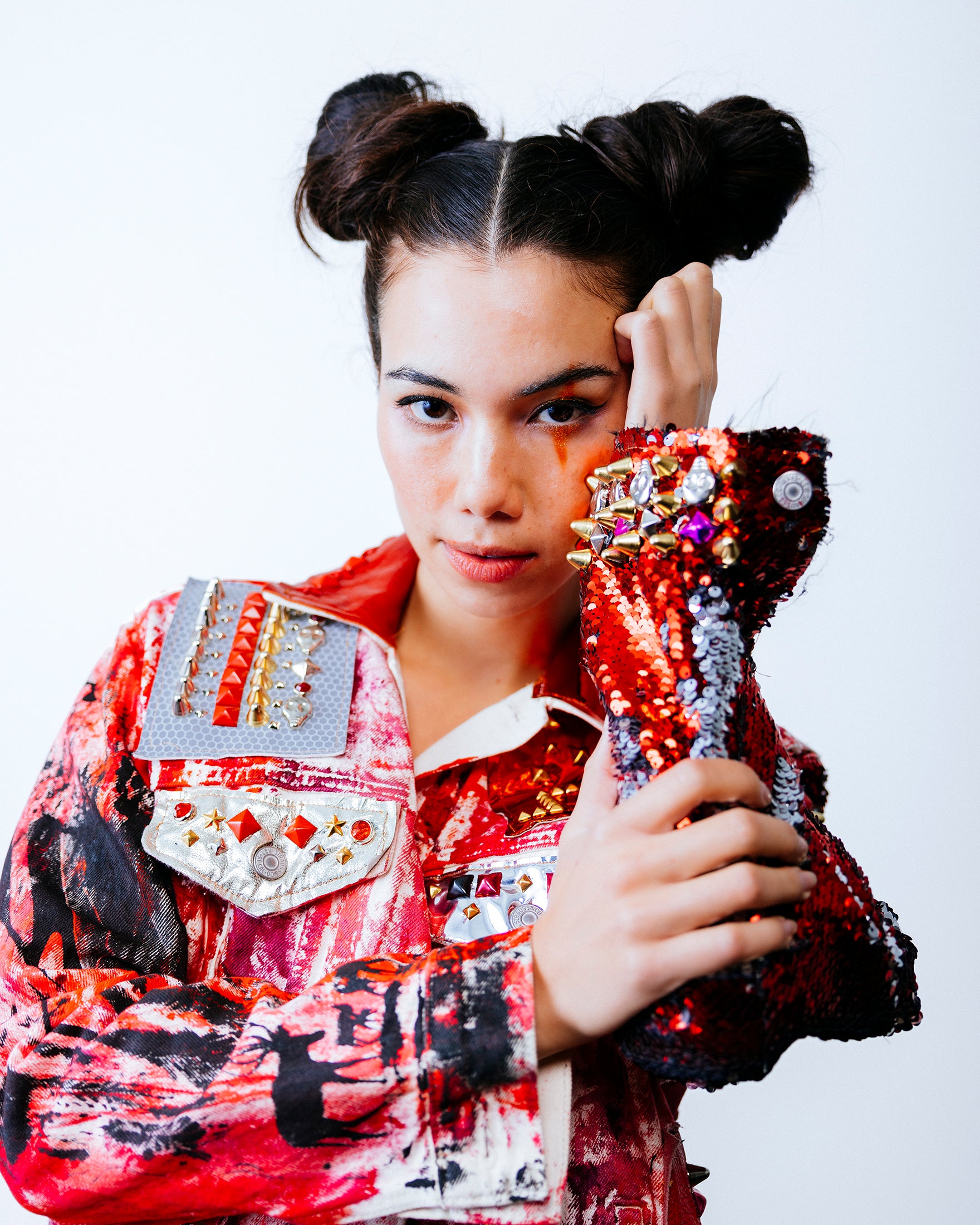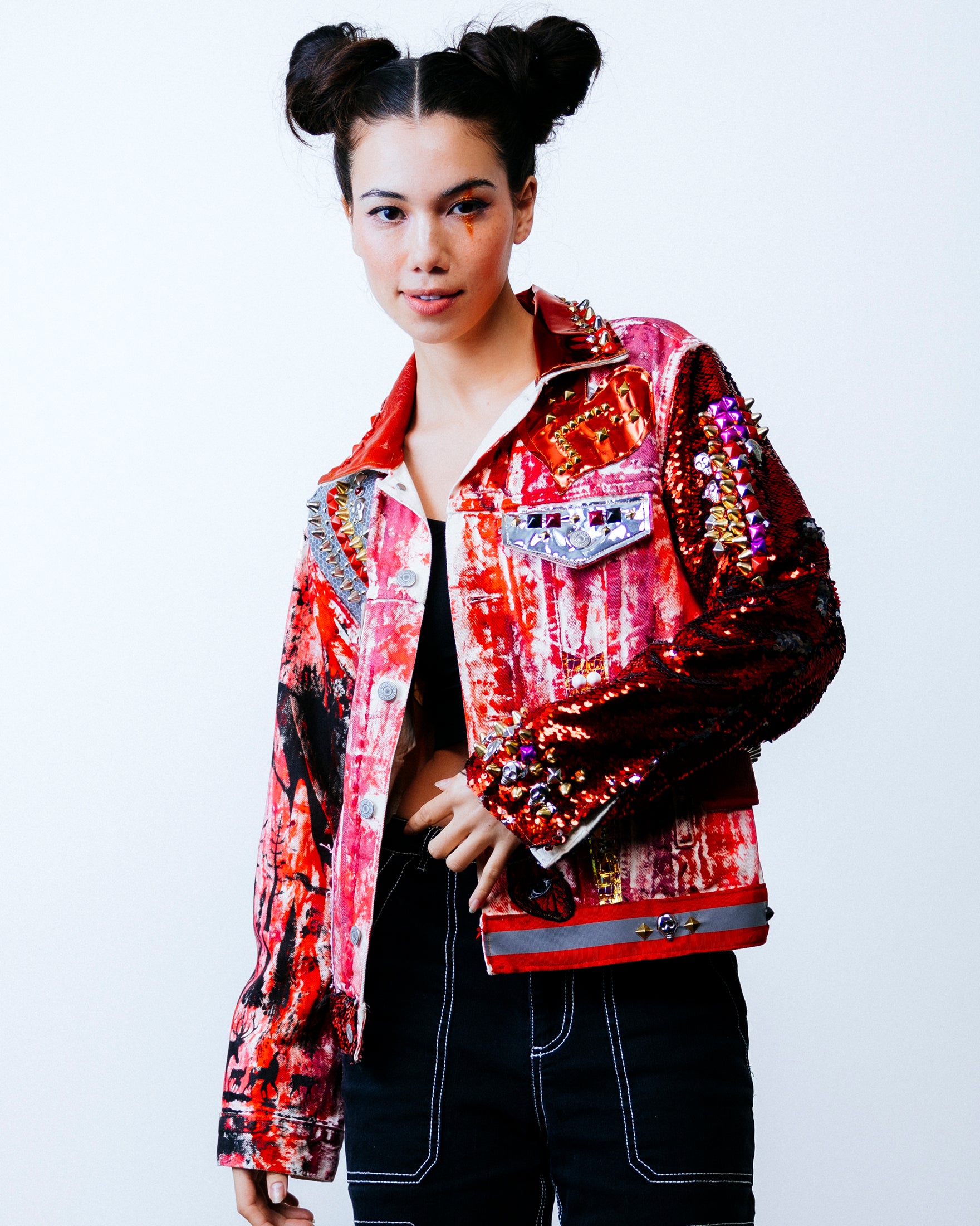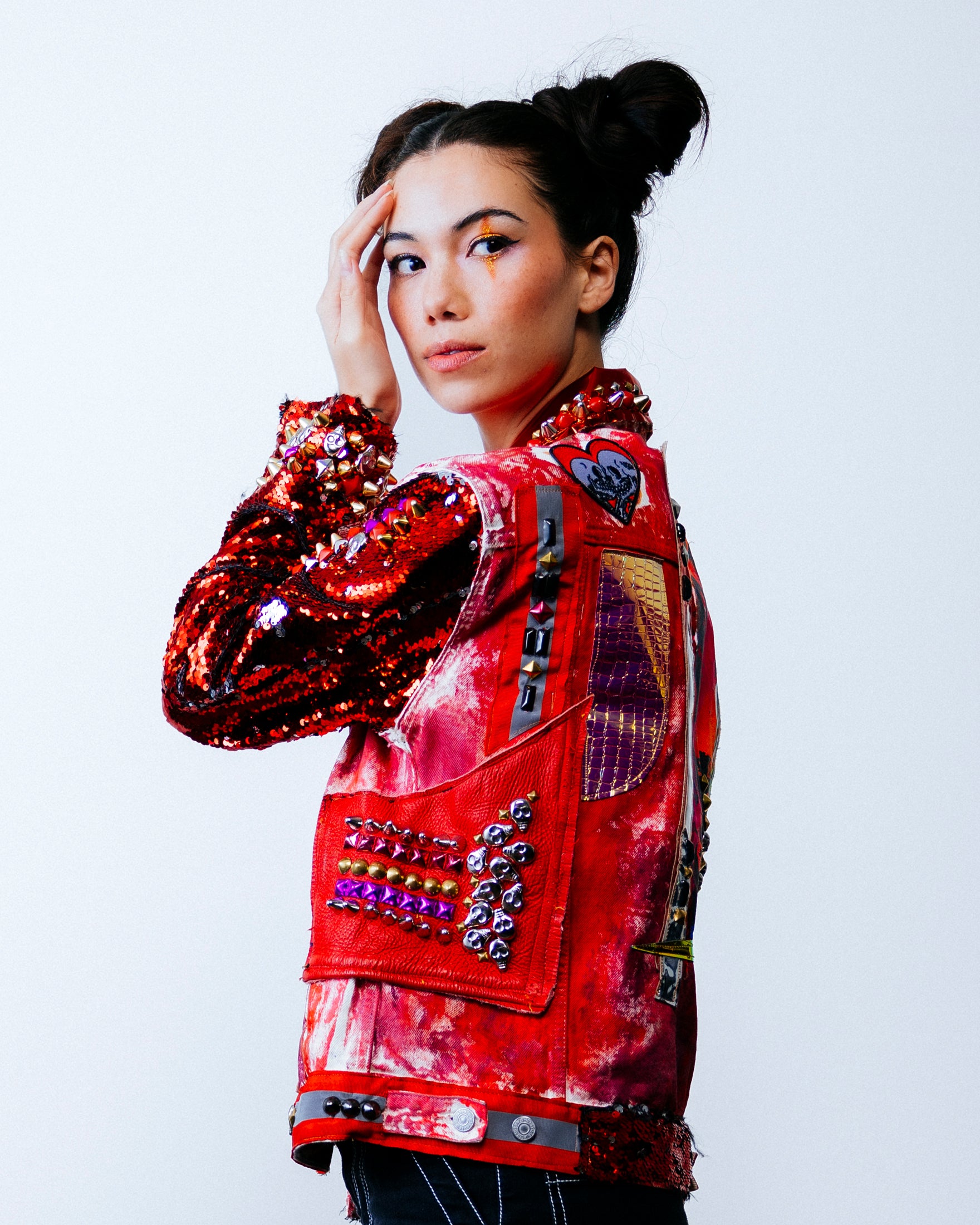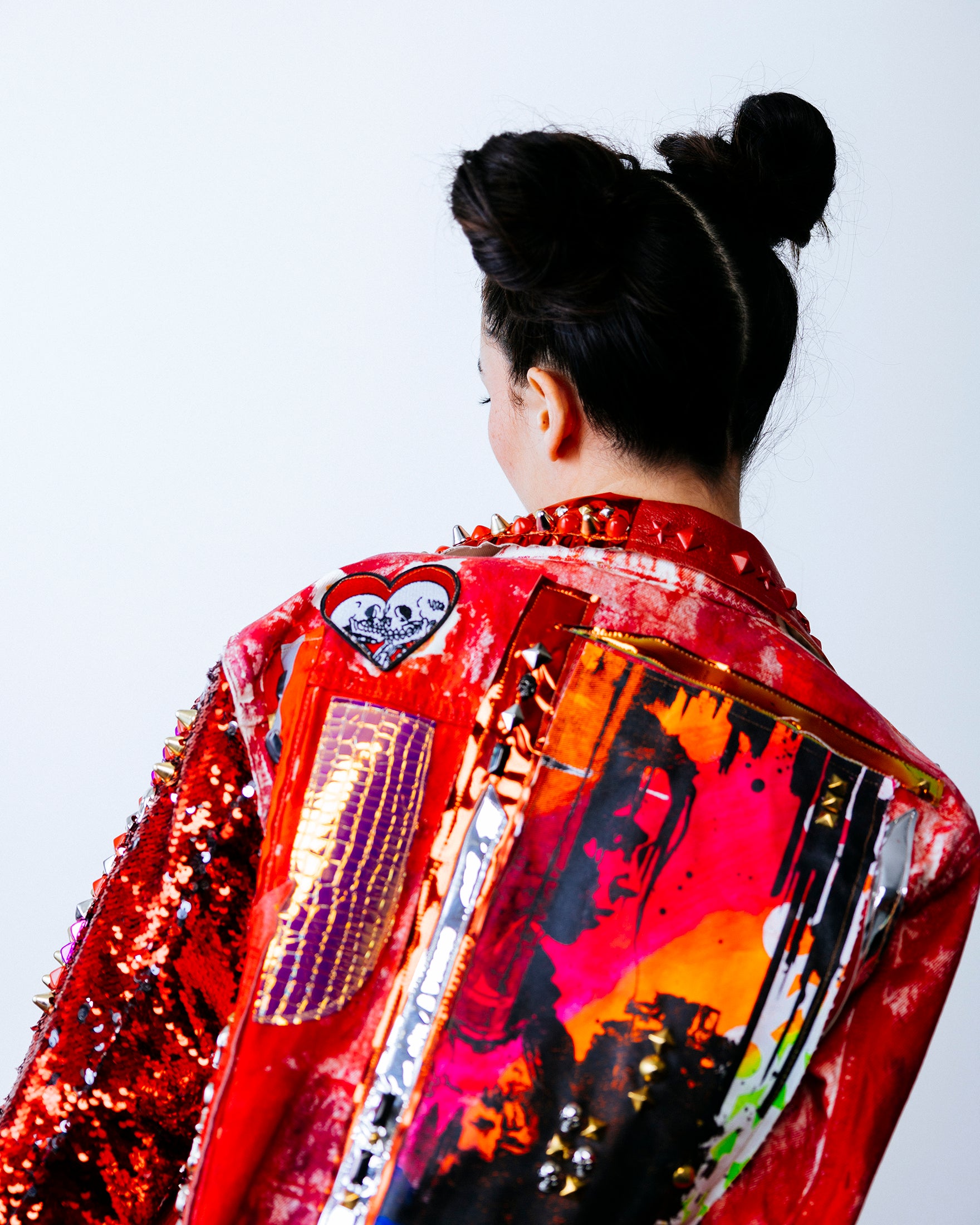 Exquisite detailing is spotlighted in this crimson wonder. The jacket was first hand-painted with a spattering of red, pink and purple. The inks are enhanced by a layer of black ancient cave art on the right sleeve. The left sleeve is a startling contrast of rough and smooth textures showcasing a 5mm flip red/silver sequins adorned with a variety of studs.