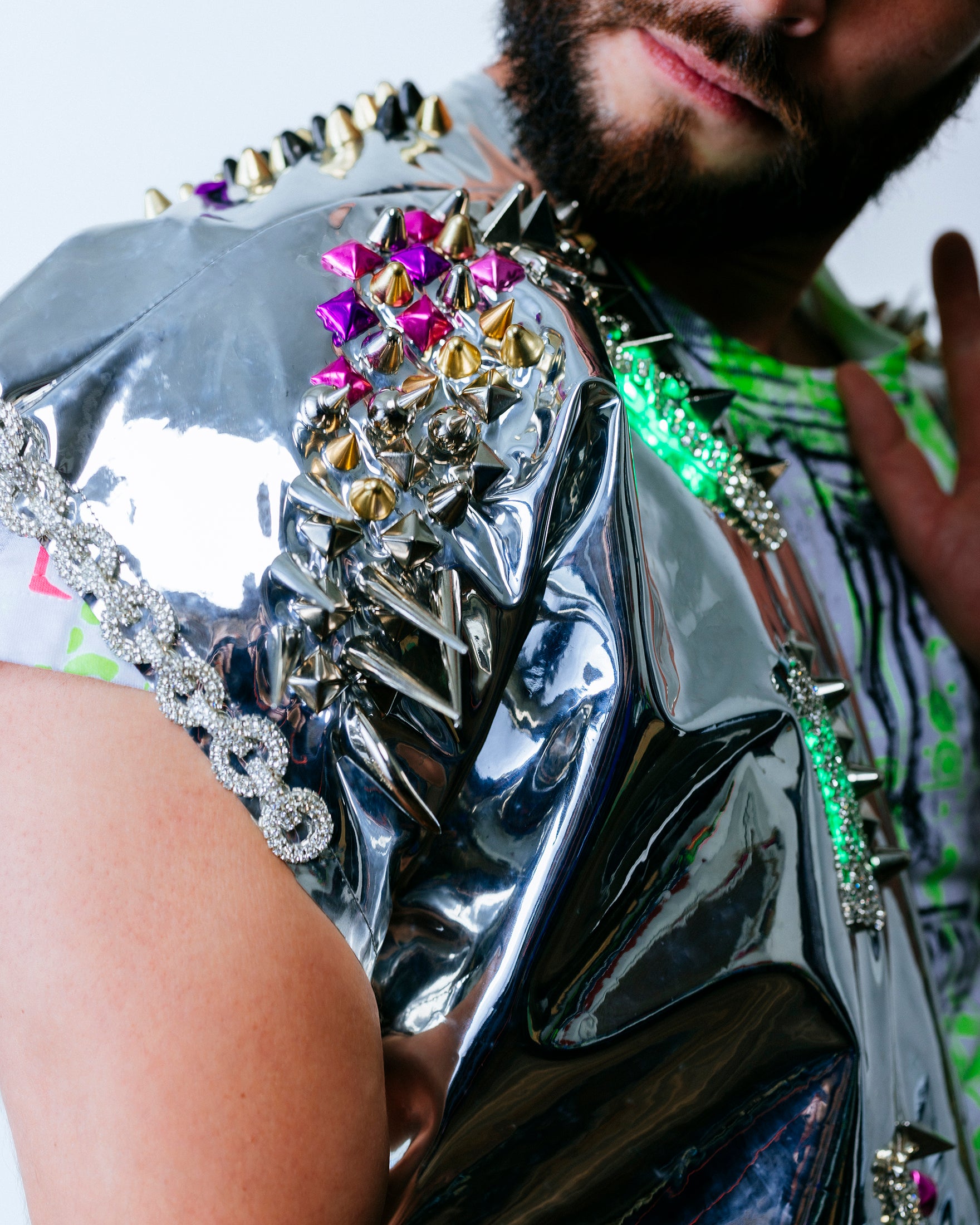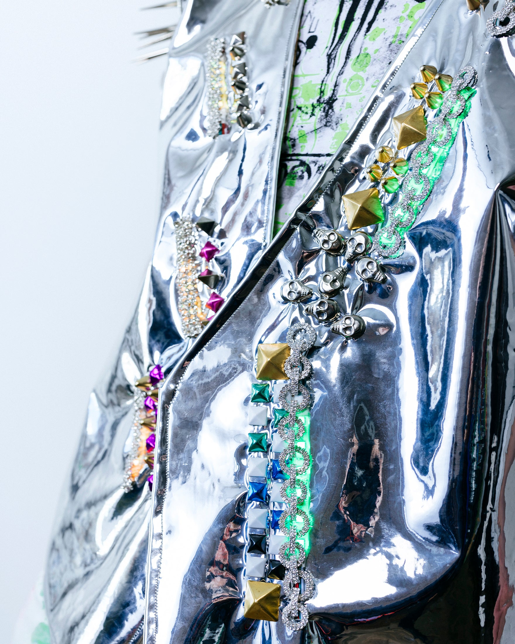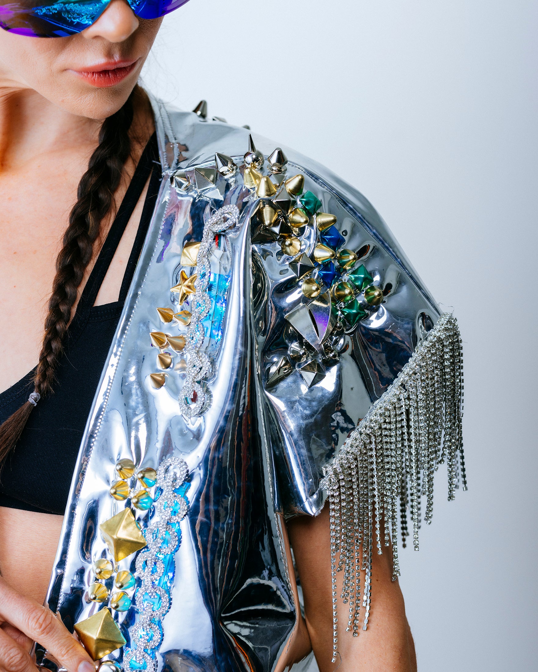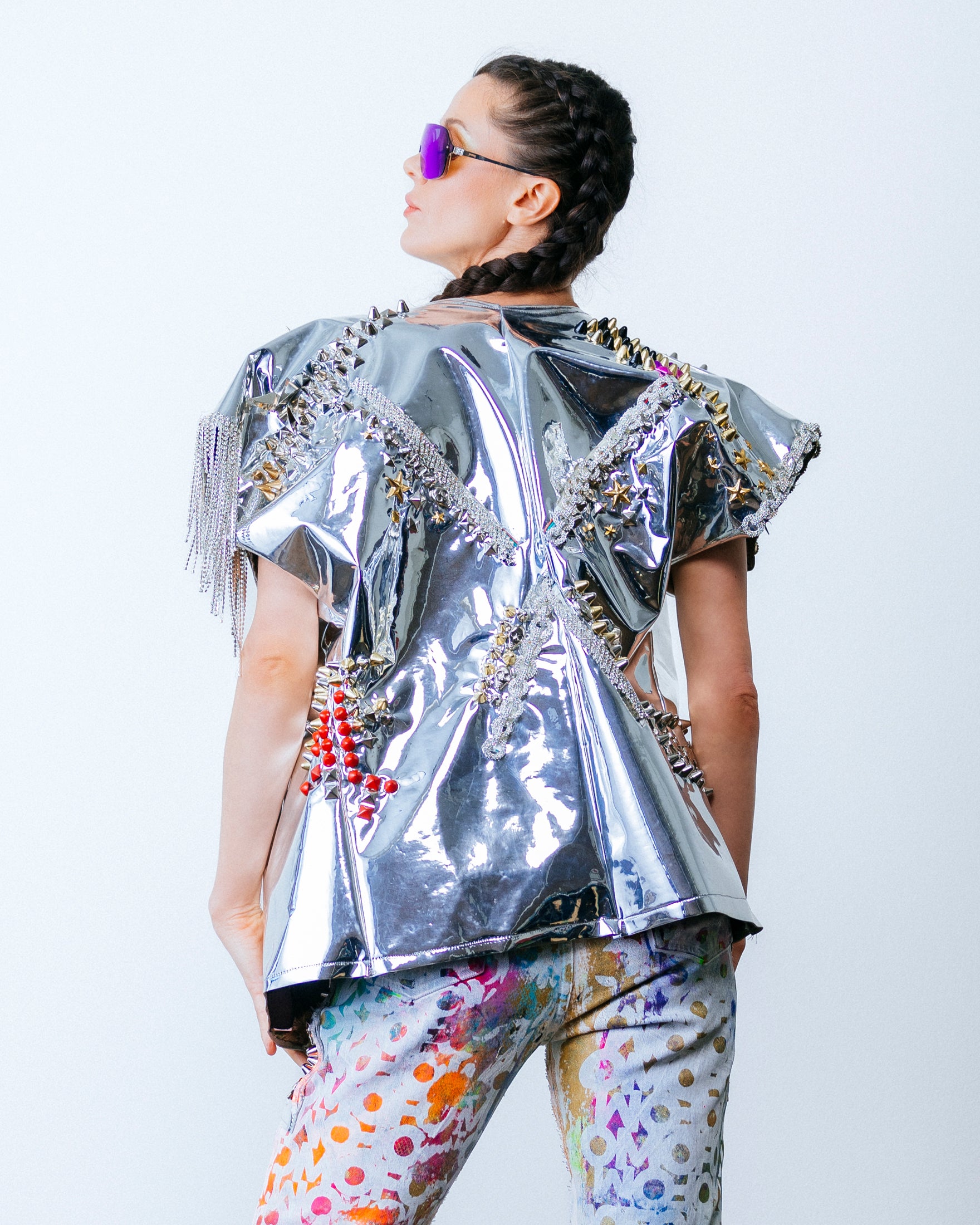 Our captivating chromono vest features patent silver-chrome mirror glossy vinyl, hand-studded and spiked in an asymmetrical front pattern and symmetrical back pattern, creating a stunning visual impact. The one size fits all chromono vest contains over 600 individually placed studs and spikes.