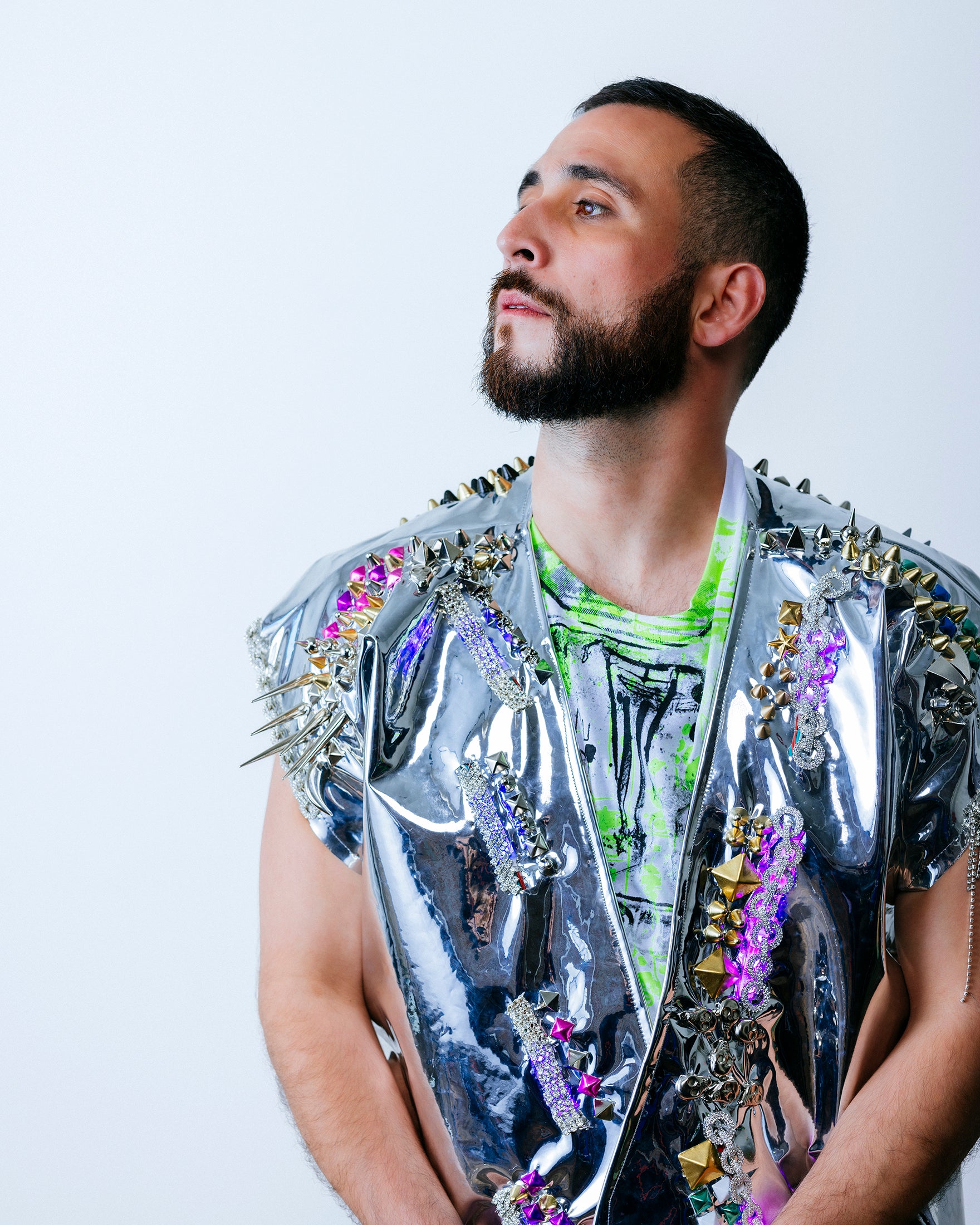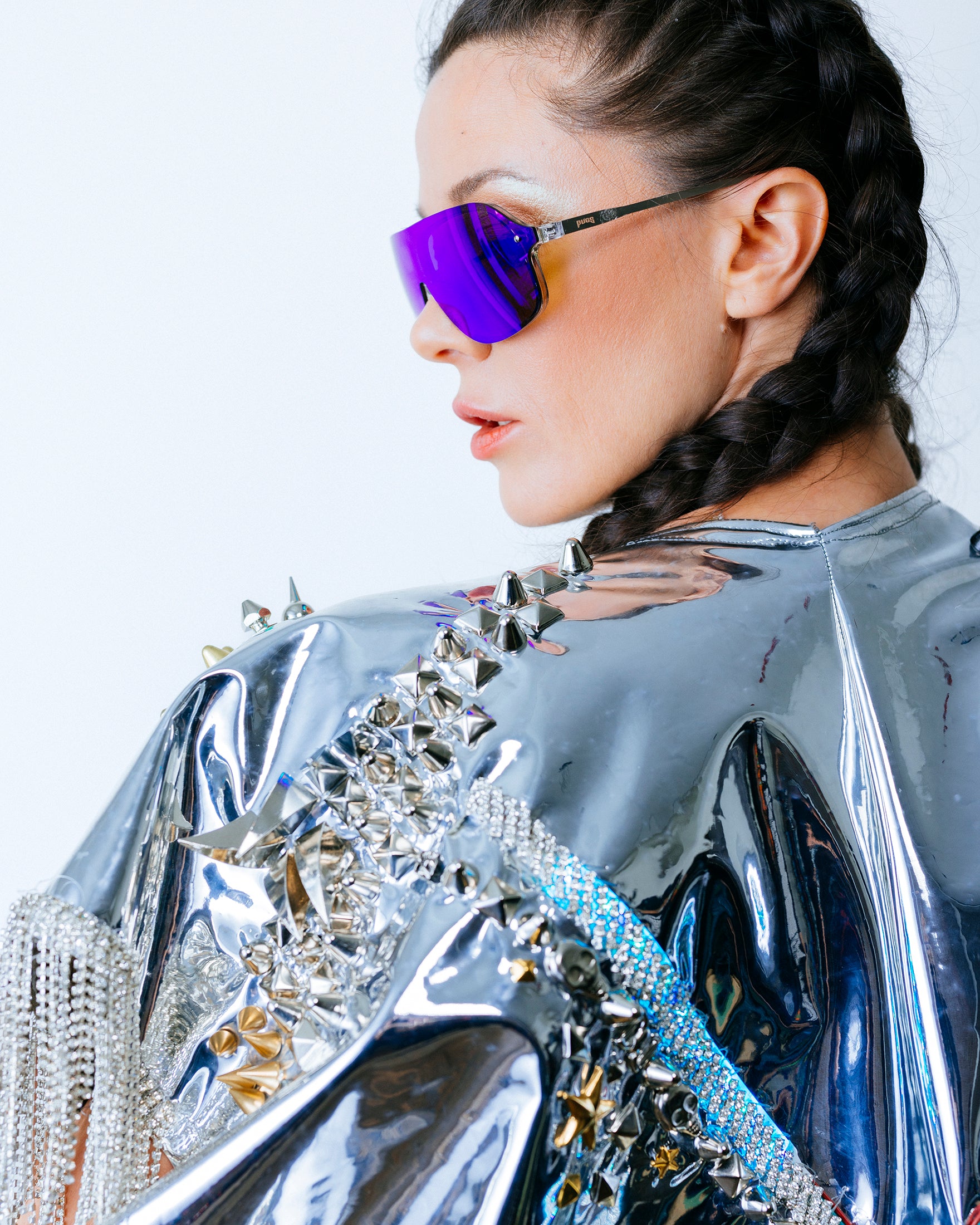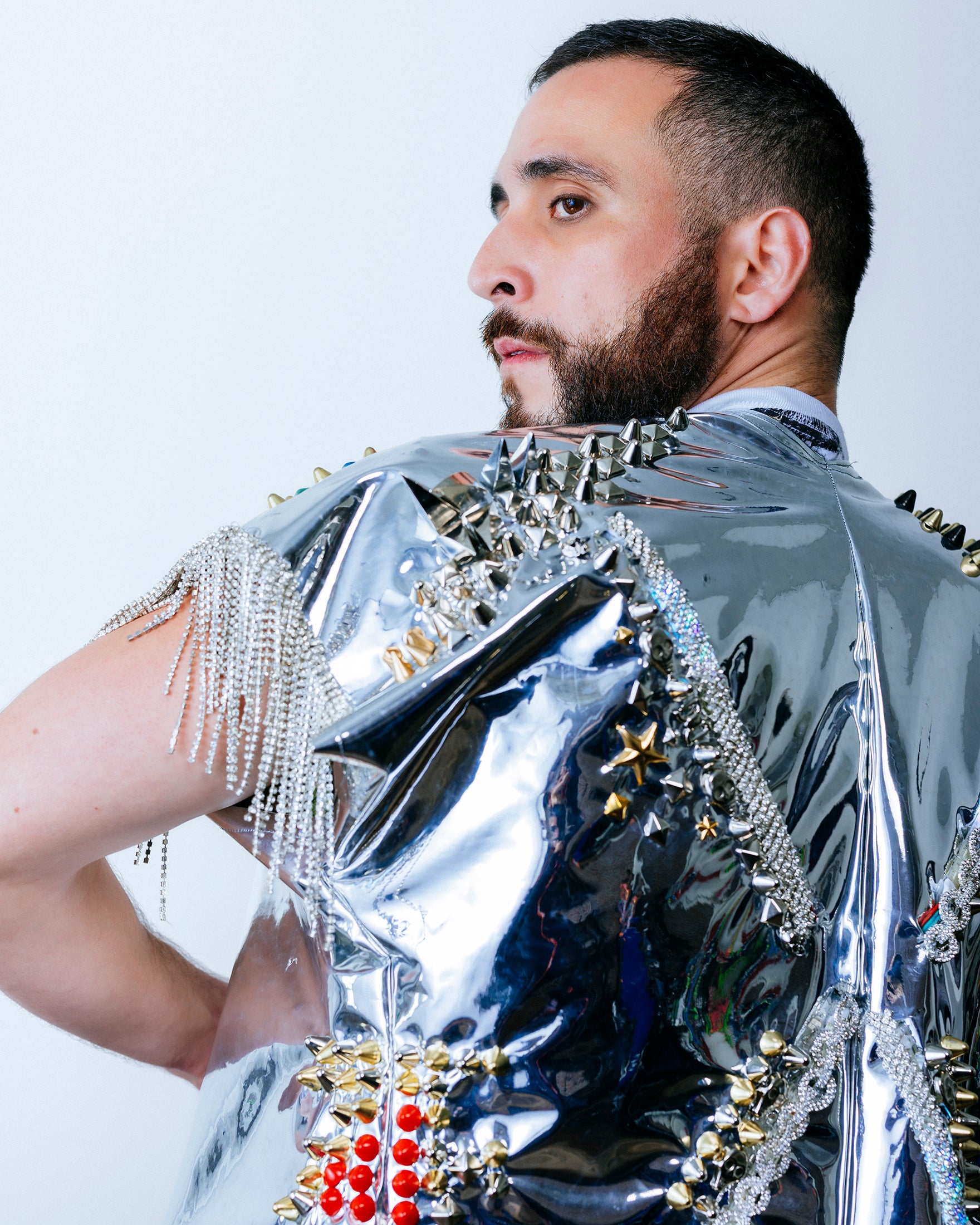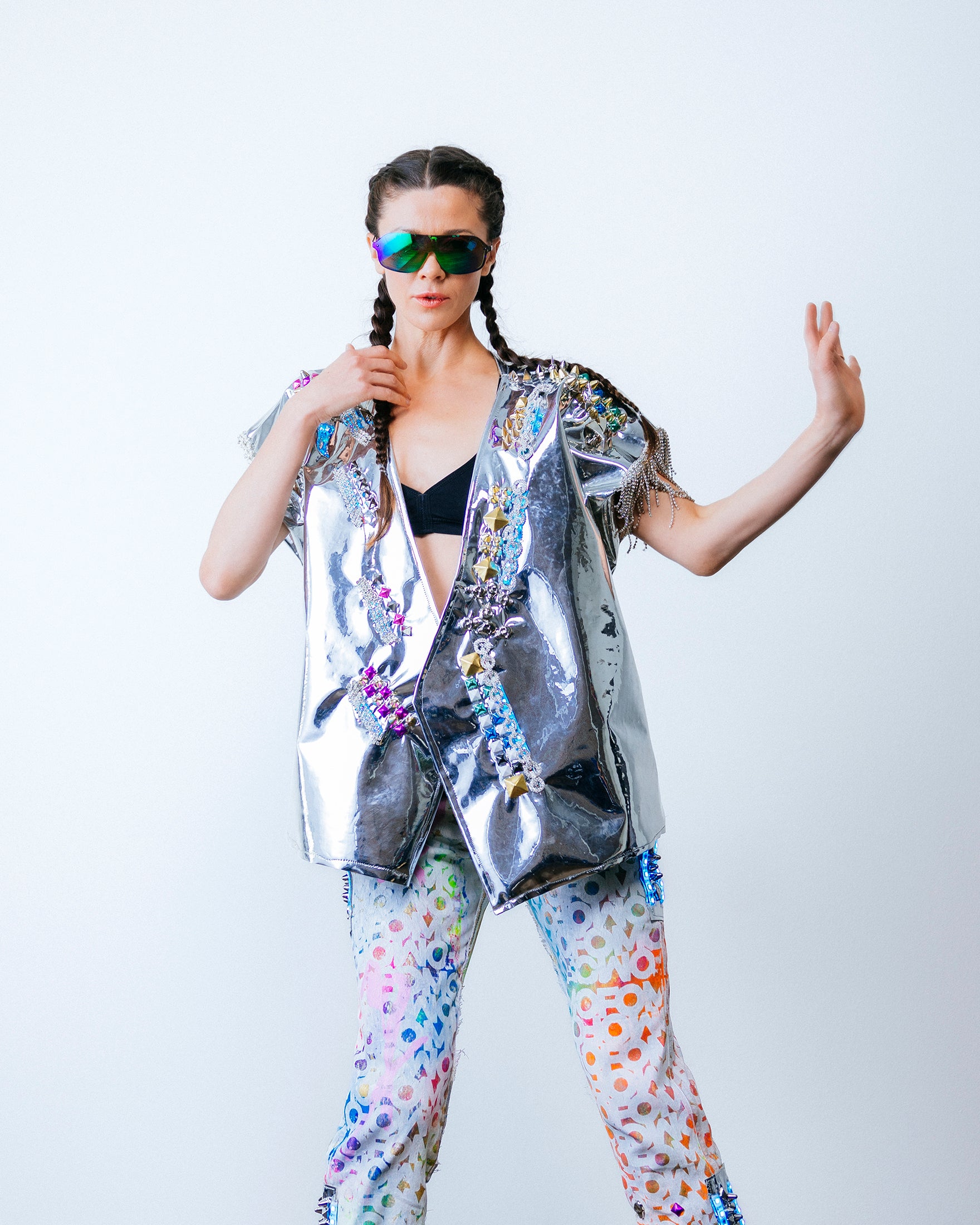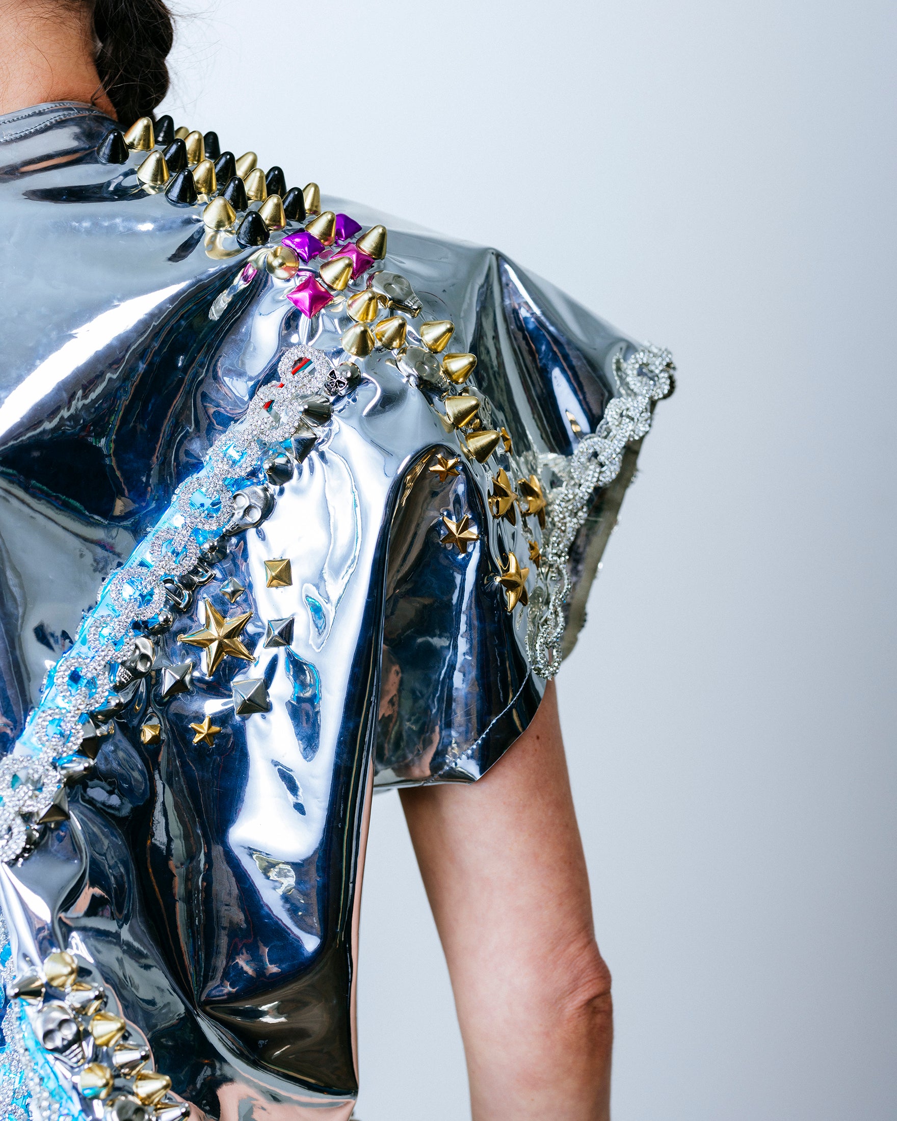 Our captivating chromono vest features patent silver-chrome mirror glossy vinyl, hand-studded and spiked in an asymmetrical front pattern and symmetrical back pattern, creating a stunning visual impact. The one size fits all chromono vest contains over 600 individually placed studs and spikes.