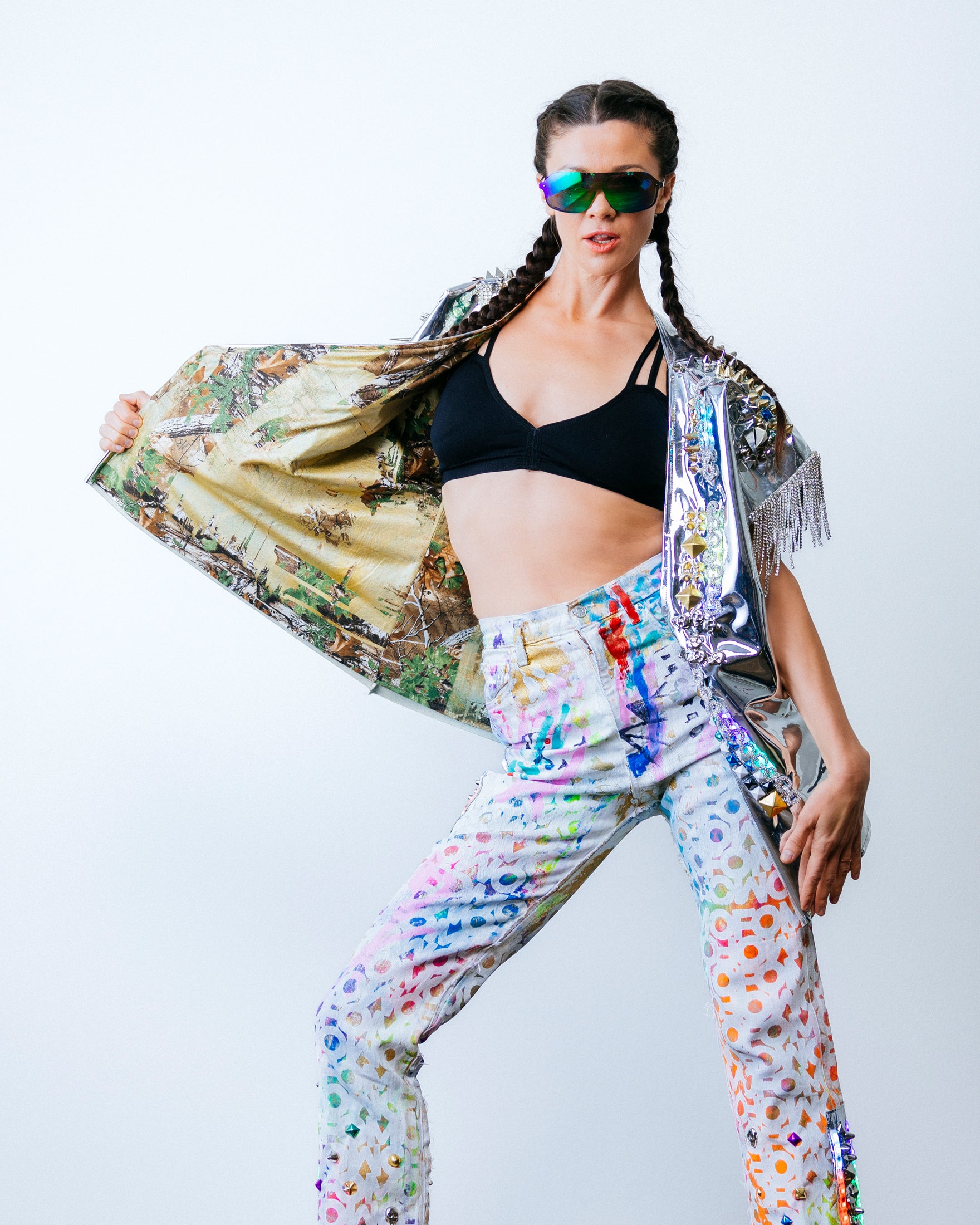 A hand-painted lining of tree camouflage graphics covered by a layer of gold feminine hero, in water-base ink, provides comfort and a luxurious finish. High-quality silver rhinestone 2 to 4.4" fringe on left shoulder and on right rhinestone circle chain add a finishing touch.