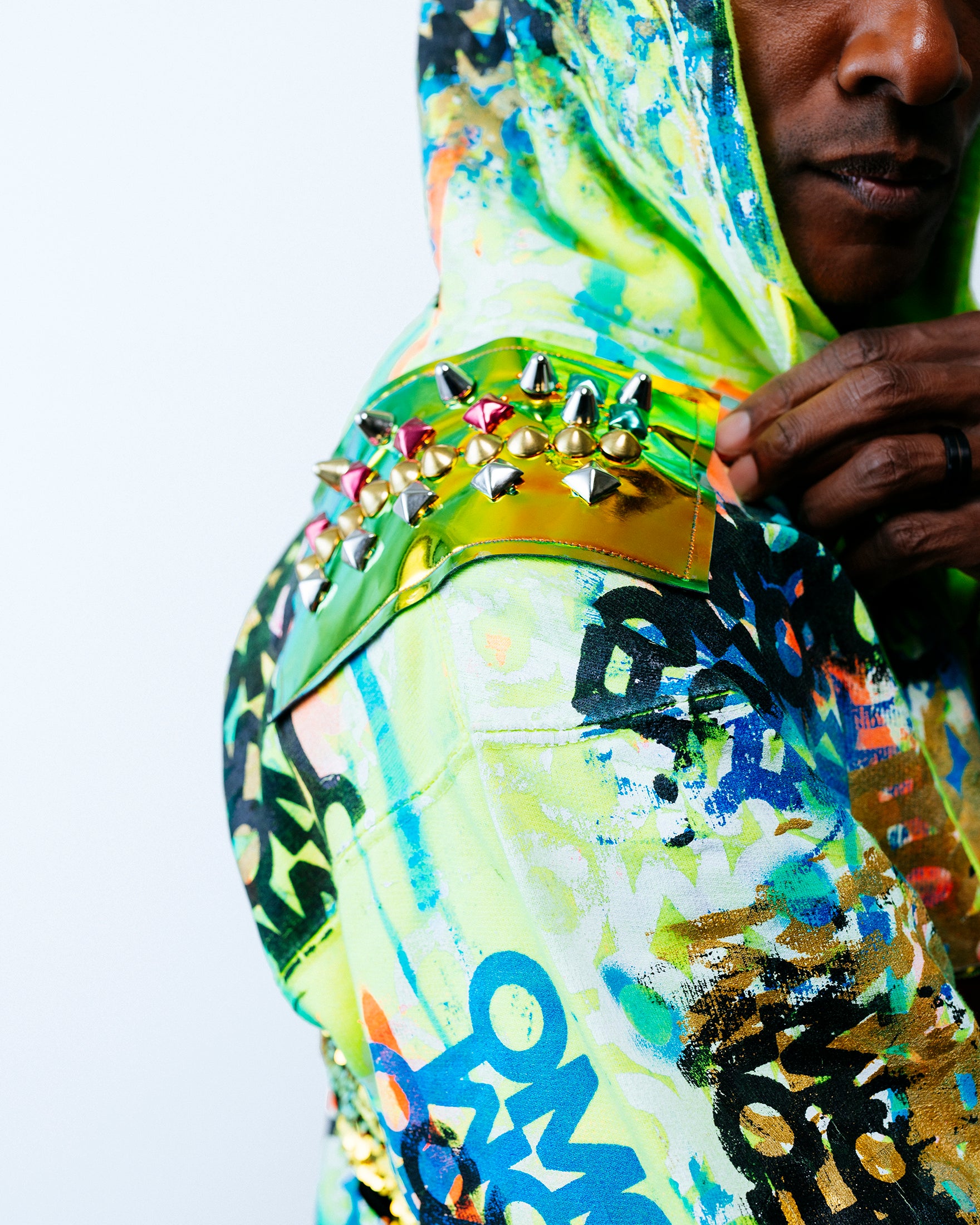 In our endeavor to create exceptional hoodies, we aimed to seamlessly blend various styles and textiles. The neon base of the hoodie acts as a vibrant canvas. The front right and back panels are adorned with meticulous hand-printing, featuring a base layer of FOMO typography in white water base ink. The addition of gold, blue, and black layers of the same graphic adds to the chaos. In juxtaposition to those tones, the left side is adorned with radiant gold and red 5mm flip sequins on black velvet, crafting daytime streetwear that gleams brilliantly in the sunlight.