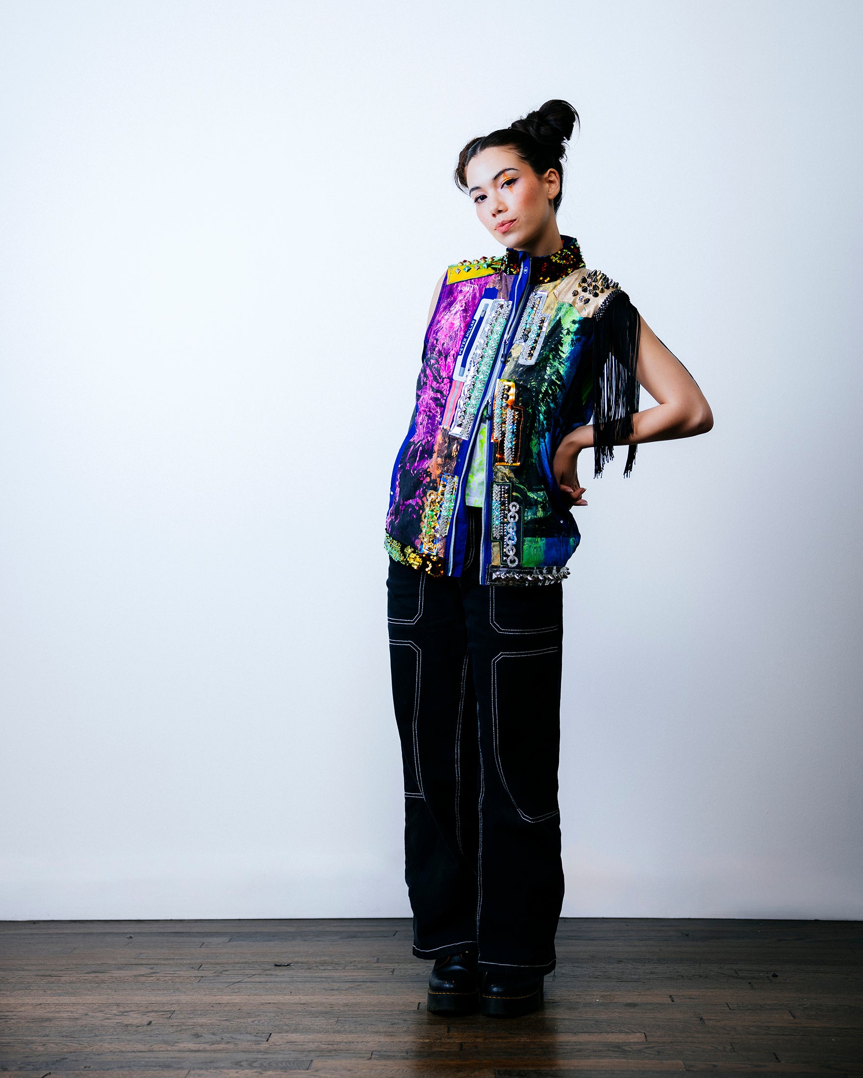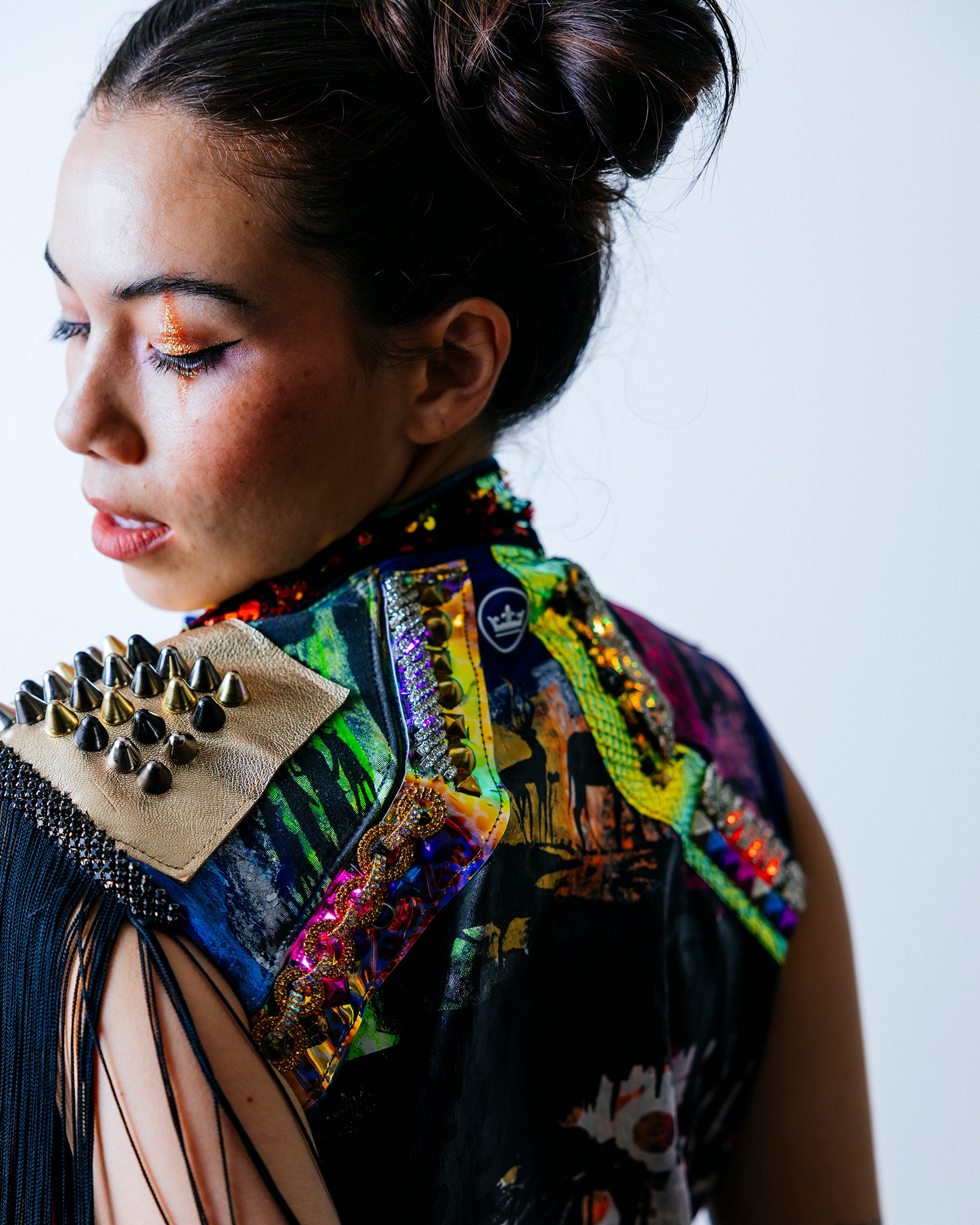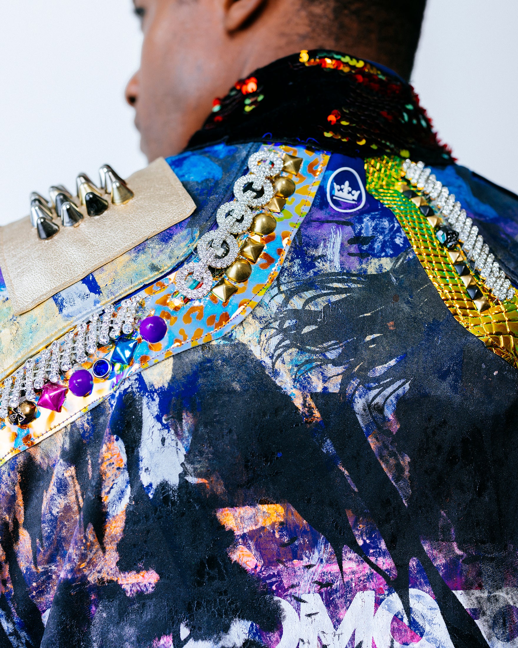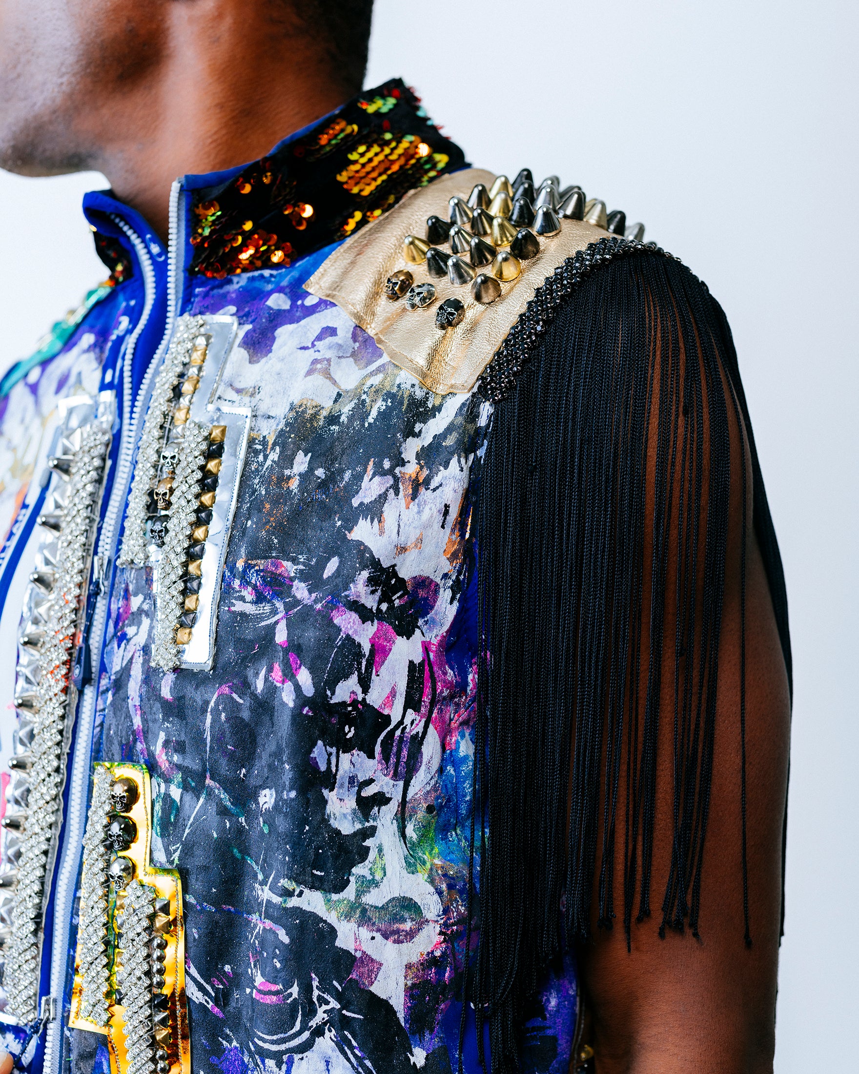 A variety of chrome mirror vinyl panels cut in a lightning bolt pattern decorate the front. On the left side are dark web overlays that house LEDs covered with rhinestone crystals. A studded gold foiled leather overlay adorns the left shoulder, along with 12” black fringe. On the right shoulder is an anodized studded sun-chrome overlay. On the back are purple-blue holographic leopard vinyl overlays with stud detailing. The collar is 5mm flip red/gold sequins on black velvet.