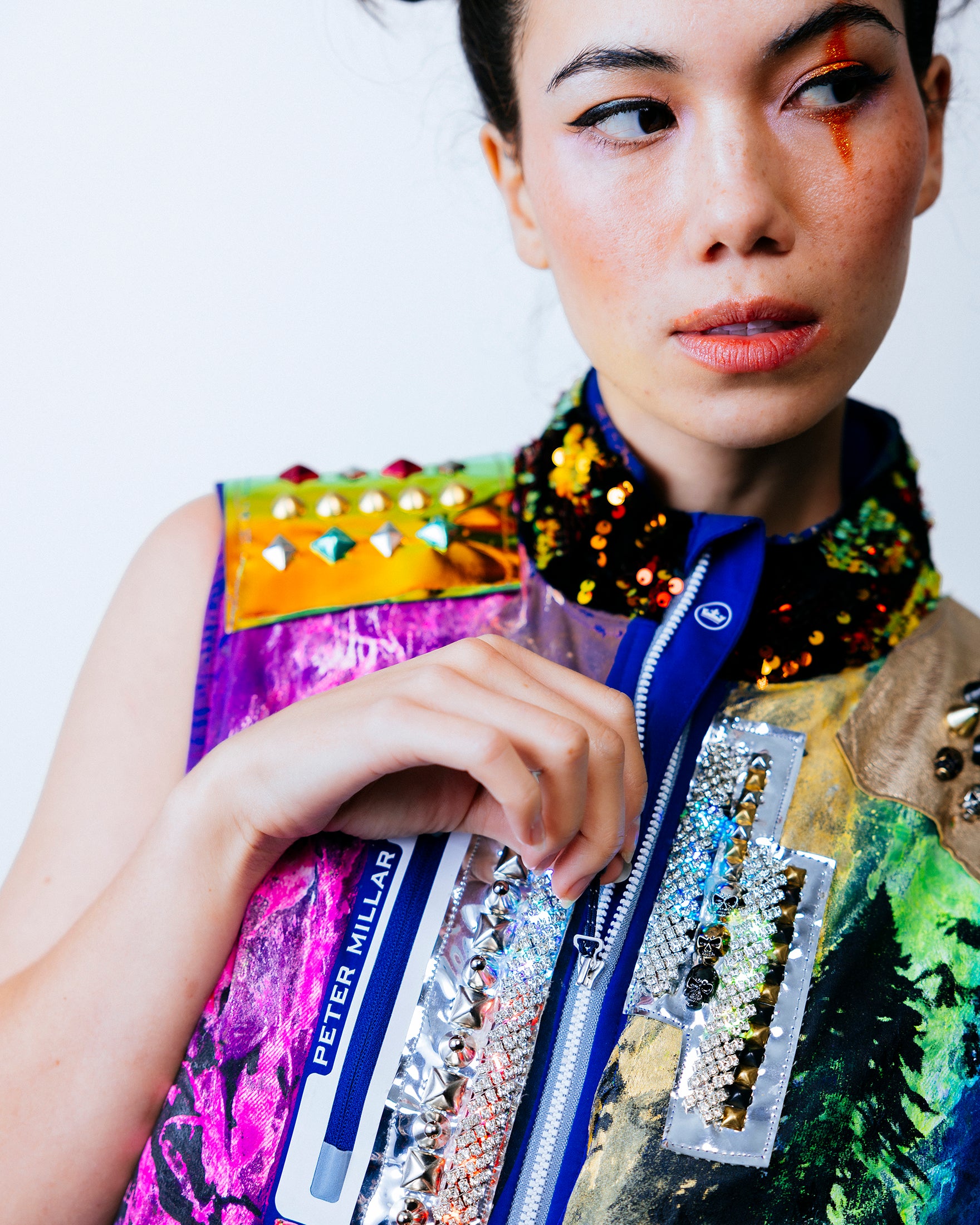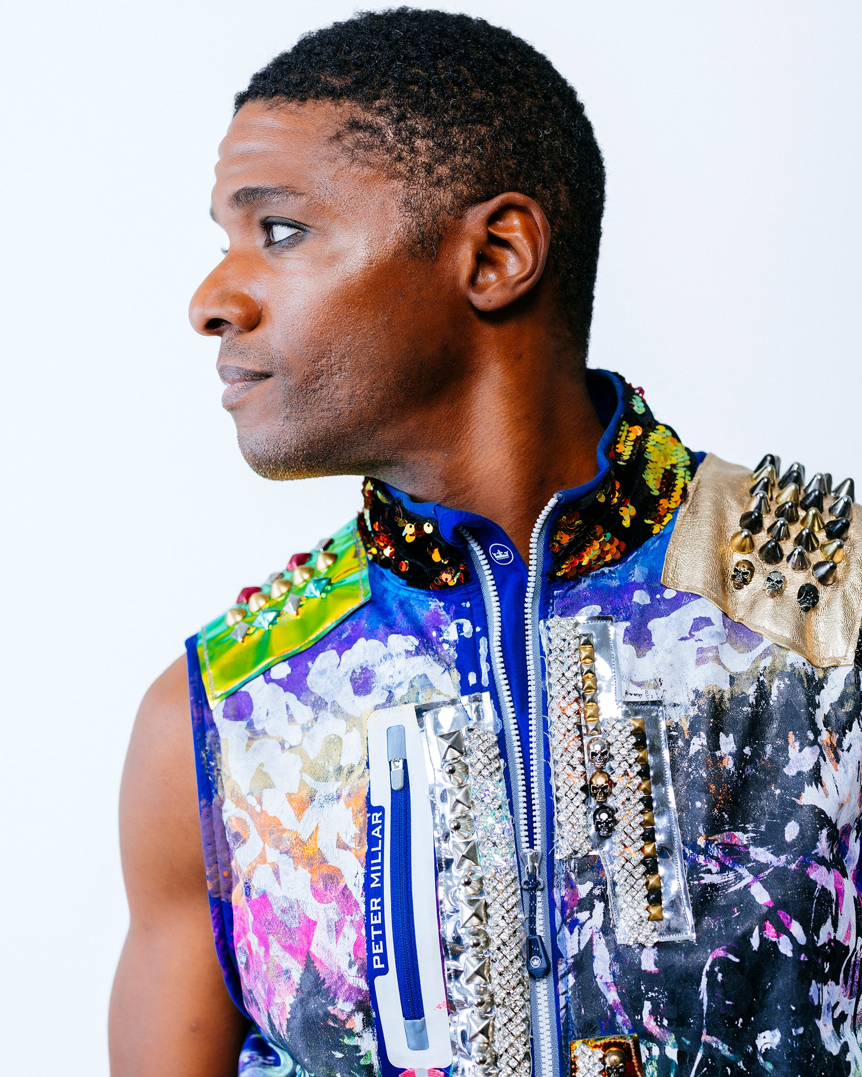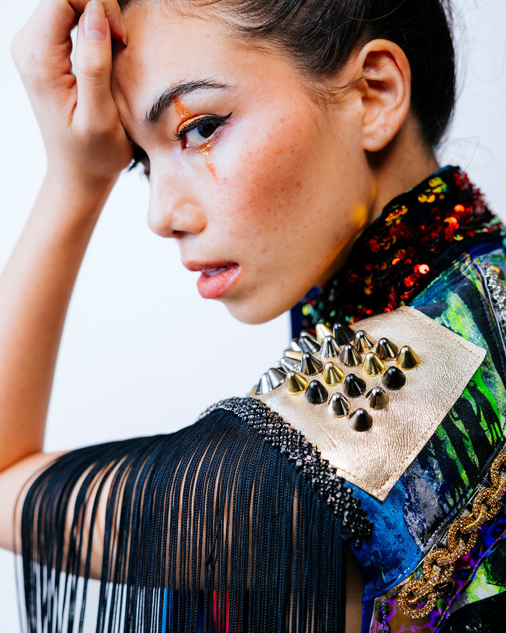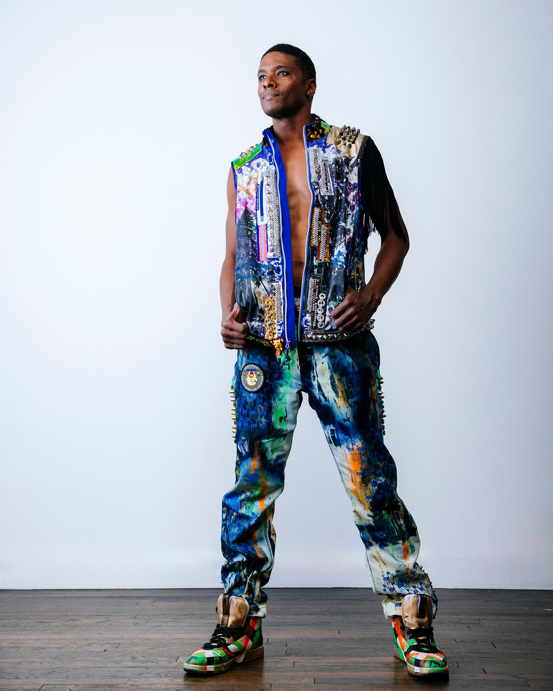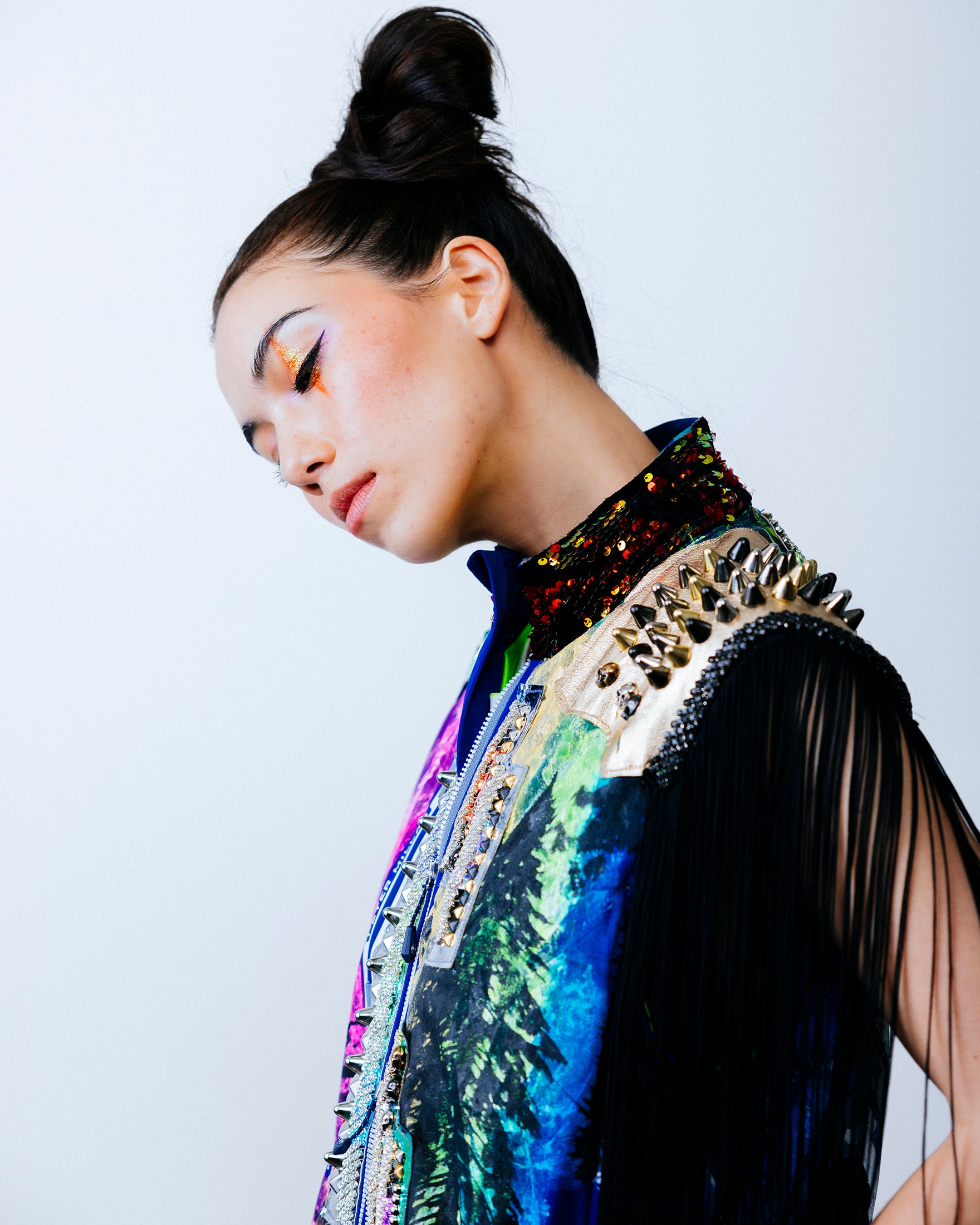 A variety of chrome mirror vinyl panels cut in a lightning bolt pattern decorate the front. On the left side are dark web overlays that house LEDs covered with rhinestone crystals. A studded gold foiled leather overlay adorns the left shoulder, along with 12” black fringe. On the right shoulder is an anodized studded sun-chrome overlay. On the back are purple-blue holographic leopard vinyl overlays with stud detailing. The collar is 5mm flip red/gold sequins on black velvet.