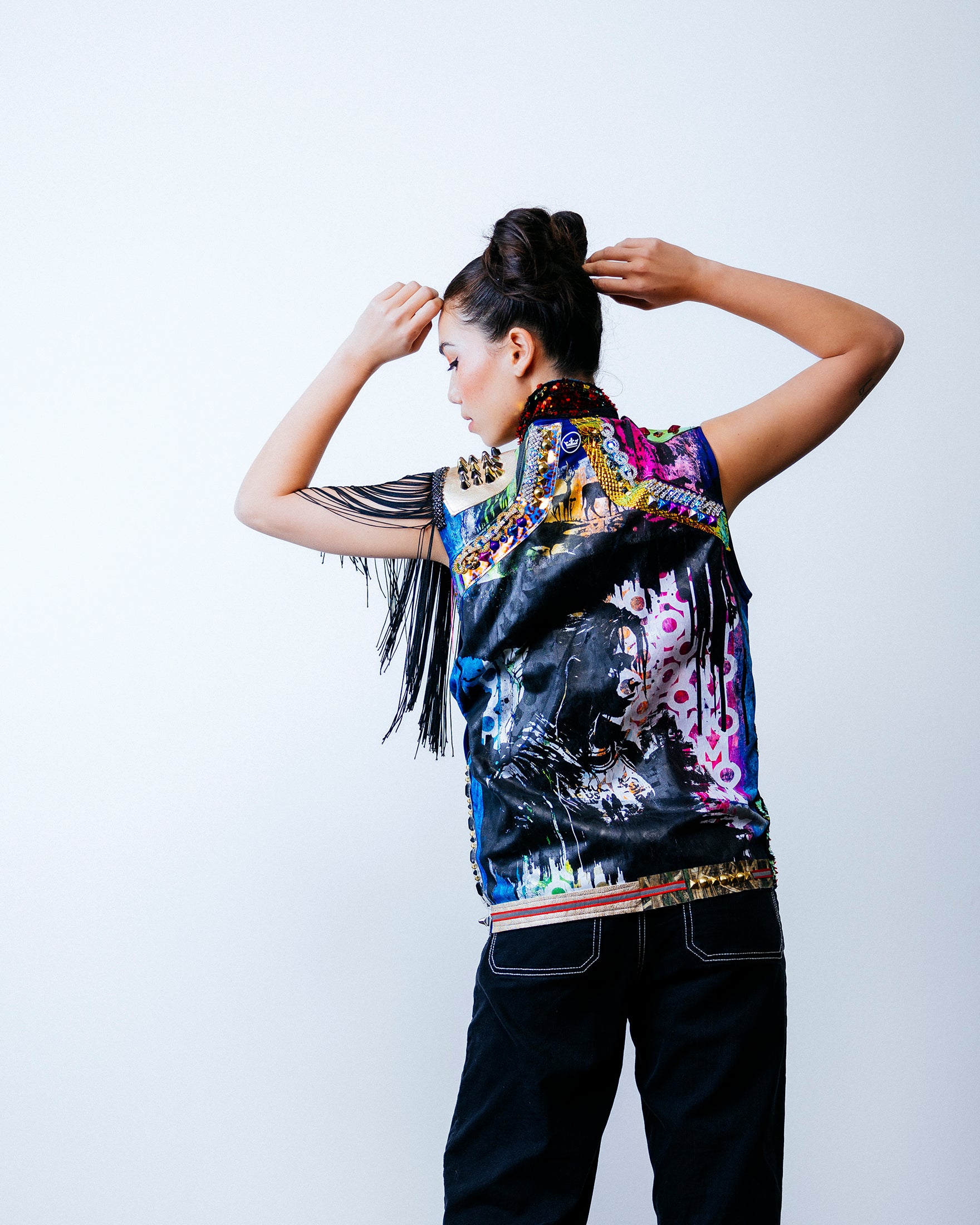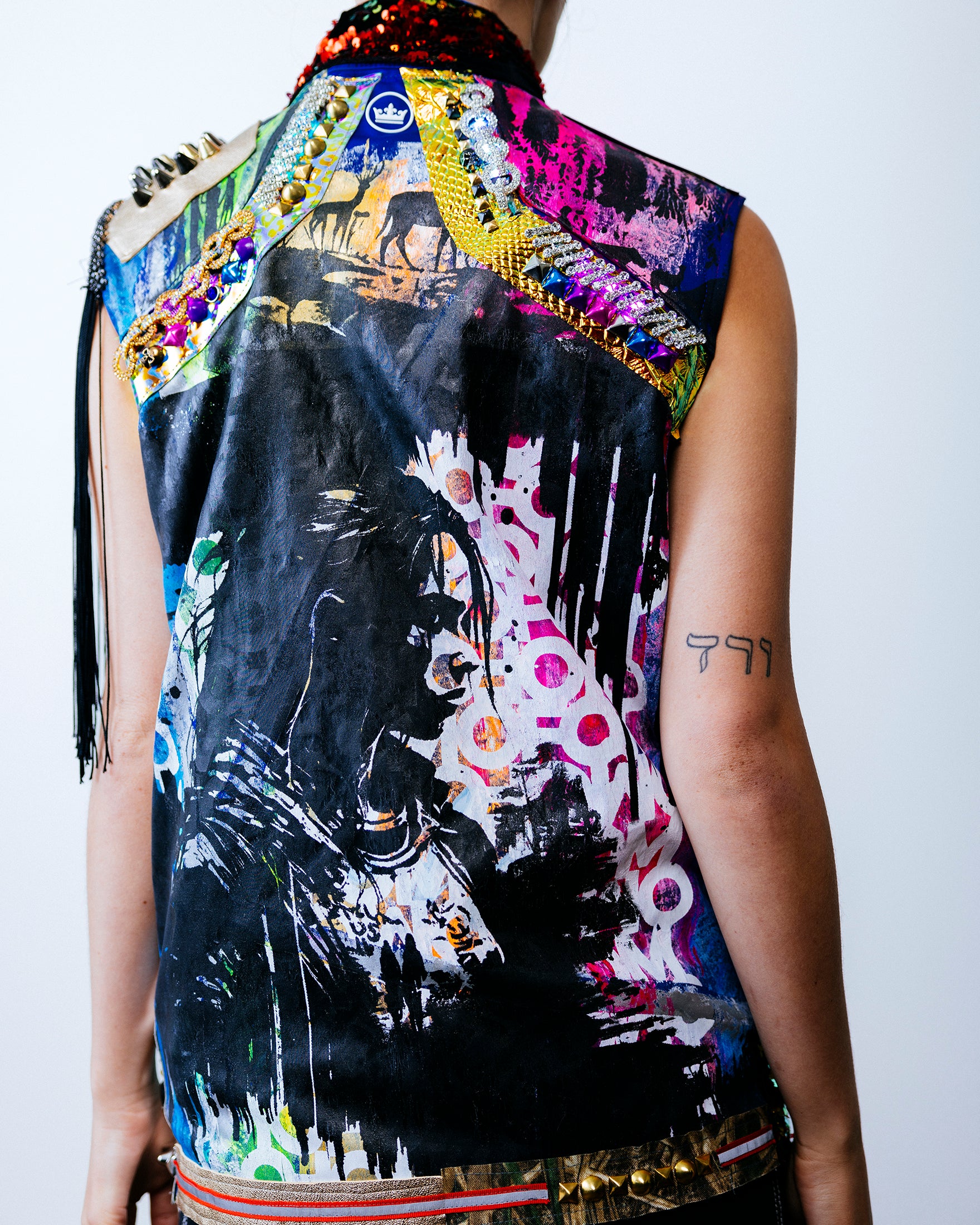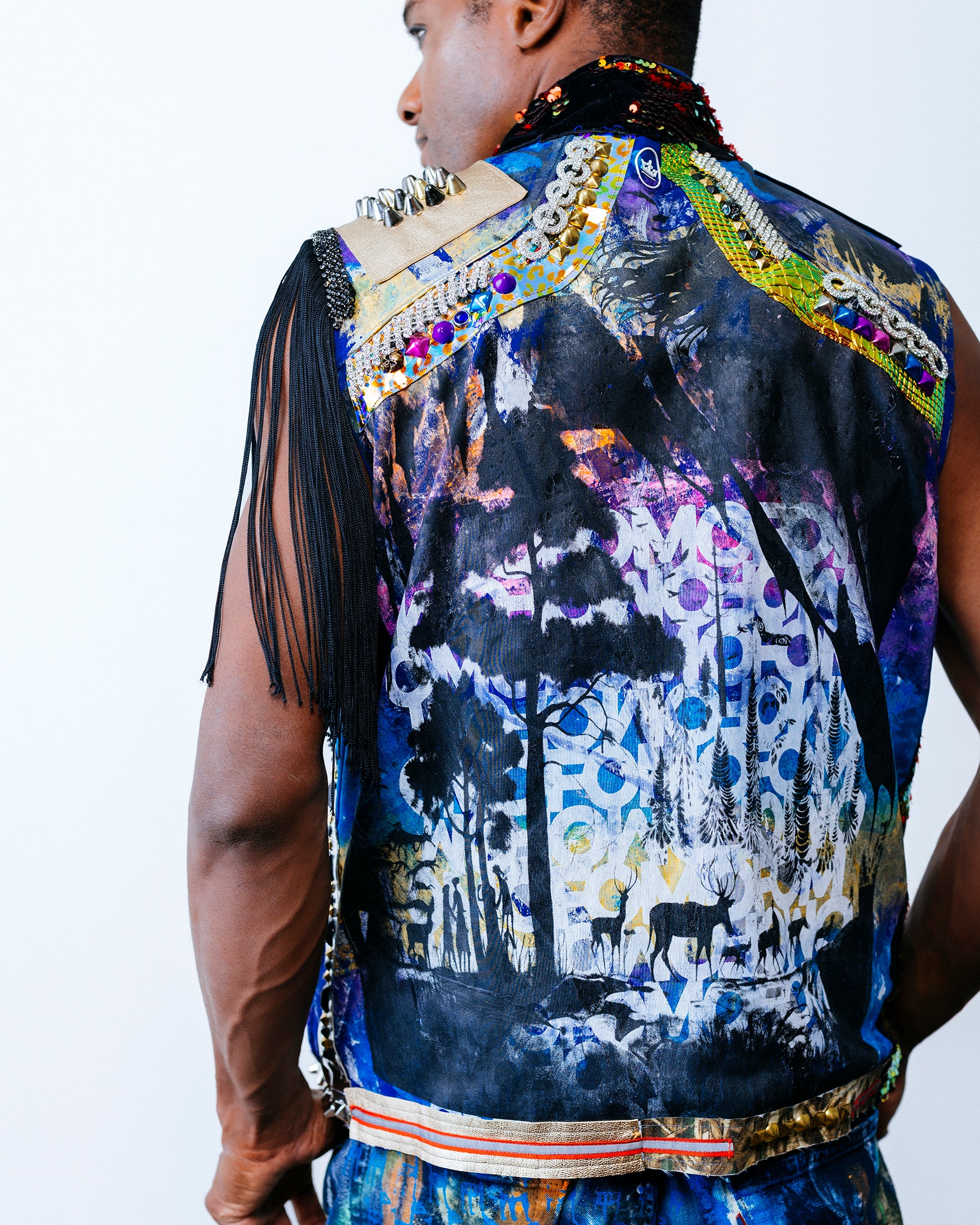 This vest takes active wear to another level adorned with a variety of panels, overlays and stud work. The entire vest is hand-painted with a white under base. Pink, green and blue inks are then applied all over, with accents of the white typographic FOMO layered on top. A fourth and final layer of black ancient cave art is layered on top to finish this multi-layered intricate screen printing. Each painting is unique. A true 1 of 1 piece of wearable art.
