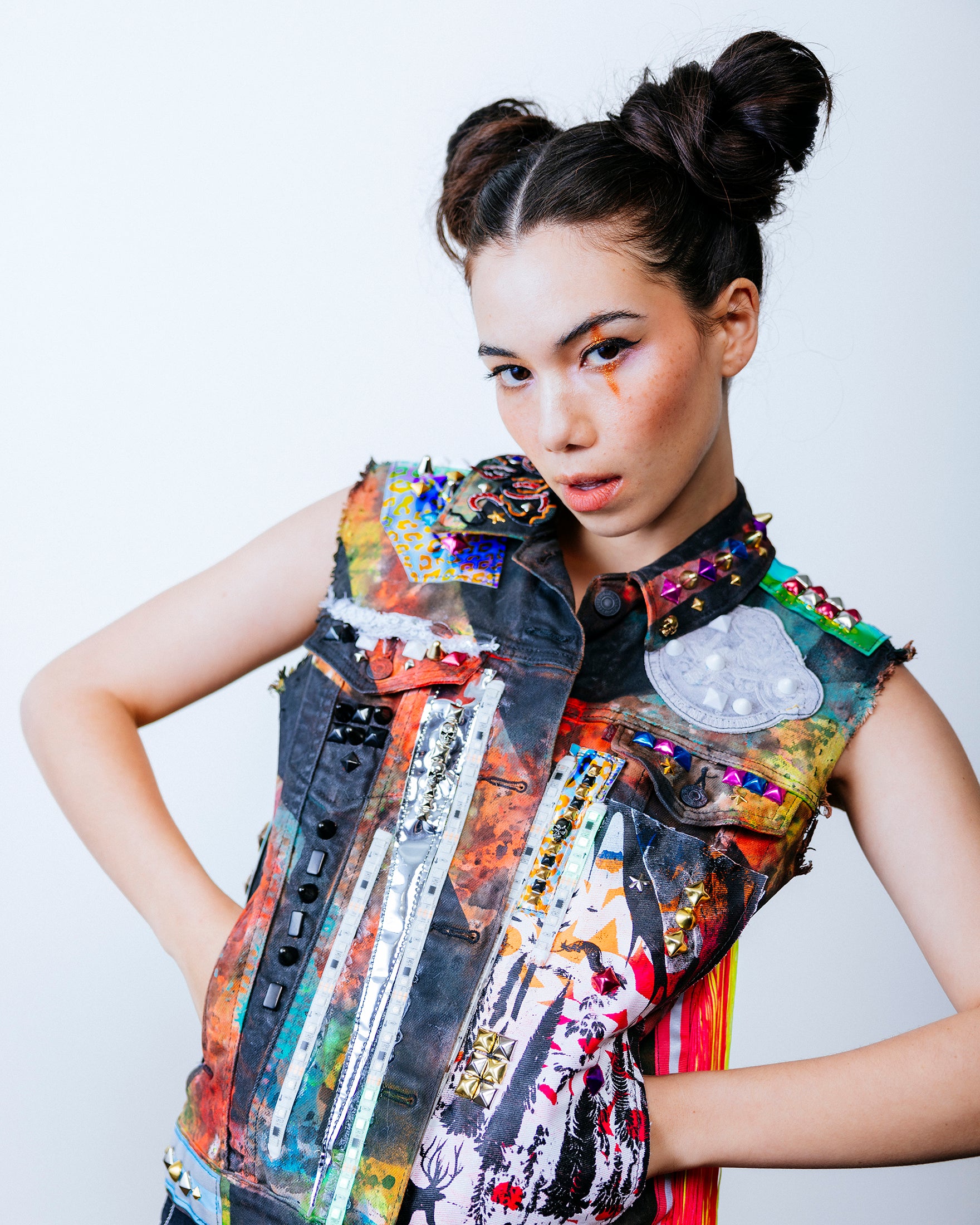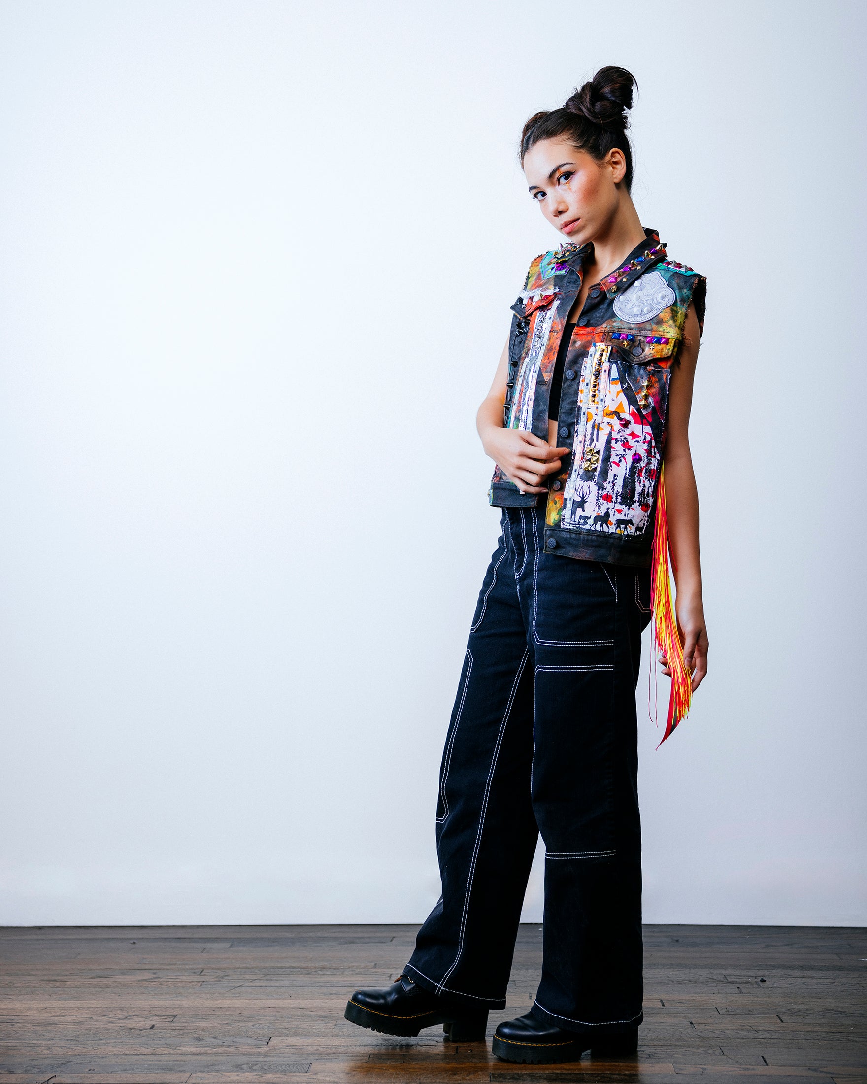 The back of the vest is white FOMO printed denim, white sequins and studded white faux gator to add a brightness to the multicolored world along side another studded denim mural.