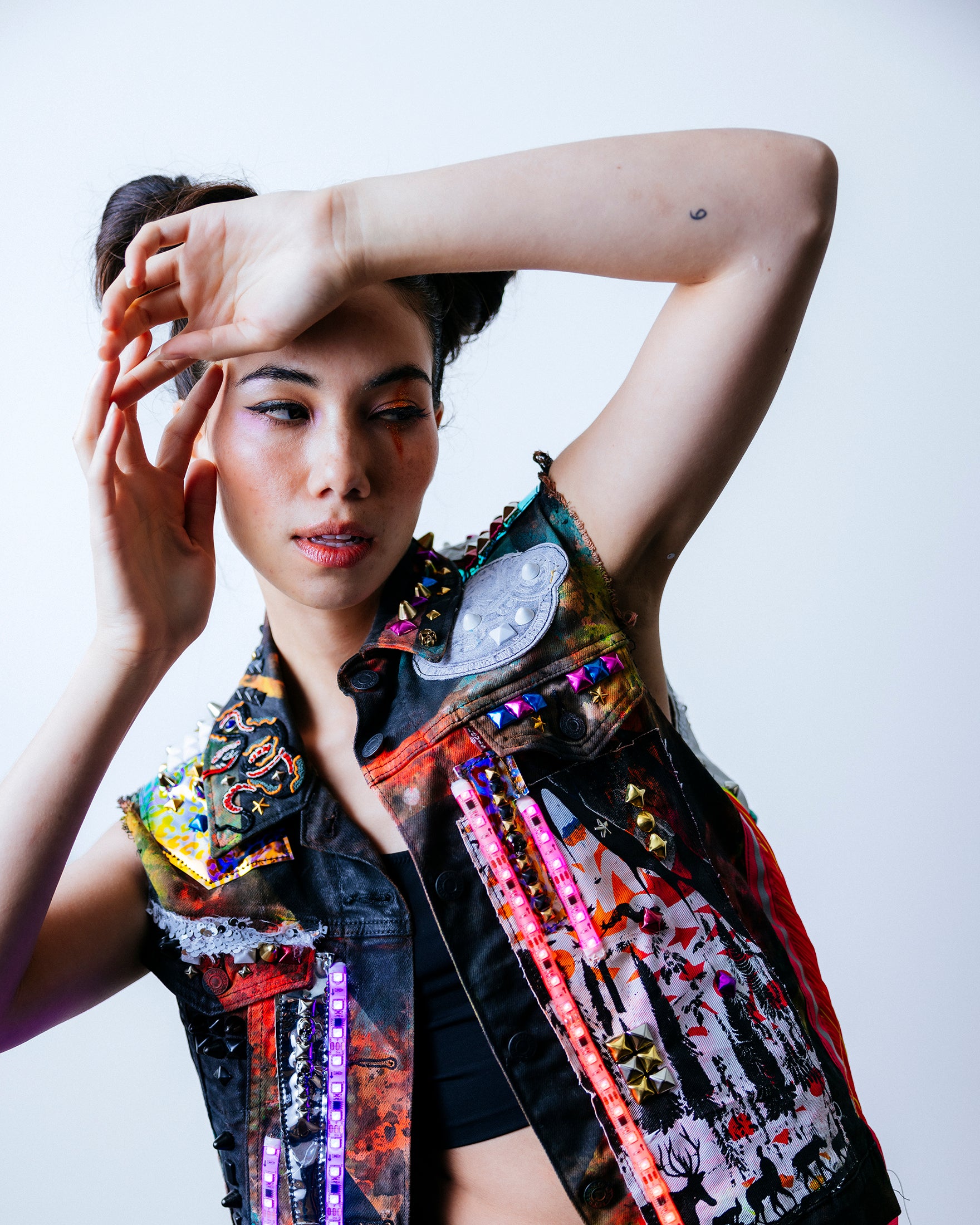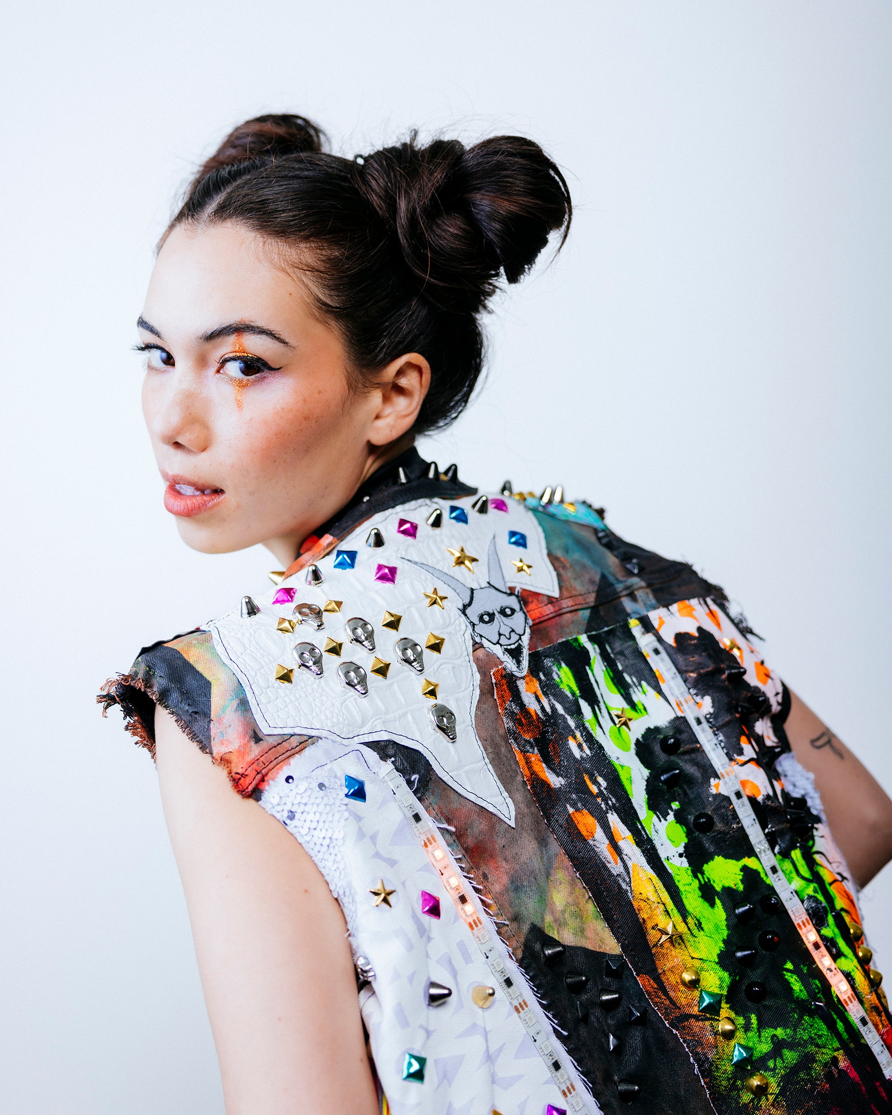 On the right shoulder is a purple-blue holographic leopard vinyl overlay with stud detailing. Multicolored pocket flap studding and silver chrome studding along the front opening provide definition for the LED lighting.