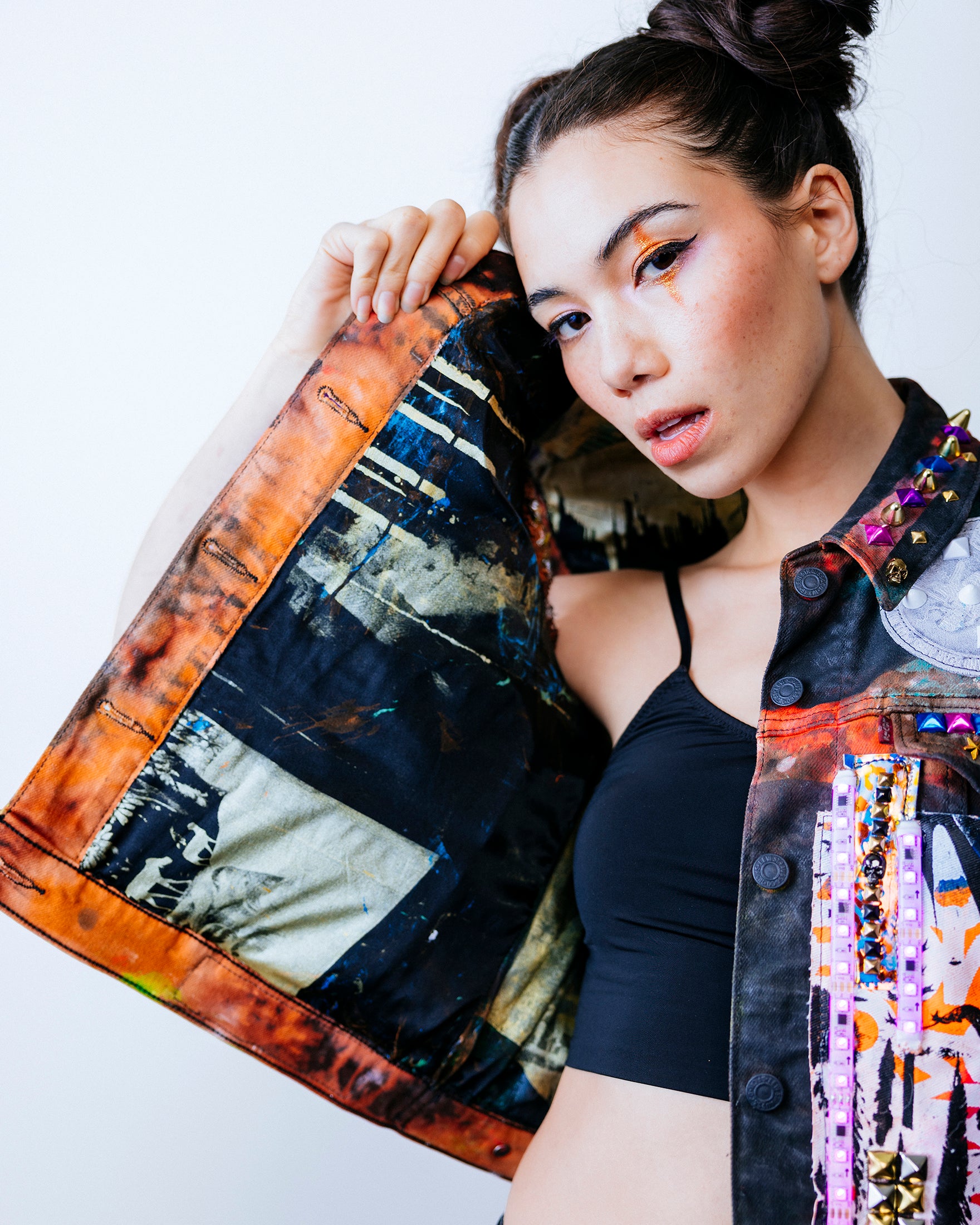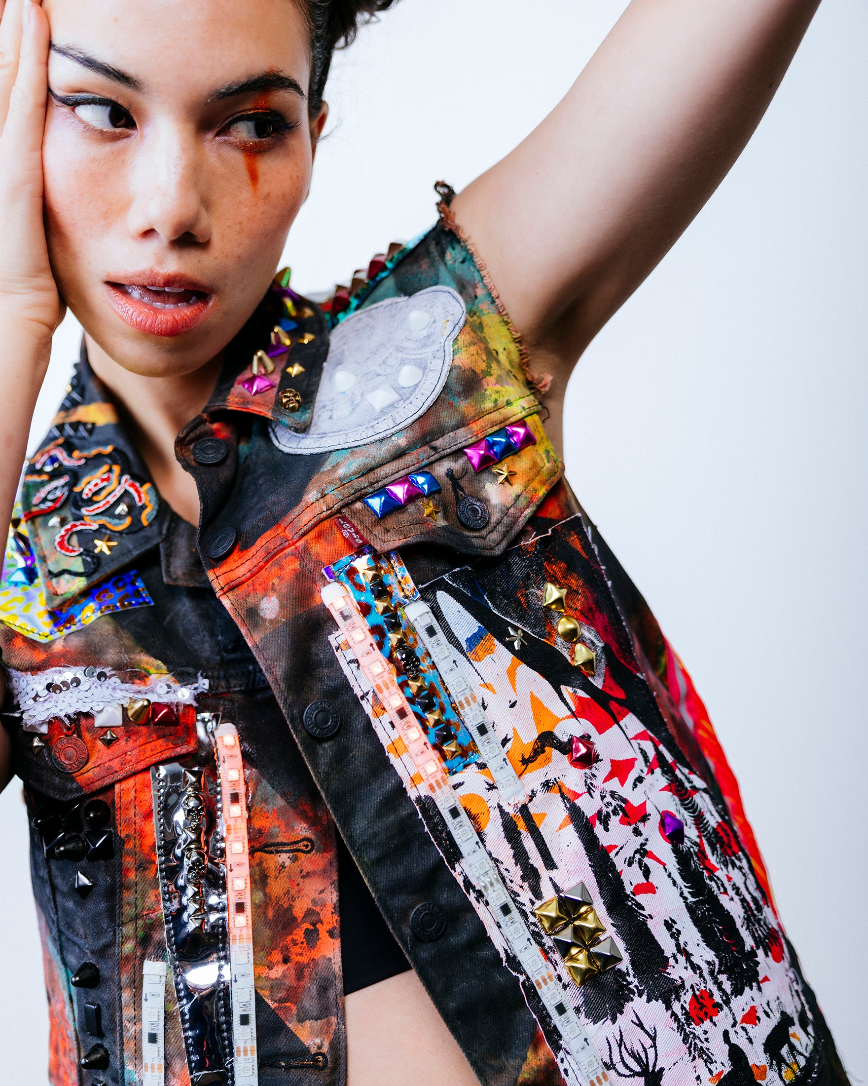 The left shoulder reveals a studded sun-chrome overlay. Moving down to a monochromatic white on white studded overlay. The left front side is a hand printed multicolored denim mural of an ancient cave painting that provides further definition and geometry for the left side LED components.