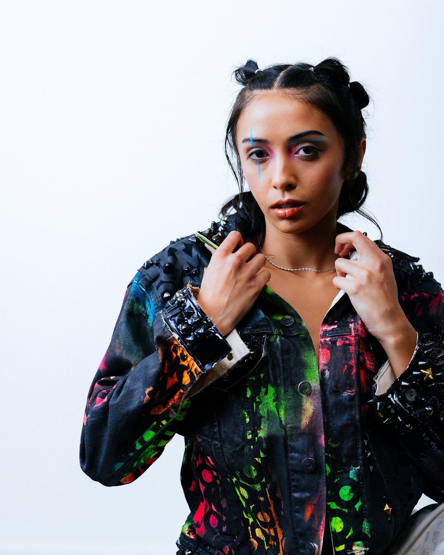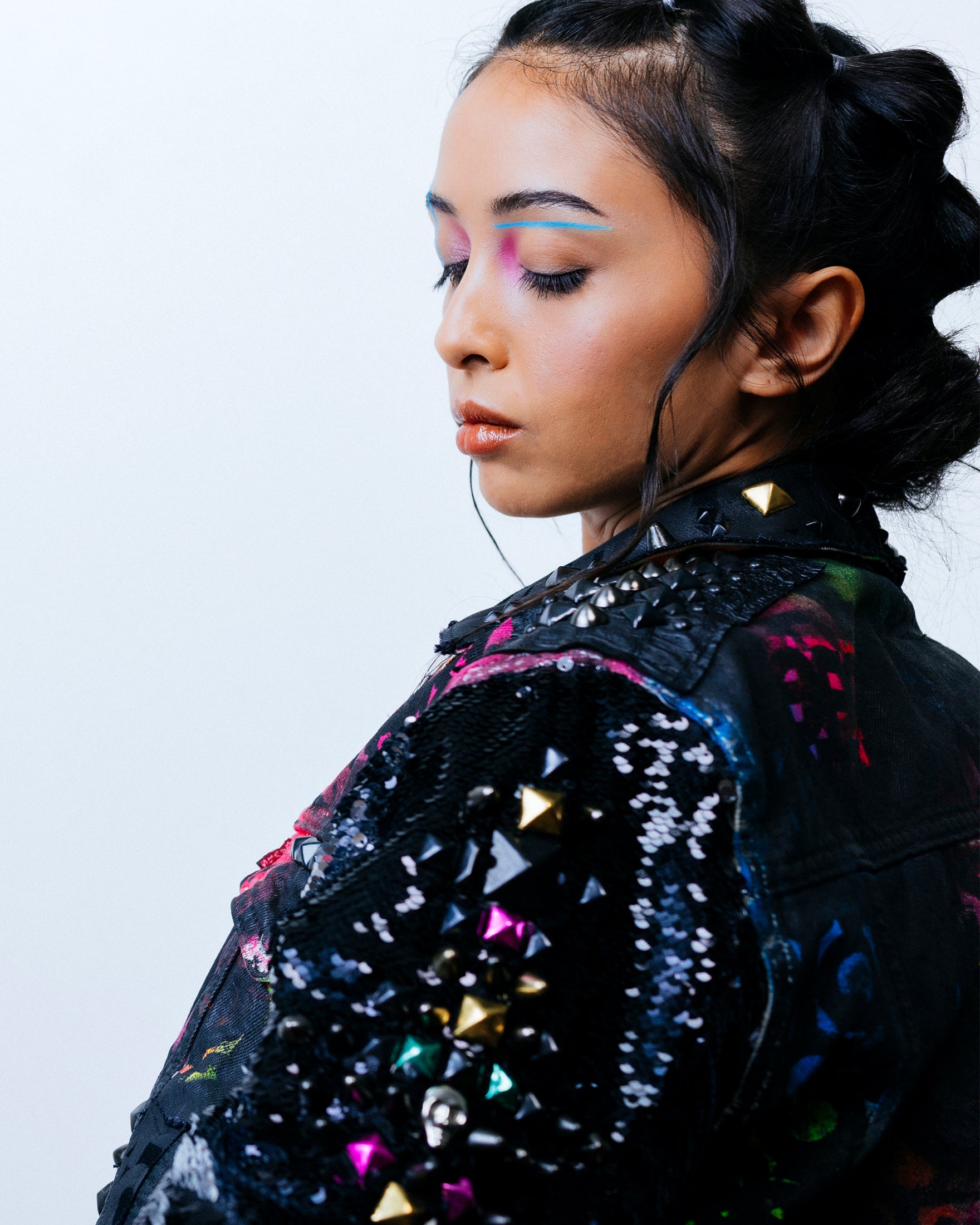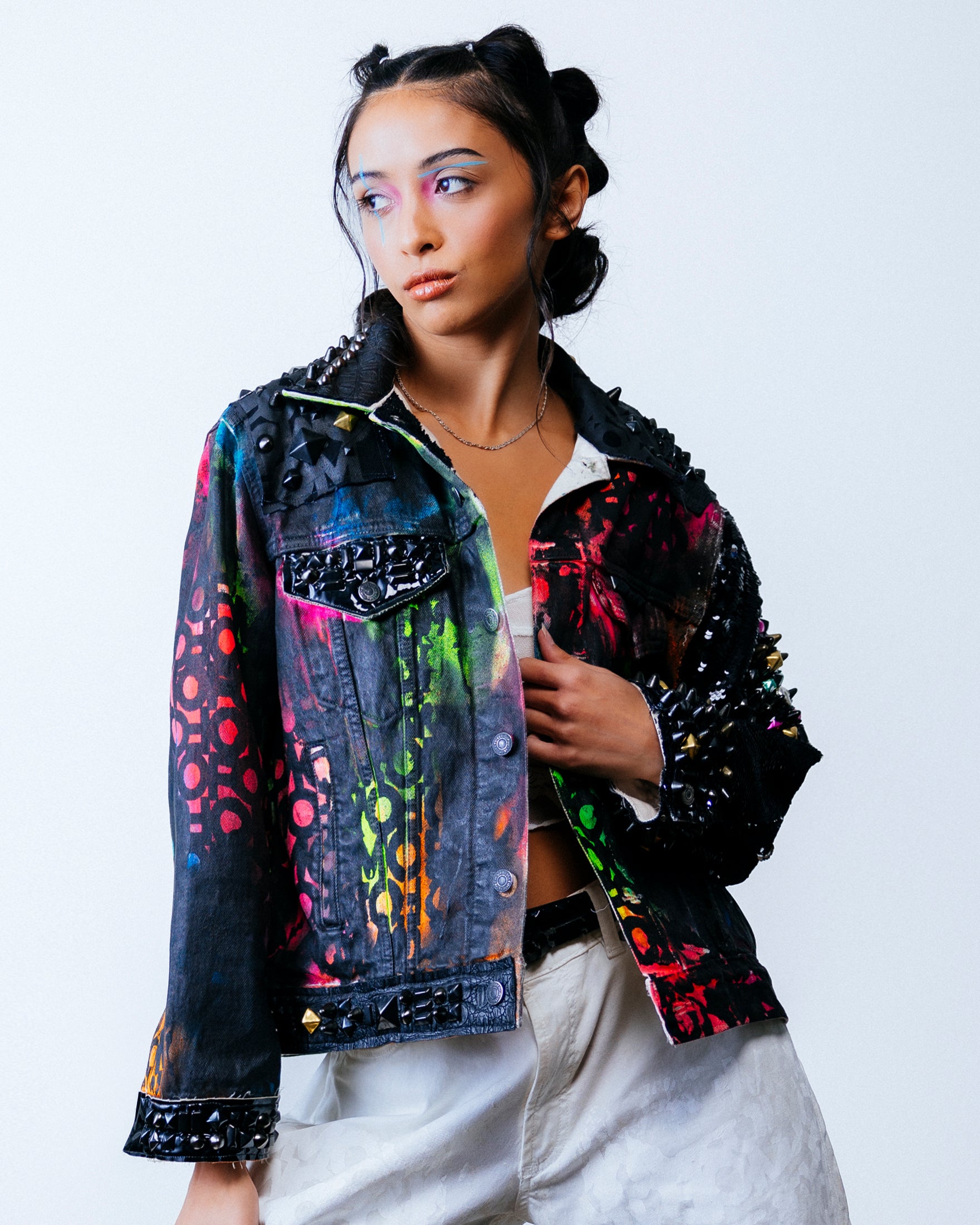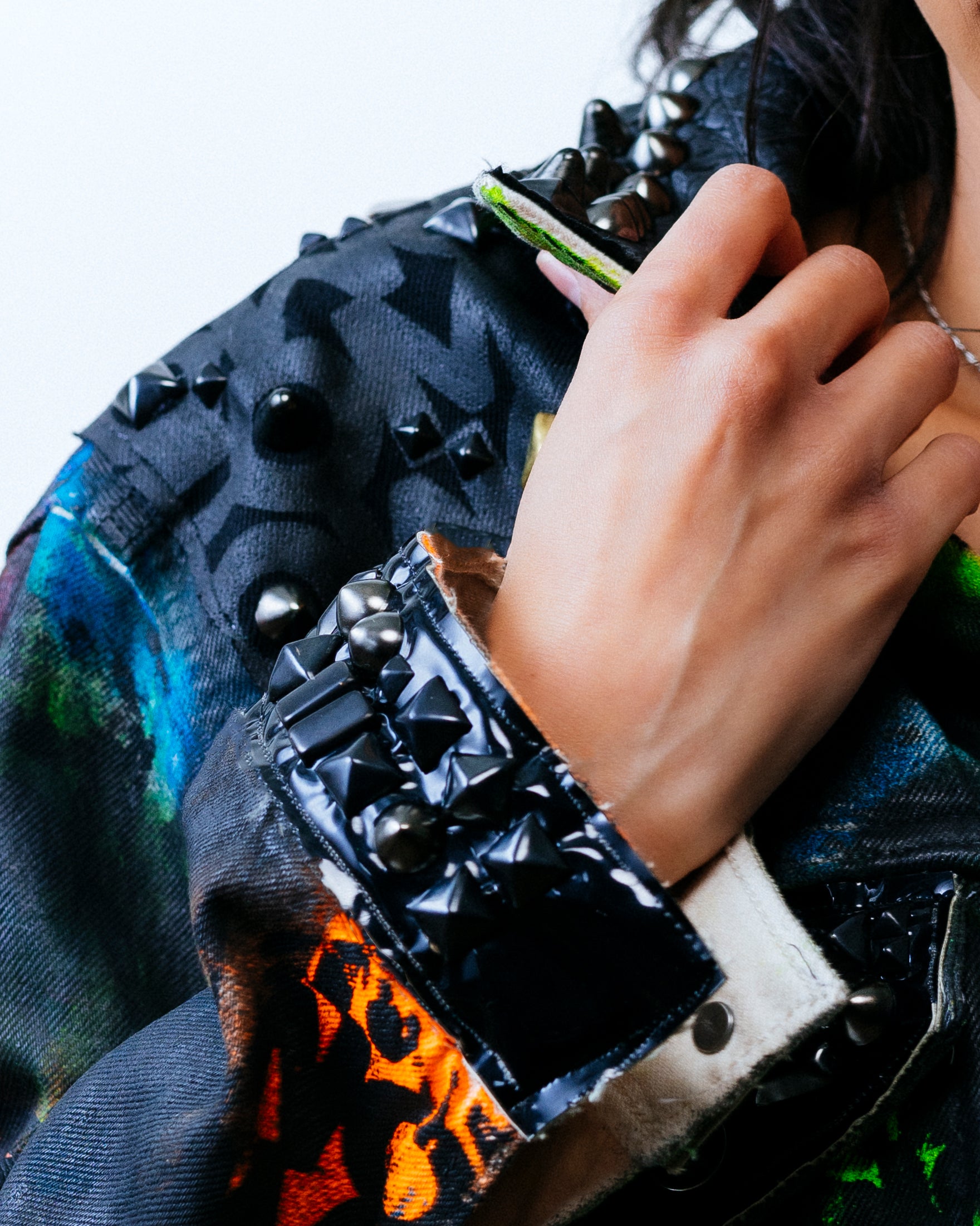 The left sleeve is adorned with black/silver 5mm flip sequins and stud detailing. Stud detailing continues on the cuffs, and on overlays on pockets and shoulders. The collar showcases a distinctive split design, featuring studded black croc vinyl on one side and black FOMO-printed denim on the other.